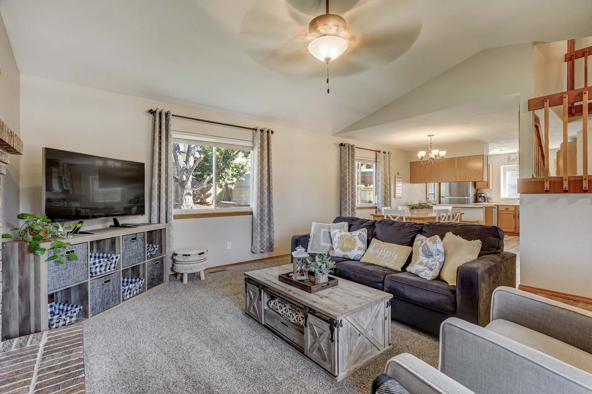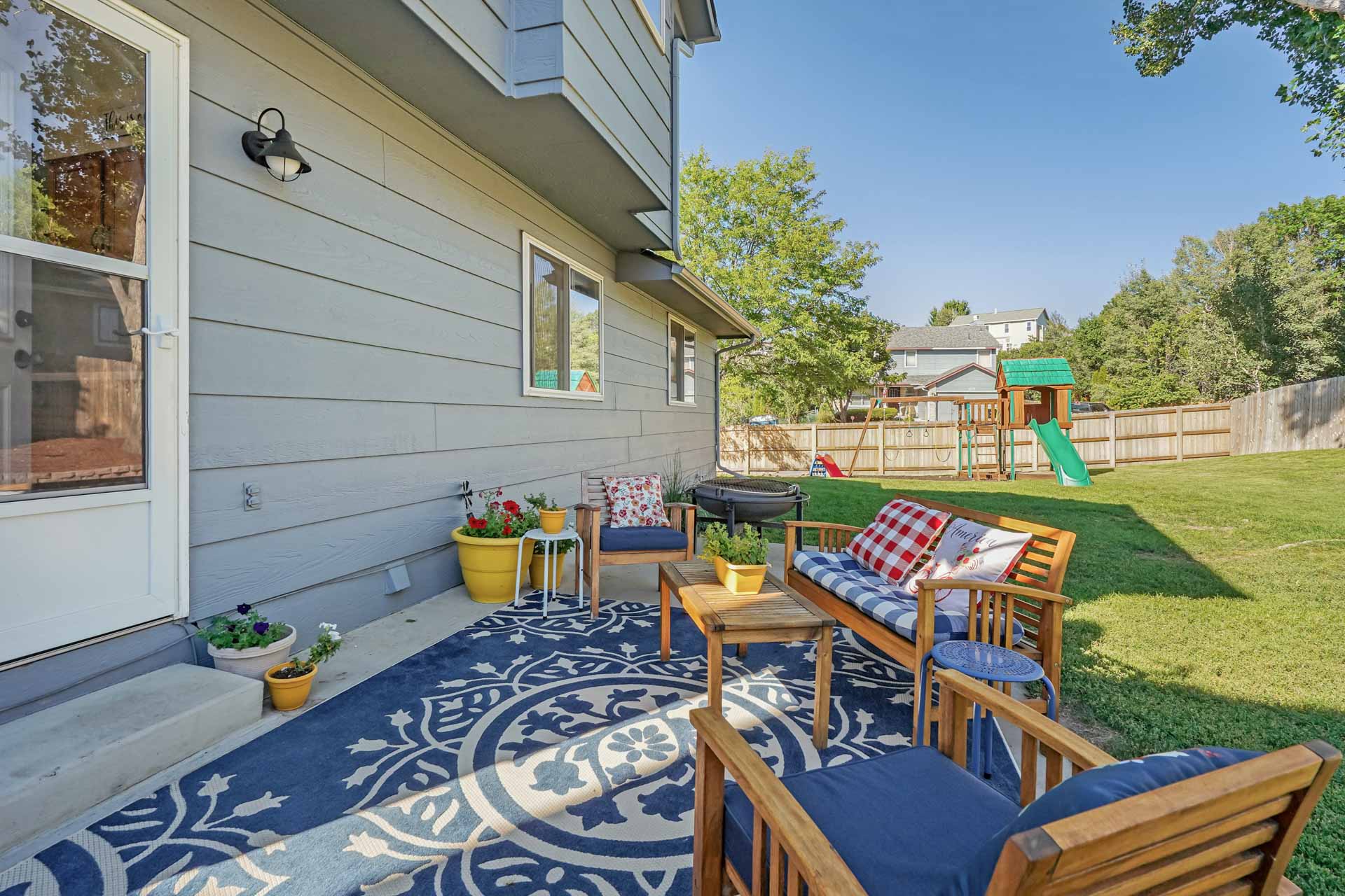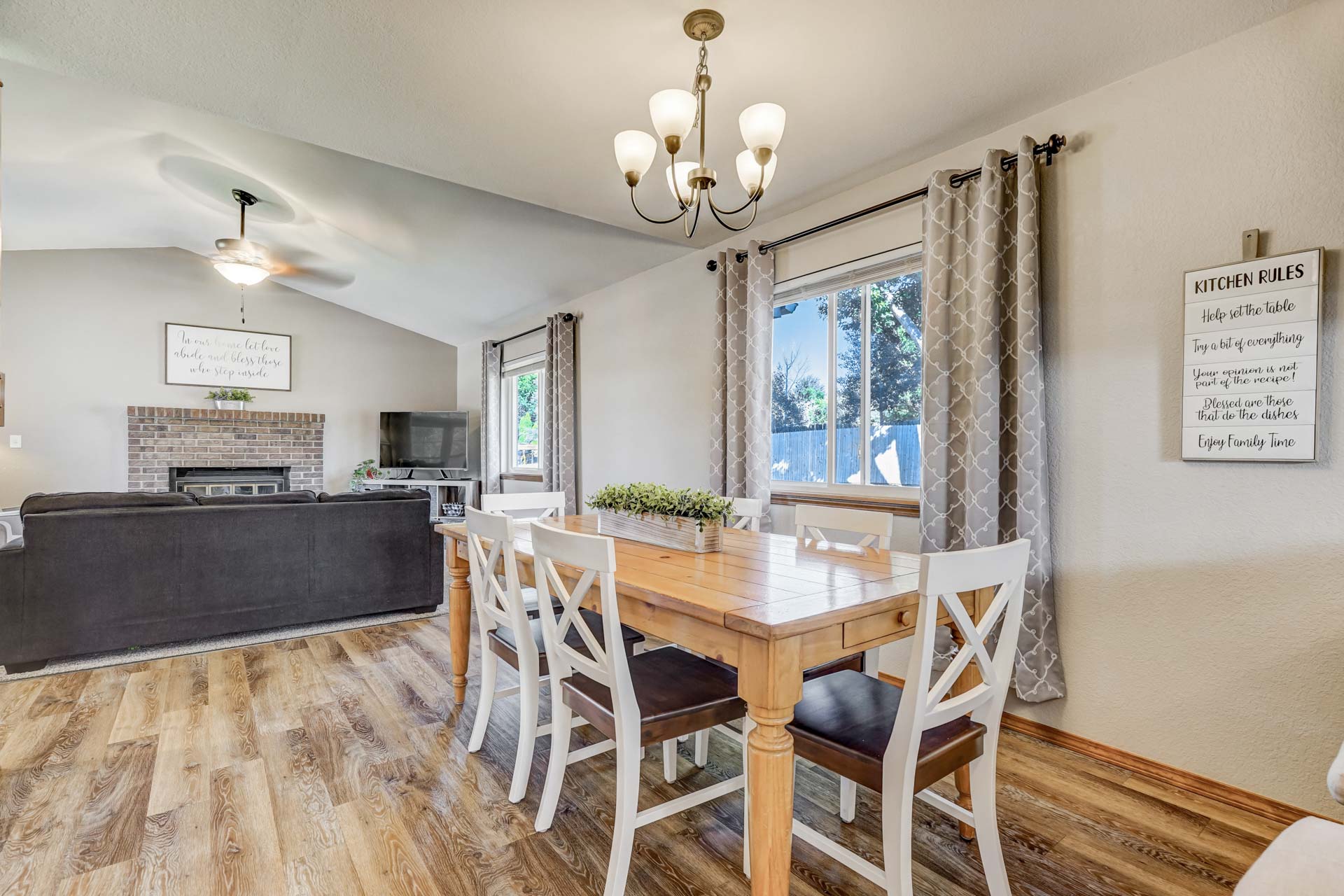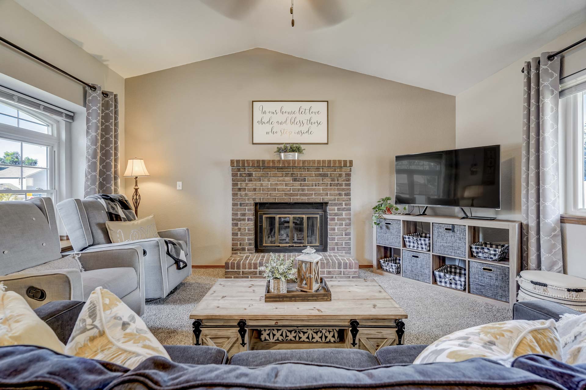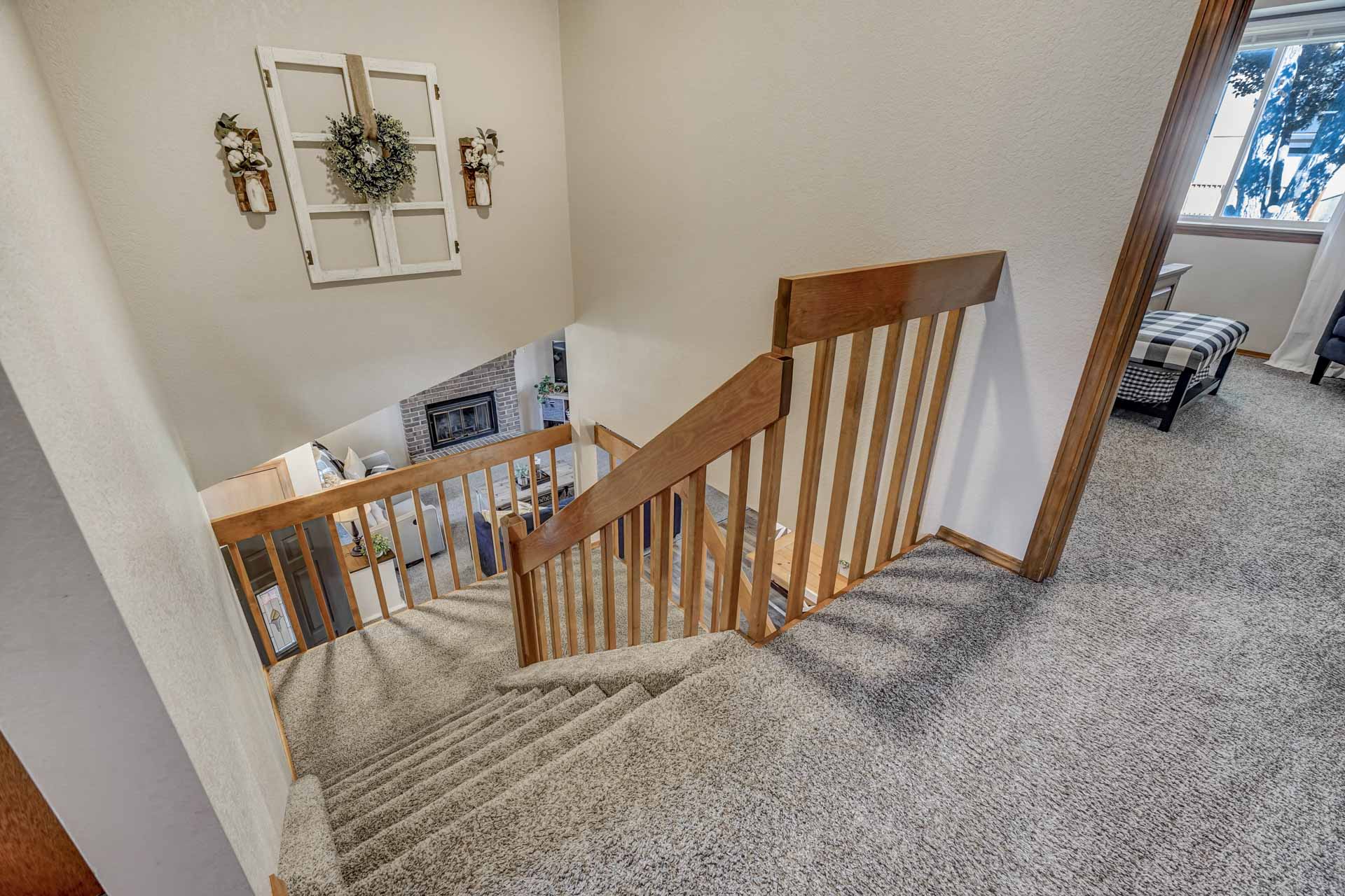 Updated 2-story home with modern finishes. Offering a large yard on a cul-de-sac, surrounded by comfort & convenience. Located in the desirable Northwind neighborhood w/easy access to schools, shopping, entertainment, Cottonwood Creek Park/trails, & main roads. As you enter updated luxury vinyl plank wood floors greet you and flow throughout the main level. The great room draws you in boasting vaulted ceilings, wood burning fireplace w/ brick surround & large windows letting the natural light pour in illuminating the open space. The dining space has newer chandelier and can accommodate a large table for those formal occasions. The nearby updated kitchen opens to the great room creating the perfect layout to entertain friends & family. Featuring solid wood cabinets w/ oil bronzed hardware, expansive peninsula w/breakfast bar, modern pendant lighting, & stainless-steel appliances. From here step out to the incredible fenced backyard, w/ concrete patio, mature trees, storage shed, garden beds & more. Completing the main level is the laundry room w/ updated ½ bath boasting decorative wall and custom shelf. Head upstairs to the primary bedroom boasting sitting area, vaulted ceilings, walk-in closet & updated private 3/4 bath w/floor to ceiling tile, LVP flooring, custom mirror, new lighting & hardware. 2 additional upper bedrooms both have ceiling fans plush carpet & easy access to hall full bath w/new lighting, newer lvp floor & tile tub/shower surround. Downstairs the finished basement presents an open family room or 4th bedroom w/ newer carpet, new LED lighting &, walk-in closet/storage room. Bonus: modern paint colors, energy efficient vinyl windows, & more. See it today!