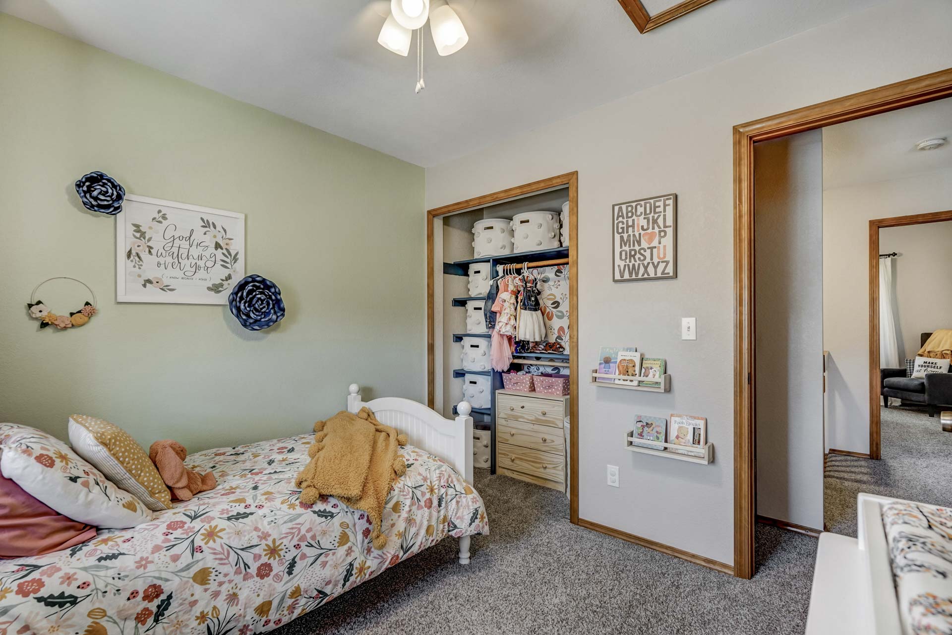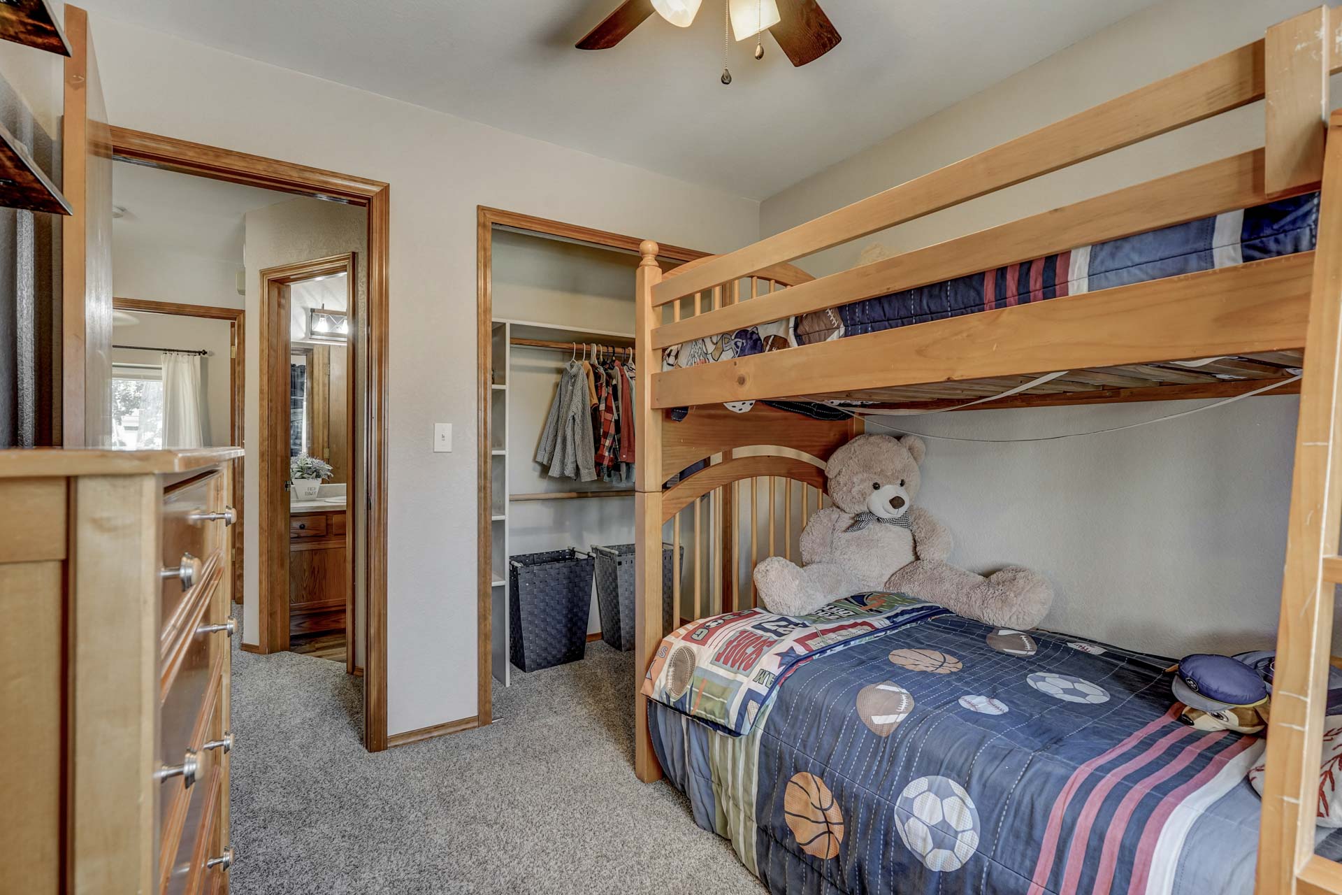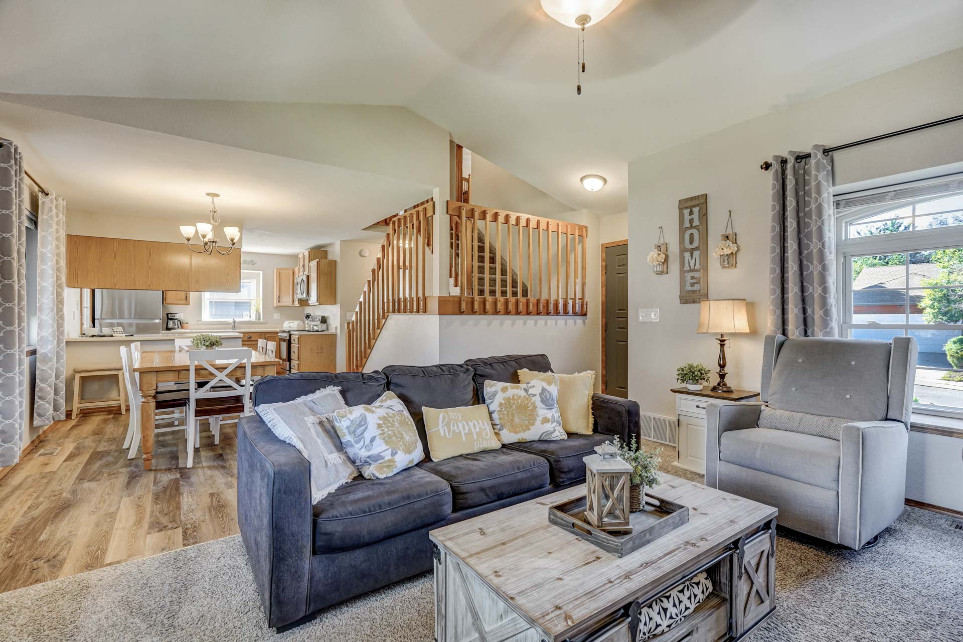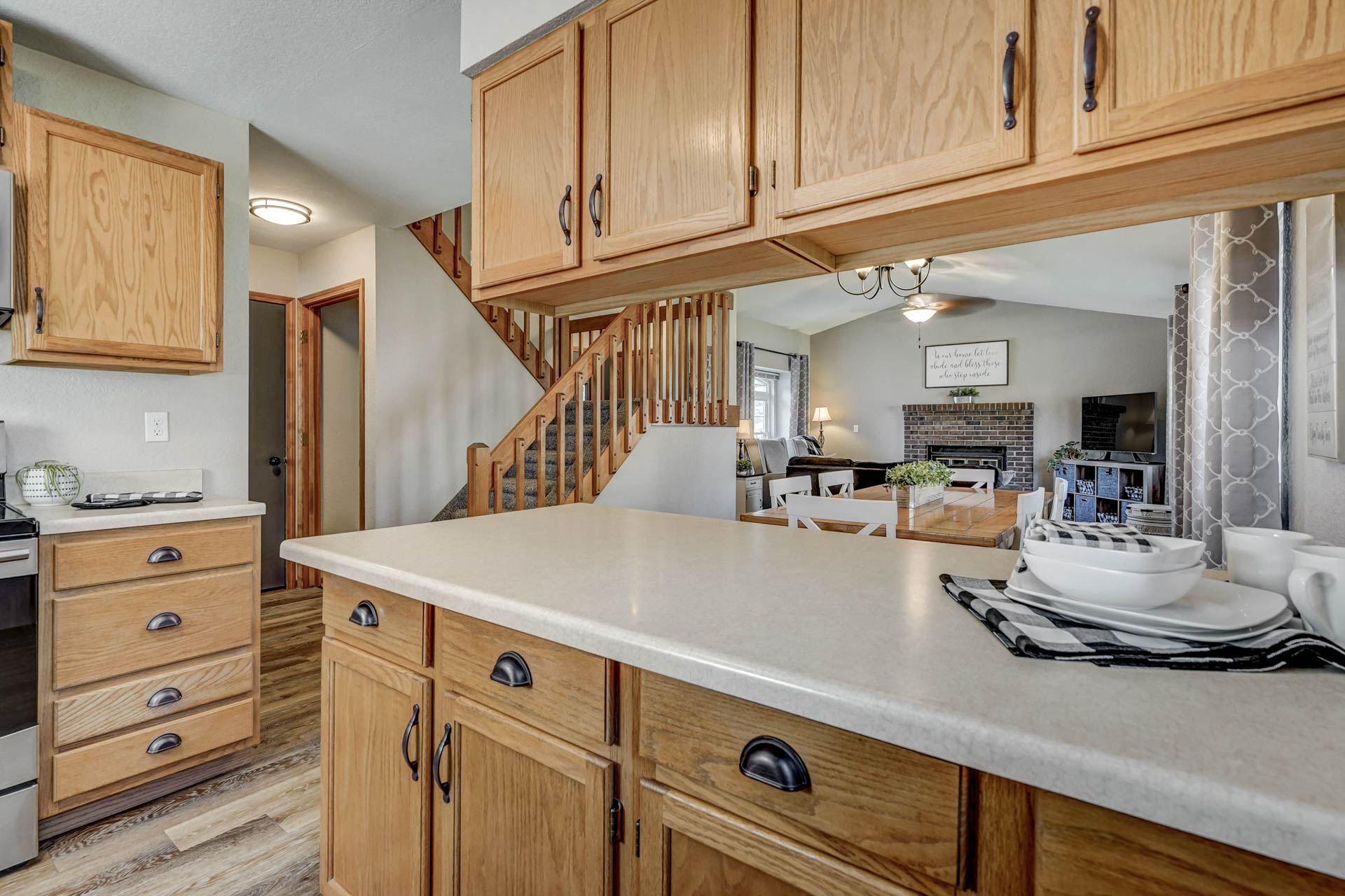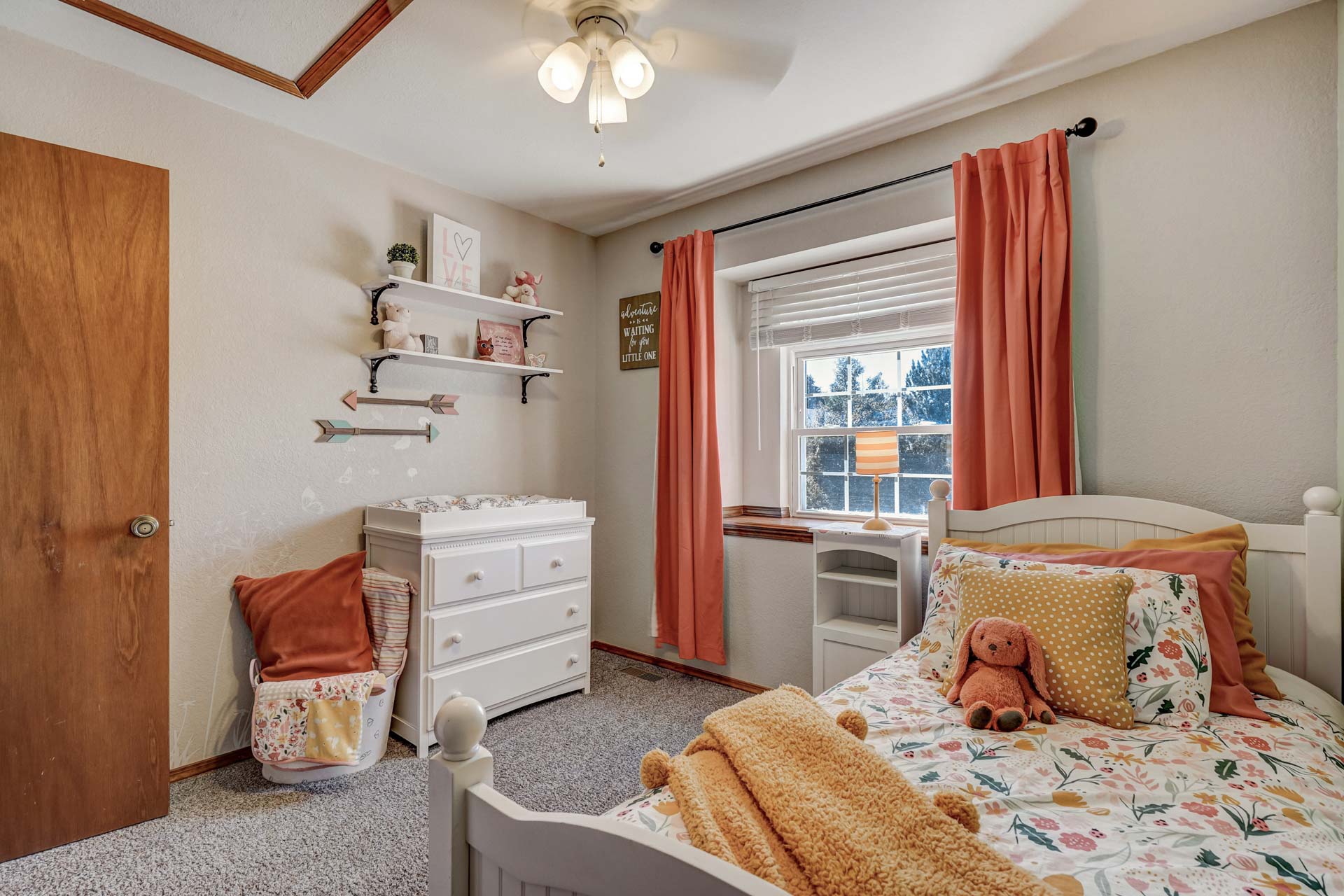 Updated 2-story home with modern finishes. Offering a large yard on a cul-de-sac, surrounded by comfort & convenience. Located in the desirable Northwind neighborhood w/easy access to schools, shopping, entertainment, Cottonwood Creek Park/trails, & main roads. As you enter updated luxury vinyl plank wood floors greet you and flow throughout the main level. The great room draws you in boasting vaulted ceilings, wood burning fireplace w/ brick surround & large windows letting the natural light pour in illuminating the open space. The dining space has newer chandelier and can accommodate a large table for those formal occasions. The nearby updated kitchen opens to the great room creating the perfect layout to entertain friends & family. Featuring solid wood cabinets w/ oil bronzed hardware, expansive peninsula w/breakfast bar, modern pendant lighting, & stainless-steel appliances. From here step out to the incredible fenced backyard, w/ concrete patio, mature trees, storage shed, garden beds & more. Completing the main level is the laundry room w/ updated ½ bath boasting decorative wall and custom shelf. Head upstairs to the primary bedroom boasting sitting area, vaulted ceilings, walk-in closet & updated private 3/4 bath w/floor to ceiling tile, LVP flooring, custom mirror, new lighting & hardware. 2 additional upper bedrooms both have ceiling fans plush carpet & easy access to hall full bath w/new lighting, newer lvp floor & tile tub/shower surround. Downstairs the finished basement presents an open family room or 4th bedroom w/ newer carpet, new LED lighting &, walk-in closet/storage room. Bonus: modern paint colors, energy efficient vinyl windows, & more. See it today!