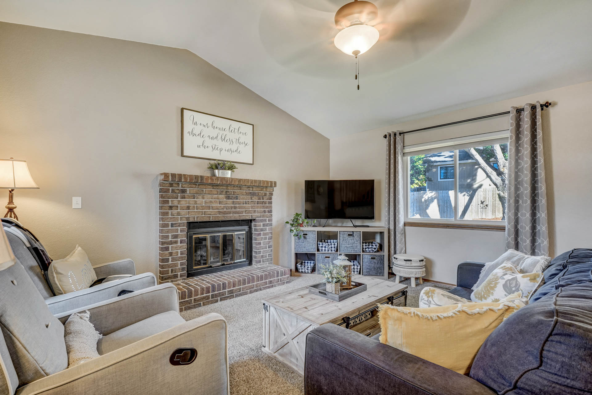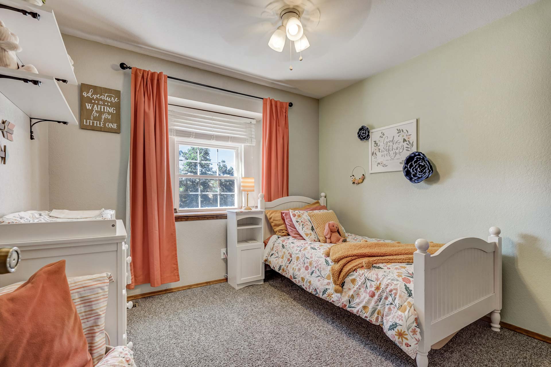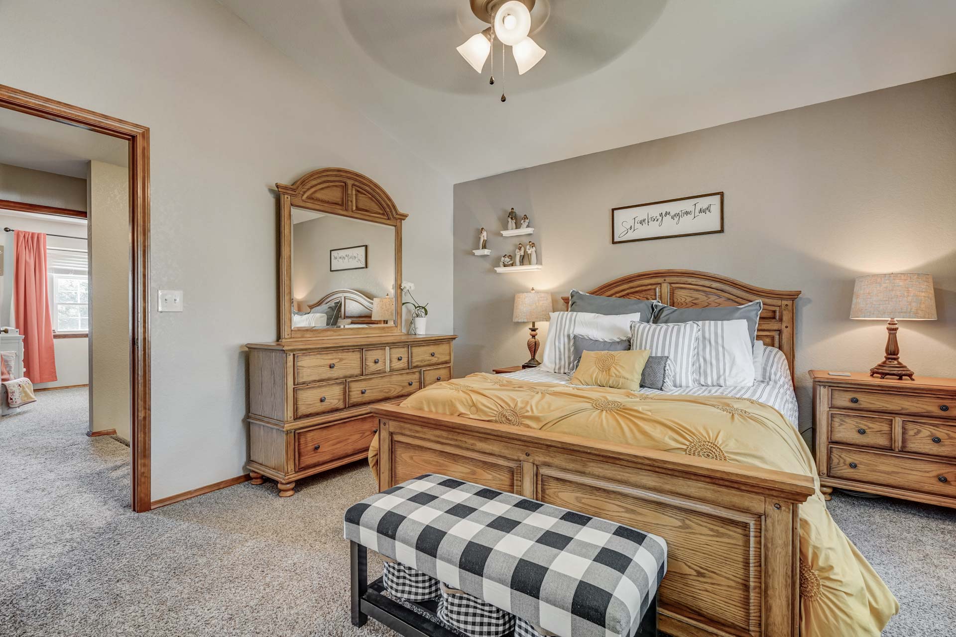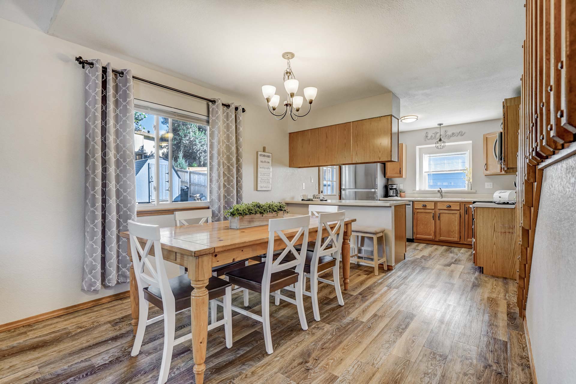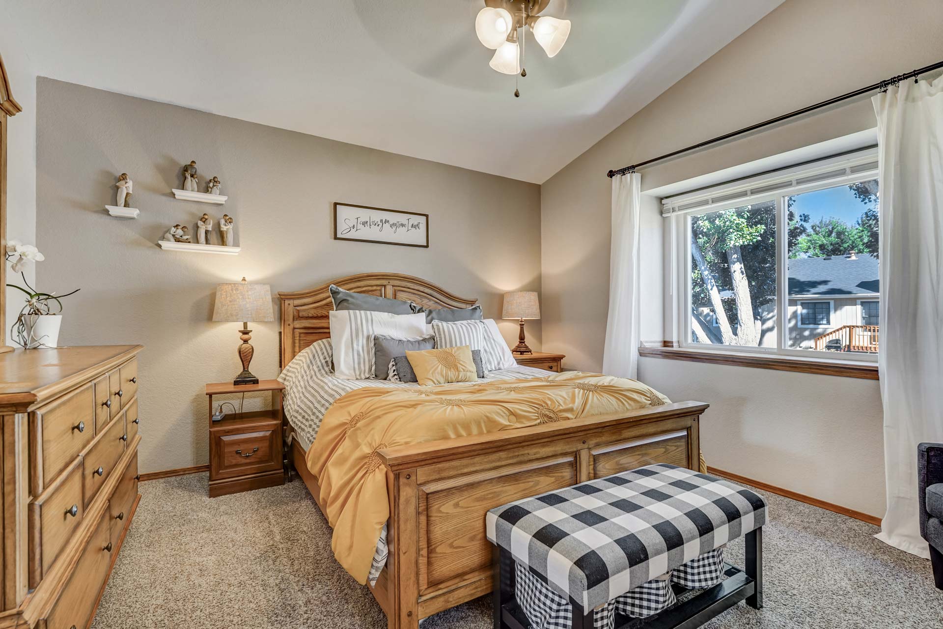 Updated 2-story home with modern finishes. Offering a large yard on a cul-de-sac, surrounded by comfort & convenience. Located in the desirable Northwind neighborhood w/easy access to schools, shopping, entertainment, Cottonwood Creek Park/trails, & main roads. As you enter updated luxury vinyl plank wood floors greet you and flow throughout the main level. The great room draws you in boasting vaulted ceilings, wood burning fireplace w/ brick surround & large windows letting the natural light pour in illuminating the open space. The dining space has newer chandelier and can accommodate a large table for those formal occasions. The nearby updated kitchen opens to the great room creating the perfect layout to entertain friends & family. Featuring solid wood cabinets w/ oil bronzed hardware, expansive peninsula w/breakfast bar, modern pendant lighting, & stainless-steel appliances. From here step out to the incredible fenced backyard, w/ concrete patio, mature trees, storage shed, garden beds & more. Completing the main level is the laundry room w/ updated ½ bath boasting decorative wall and custom shelf. Head upstairs to the primary bedroom boasting sitting area, vaulted ceilings, walk-in closet & updated private 3/4 bath w/floor to ceiling tile, LVP flooring, custom mirror, new lighting & hardware. 2 additional upper bedrooms both have ceiling fans plush carpet & easy access to hall full bath w/new lighting, newer lvp floor & tile tub/shower surround. Downstairs the finished basement presents an open family room or 4th bedroom w/ newer carpet, new LED lighting &, walk-in closet/storage room. Bonus: modern paint colors, energy efficient vinyl windows, & more. See it today!