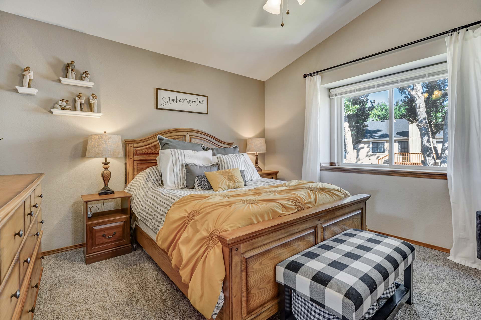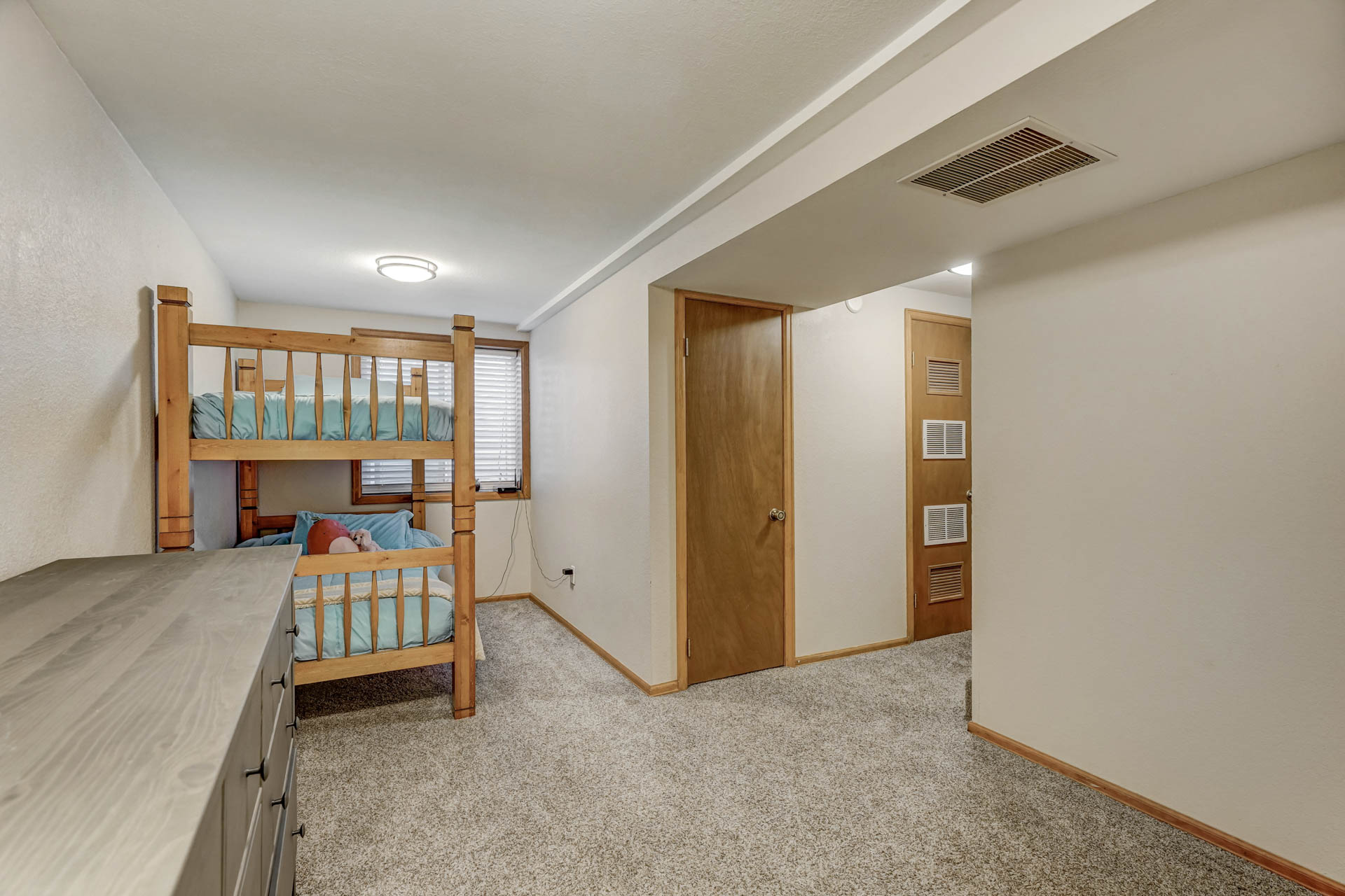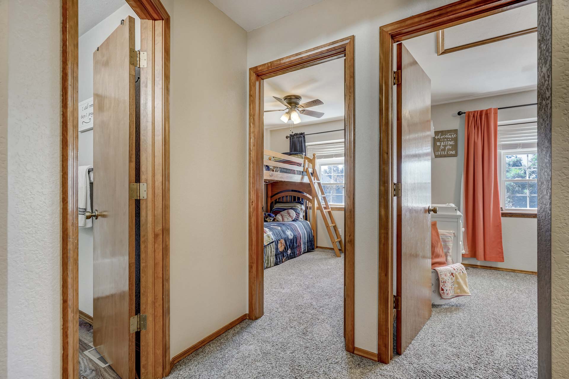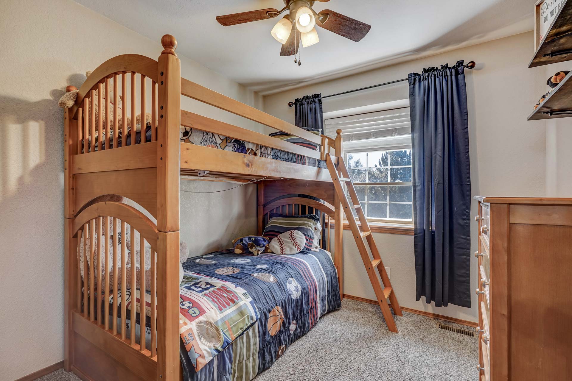 Updated 2-story home with modern finishes. Offering a large yard on a cul-de-sac, surrounded by comfort & convenience. Located in the desirable Northwind neighborhood w/easy access to schools, shopping, entertainment, Cottonwood Creek Park/trails, & main roads. As you enter updated luxury vinyl plank wood floors greet you and flow throughout the main level. The great room draws you in boasting vaulted ceilings, wood burning fireplace w/ brick surround & large windows letting the natural light pour in illuminating the open space. The dining space has newer chandelier and can accommodate a large table for those formal occasions. The nearby updated kitchen opens to the great room creating the perfect layout to entertain friends & family. Featuring solid wood cabinets w/ oil bronzed hardware, expansive peninsula w/breakfast bar, modern pendant lighting, & stainless-steel appliances. From here step out to the incredible fenced backyard, w/ concrete patio, mature trees, storage shed, garden beds & more. Completing the main level is the laundry room w/ updated ½ bath boasting decorative wall and custom shelf. Head upstairs to the primary bedroom boasting sitting area, vaulted ceilings, walk-in closet & updated private 3/4 bath w/floor to ceiling tile, LVP flooring, custom mirror, new lighting & hardware. 2 additional upper bedrooms both have ceiling fans plush carpet & easy access to hall full bath w/new lighting, newer lvp floor & tile tub/shower surround. Downstairs the finished basement presents an open family room or 4th bedroom w/ newer carpet, new LED lighting &, walk-in closet/storage room. Bonus: modern paint colors, energy efficient vinyl windows, & more. See it today!