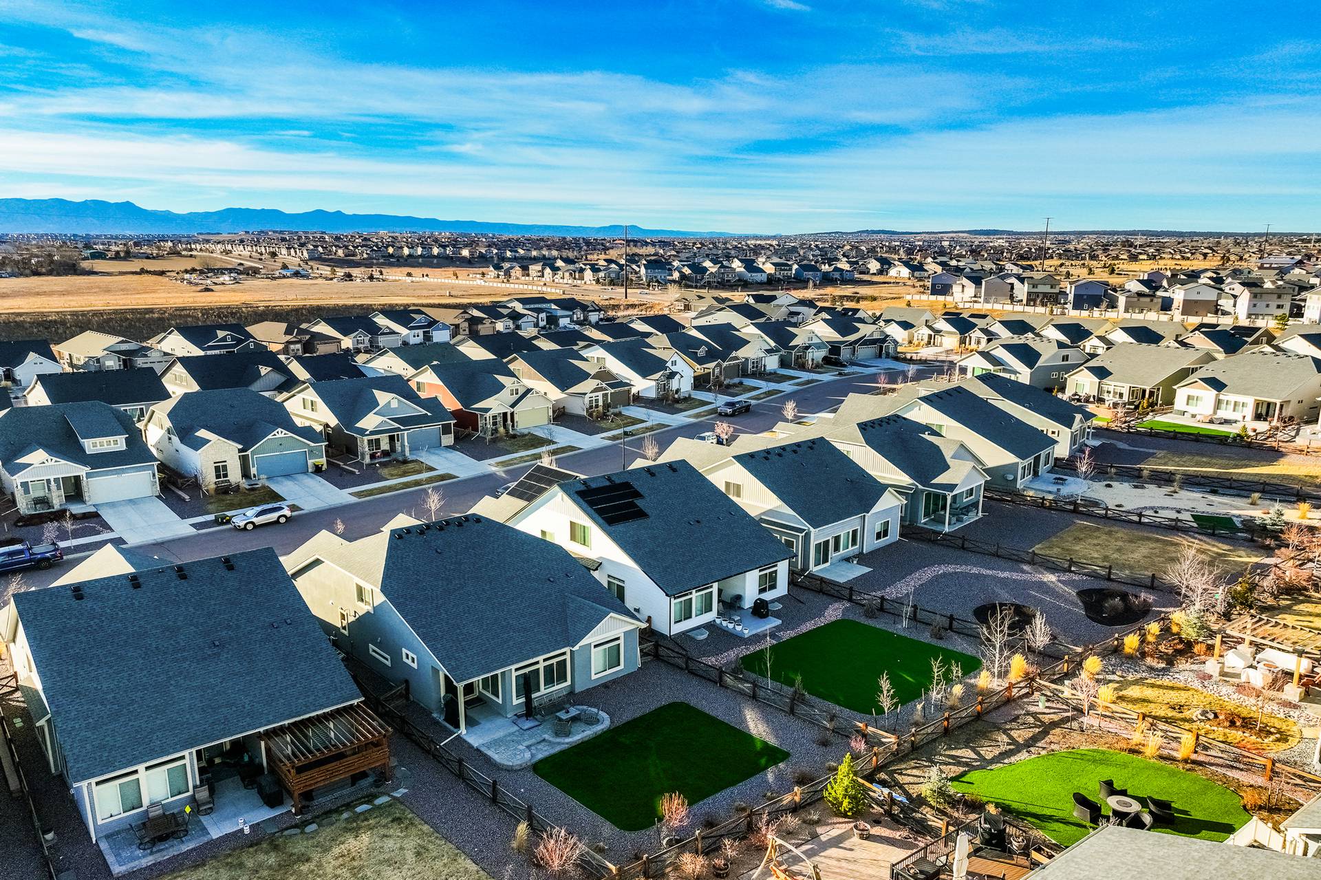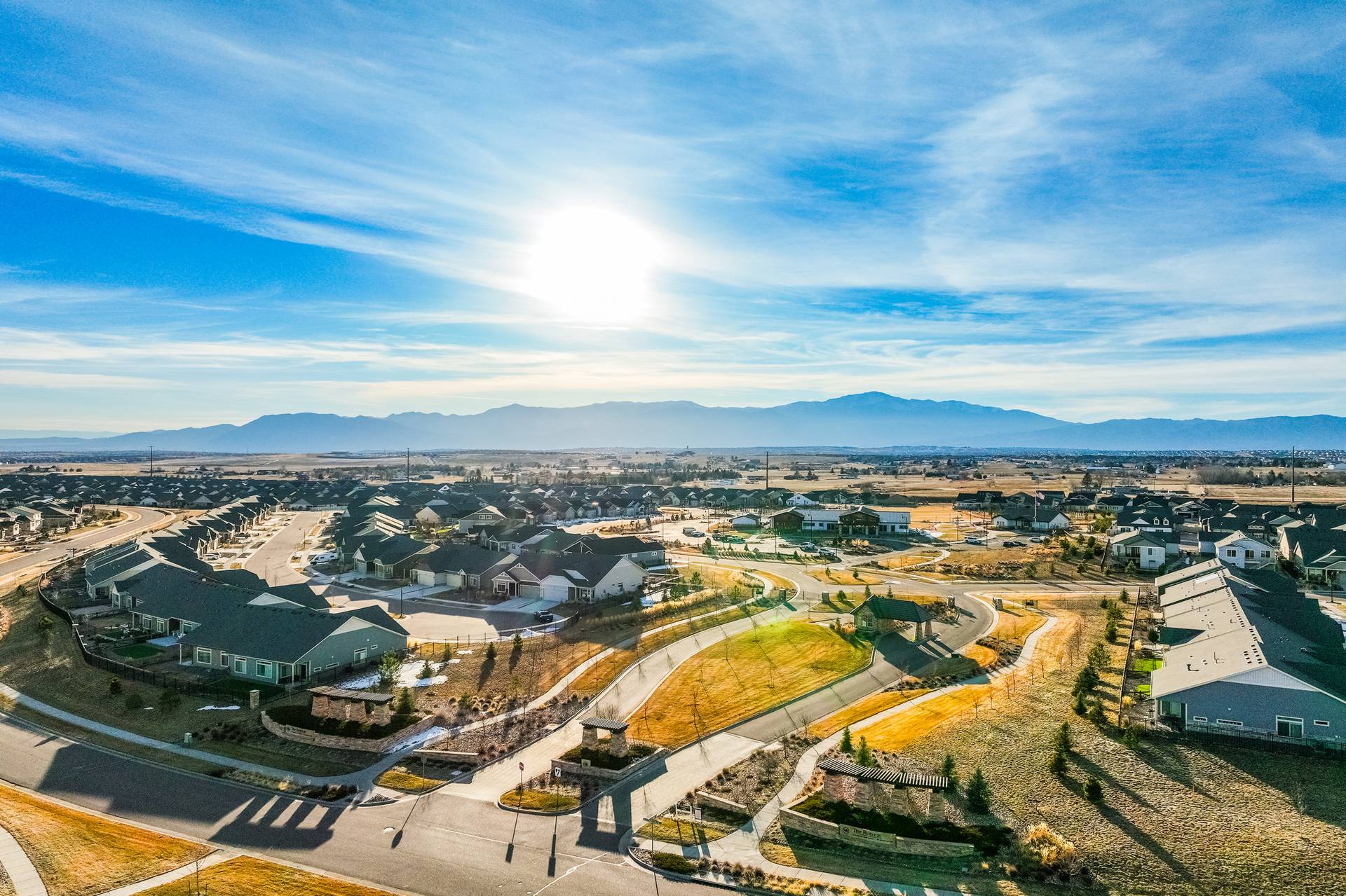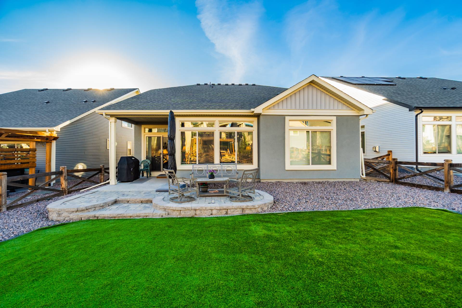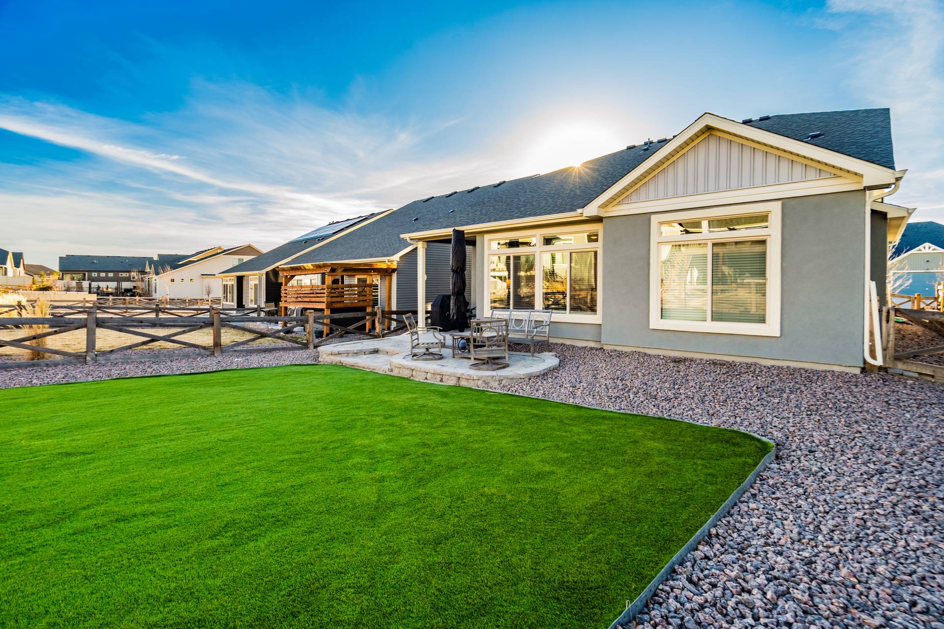 Beautifully upgraded two-story home located in The Retreat, a gated 55+ community within Banning Lewis Ranch, where thoughtful design meets effortless, low-maintenance living. Impeccably maintained, this 3-bedroom, 3-bathroom residence offers the ease of main-level living with modern finishes throughout. The inviting stucco exterior sets the tone as you arrive, while inside you’ll find luxury vinyl plank flooring throughout an open-concept layout that seamlessly connects the living room, dining area, and kitchen—perfect for both everyday living and entertaining. The kitchen is a true centerpiece, featuring a large island, quartz countertops, a walk-in pantry, stainless steel appliances, and gas range. The spacious main-level primary suite boasts elegant coffered ceilings and an en-suite bathroom with a curbless walk-in shower, double vanity, and walk-in closet. A secondary bedroom with its own walk-in closet, a dedicated office or study, and laundry room with extra cabinetry complete the main floor, offering exceptional functionality and storage. Upstairs, you’ll find an additional bedroom with a walk-in closet, a full bathroom, and an oversized loft—providing flex space for a media room, or play area. The fully finished garage features epoxy floors, a bike mount, workbench, additional cabinets/outlets, and even a conveniently located hose bib. Step outside to enjoy the extended patio and covered porch with a gas hardline—perfect for grilling and outdoor entertaining. The backyard is fully fenced, landscaped, and finished with artificial turf, while the HOA handles front lawn maintenance for truly low-maintenance living. Banning Lewis Ranch provides exceptional community amenities, including a community center with events, fitness center, pool, and an extensive network of hiking & biking trails. With main-level living, modern upgrades, and resort-style amenities, this home offers comfort, convenience, and lifestyle all in one.