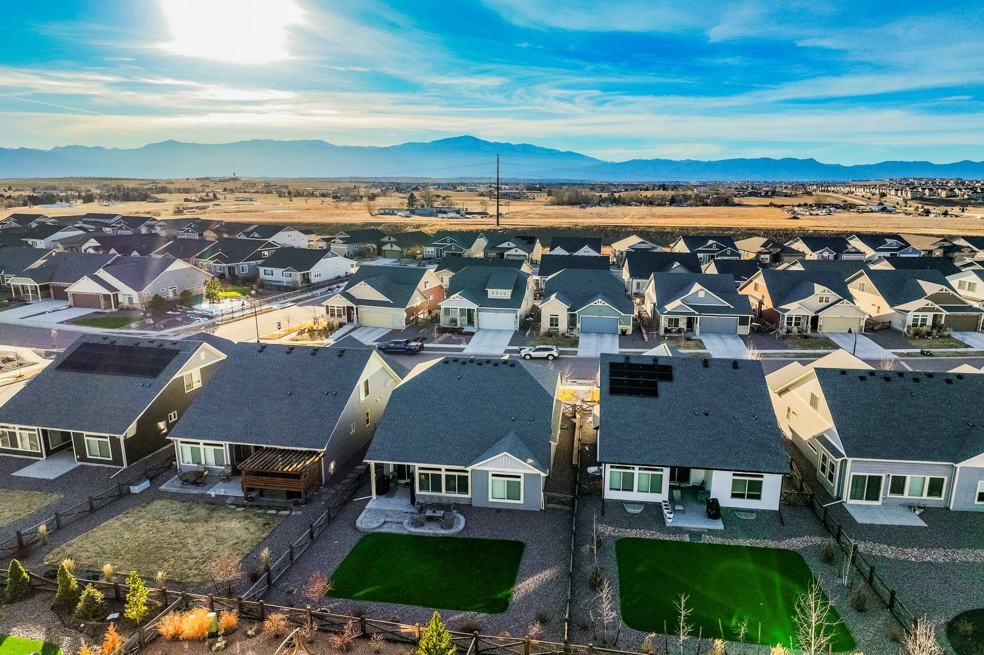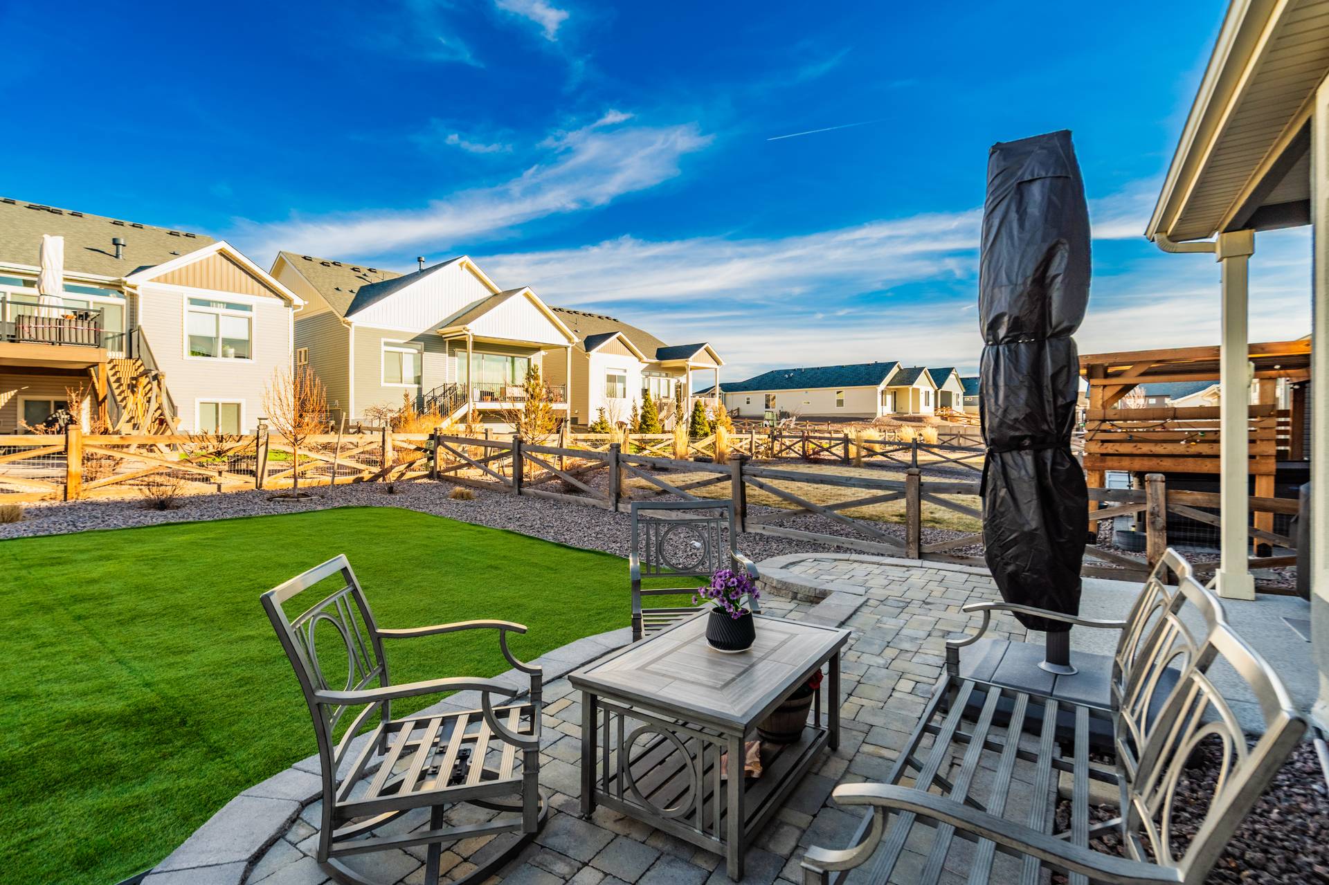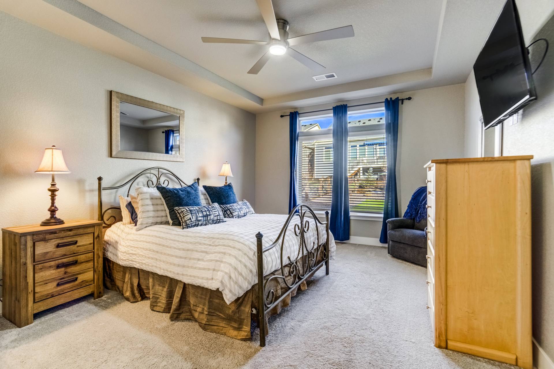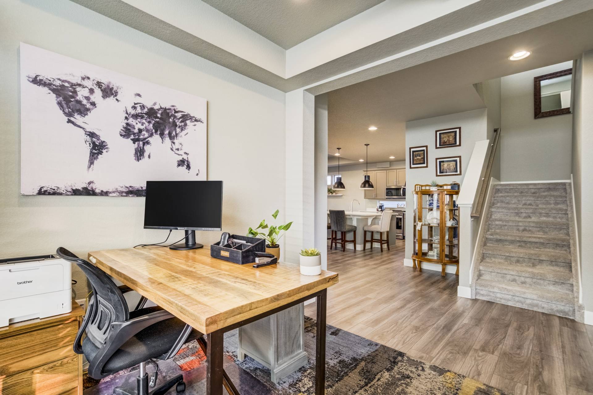 Beautifully upgraded two-story home located in The Retreat, a gated 55+ community within Banning Lewis Ranch, where thoughtful design meets effortless, low-maintenance living. Impeccably maintained, this 3-bedroom, 3-bathroom residence offers the ease of main-level living with modern finishes throughout. The inviting stucco exterior sets the tone as you arrive, while inside you’ll find luxury vinyl plank flooring throughout an open-concept layout that seamlessly connects the living room, dining area, and kitchen—perfect for both everyday living and entertaining. The kitchen is a true centerpiece, featuring a large island, quartz countertops, a walk-in pantry, stainless steel appliances, and gas range. The spacious main-level primary suite boasts elegant coffered ceilings and an en-suite bathroom with a curbless walk-in shower, double vanity, and walk-in closet. A secondary bedroom with its own walk-in closet, a dedicated office or study, and laundry room with extra cabinetry complete the main floor, offering exceptional functionality and storage. Upstairs, you’ll find an additional bedroom with a walk-in closet, a full bathroom, and an oversized loft—providing flex space for a media room, or play area. The fully finished garage features epoxy floors, a bike mount, workbench, additional cabinets/outlets, and even a conveniently located hose bib. Step outside to enjoy the extended patio and covered porch with a gas hardline—perfect for grilling and outdoor entertaining. The backyard is fully fenced, landscaped, and finished with artificial turf, while the HOA handles front lawn maintenance for truly low-maintenance living. Banning Lewis Ranch provides exceptional community amenities, including a community center with events, fitness center, pool, and an extensive network of hiking & biking trails. With main-level living, modern upgrades, and resort-style amenities, this home offers comfort, convenience, and lifestyle all in one.