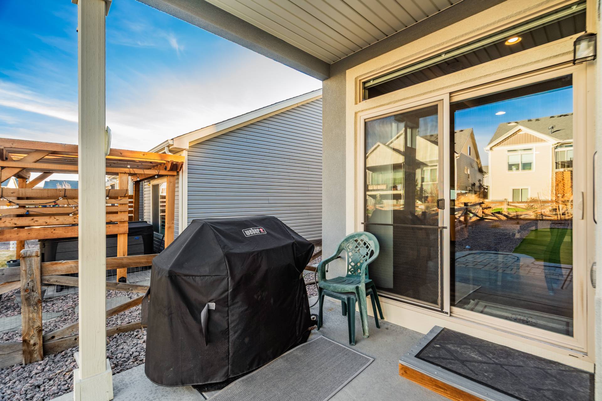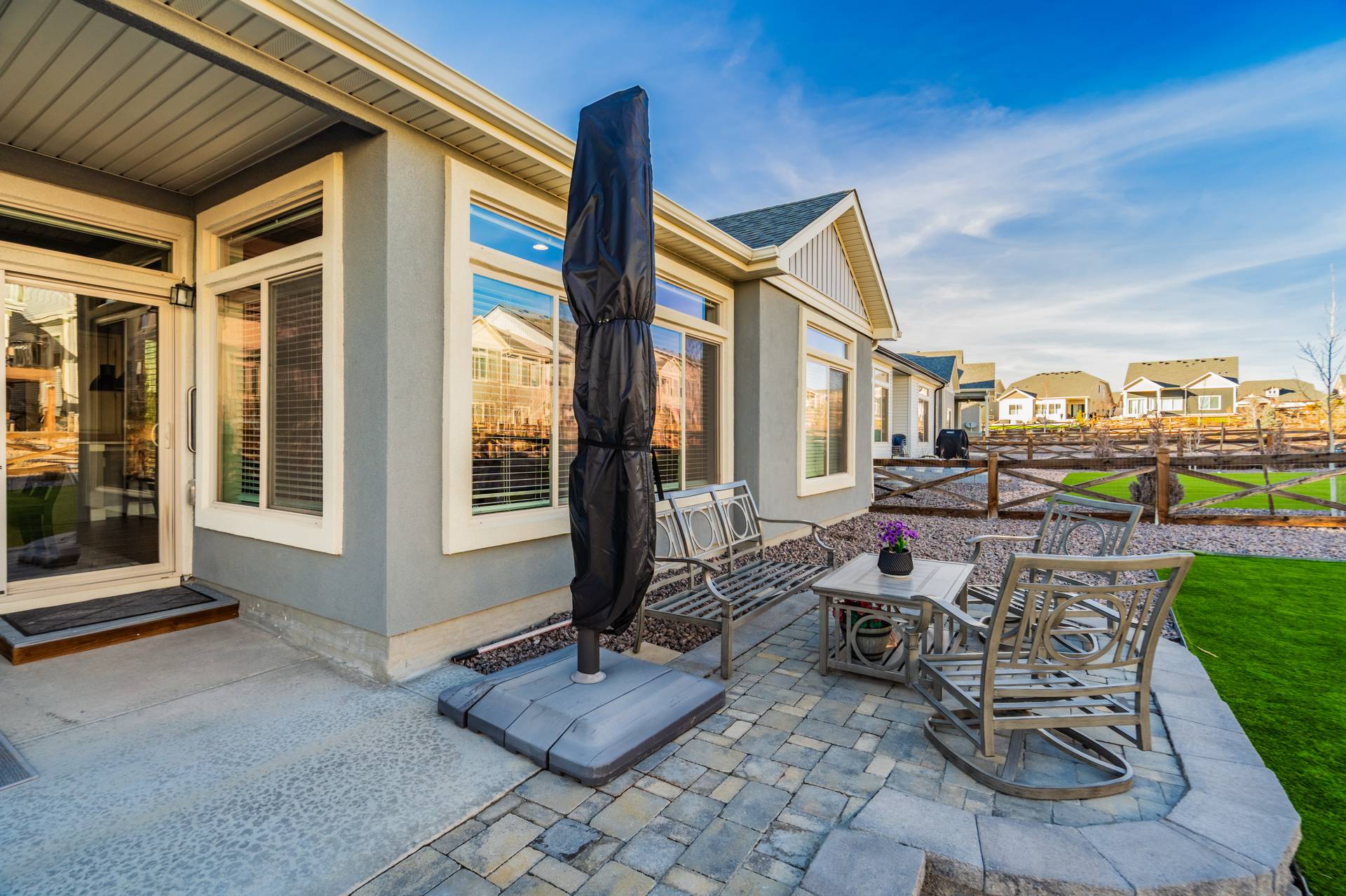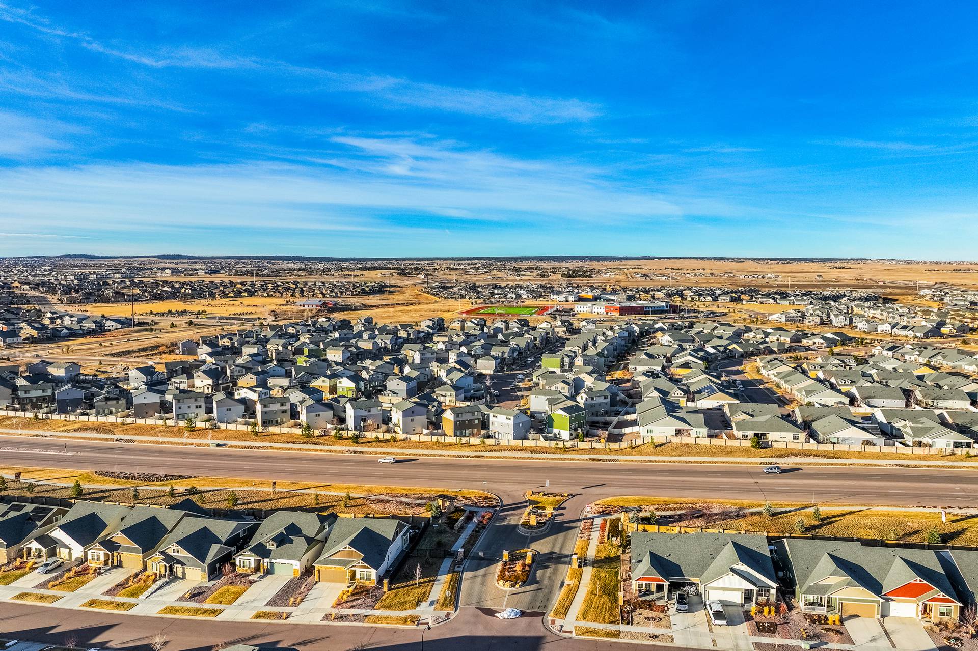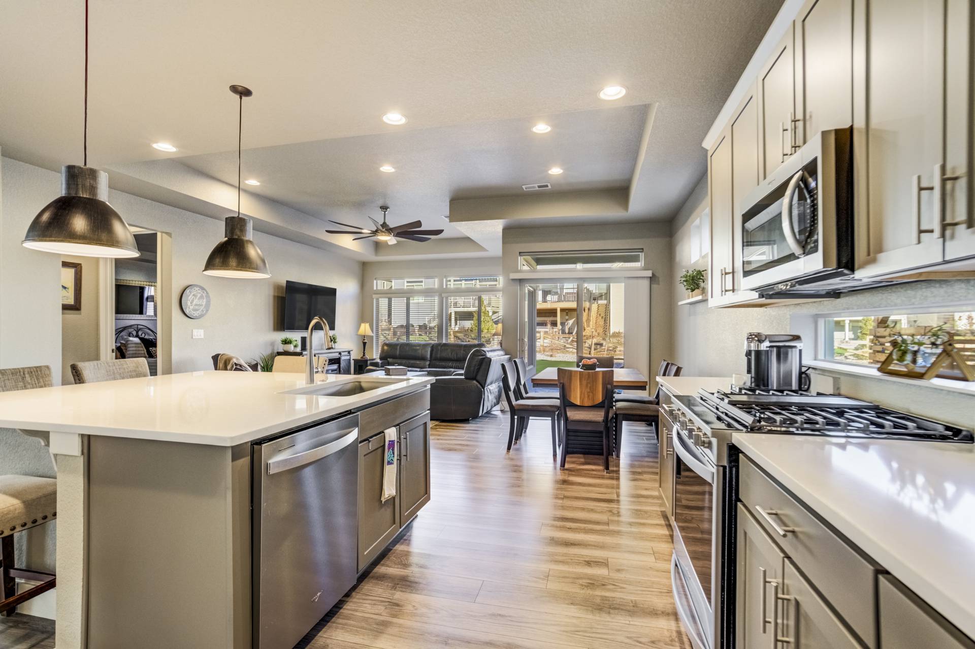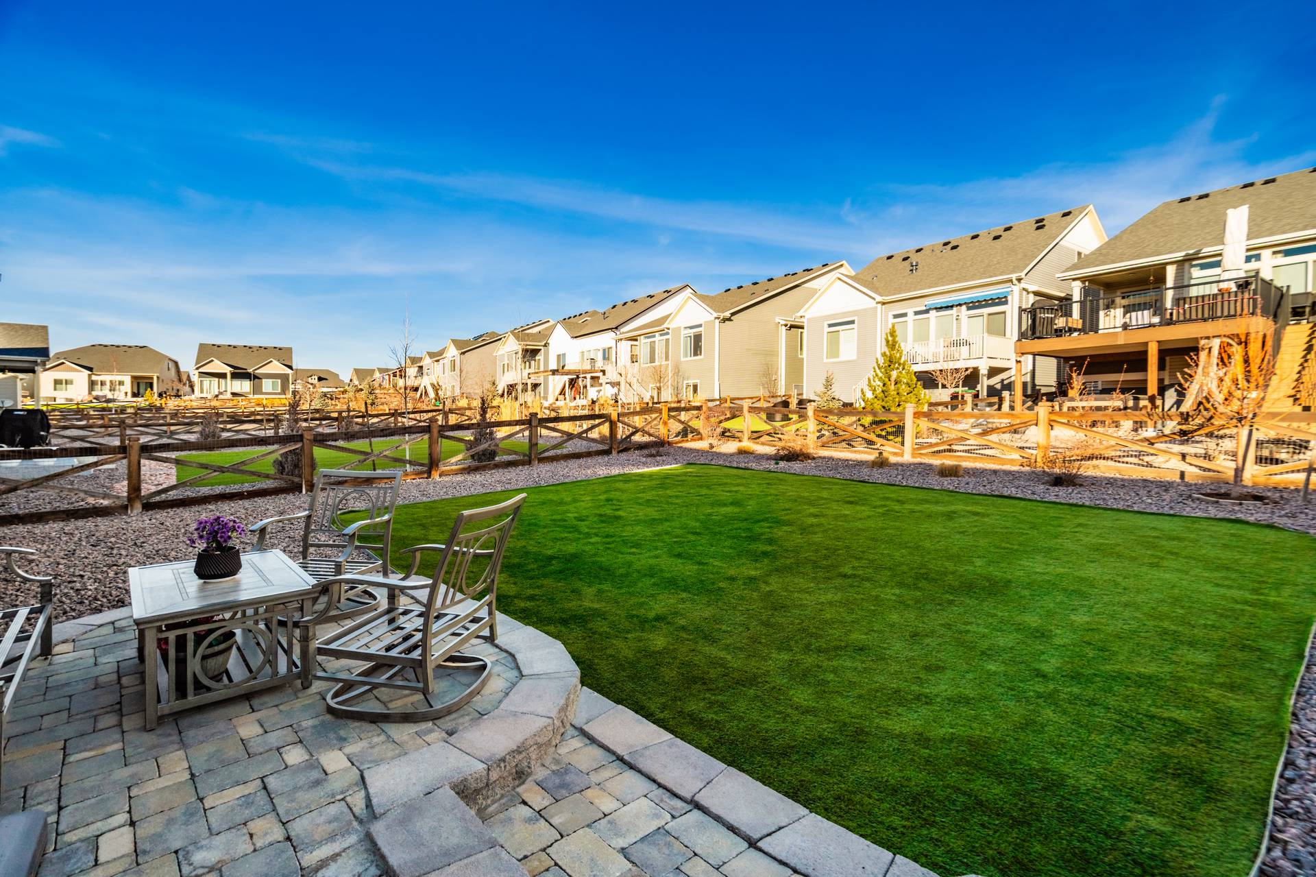 Beautifully upgraded two-story home located in The Retreat, a gated 55+ community within Banning Lewis Ranch, where thoughtful design meets effortless, low-maintenance living. Impeccably maintained, this 3-bedroom, 3-bathroom residence offers the ease of main-level living with modern finishes throughout. The inviting stucco exterior sets the tone as you arrive, while inside you’ll find luxury vinyl plank flooring throughout an open-concept layout that seamlessly connects the living room, dining area, and kitchen—perfect for both everyday living and entertaining. The kitchen is a true centerpiece, featuring a large island, quartz countertops, a walk-in pantry, stainless steel appliances, and gas range. The spacious main-level primary suite boasts elegant coffered ceilings and an en-suite bathroom with a curbless walk-in shower, double vanity, and walk-in closet. A secondary bedroom with its own walk-in closet, a dedicated office or study, and laundry room with extra cabinetry complete the main floor, offering exceptional functionality and storage. Upstairs, you’ll find an additional bedroom with a walk-in closet, a full bathroom, and an oversized loft—providing flex space for a media room, or play area. The fully finished garage features epoxy floors, a bike mount, workbench, additional cabinets/outlets, and even a conveniently located hose bib. Step outside to enjoy the extended patio and covered porch with a gas hardline—perfect for grilling and outdoor entertaining. The backyard is fully fenced, landscaped, and finished with artificial turf, while the HOA handles front lawn maintenance for truly low-maintenance living. Banning Lewis Ranch provides exceptional community amenities, including a community center with events, fitness center, pool, and an extensive network of hiking & biking trails. With main-level living, modern upgrades, and resort-style amenities, this home offers comfort, convenience, and lifestyle all in one.