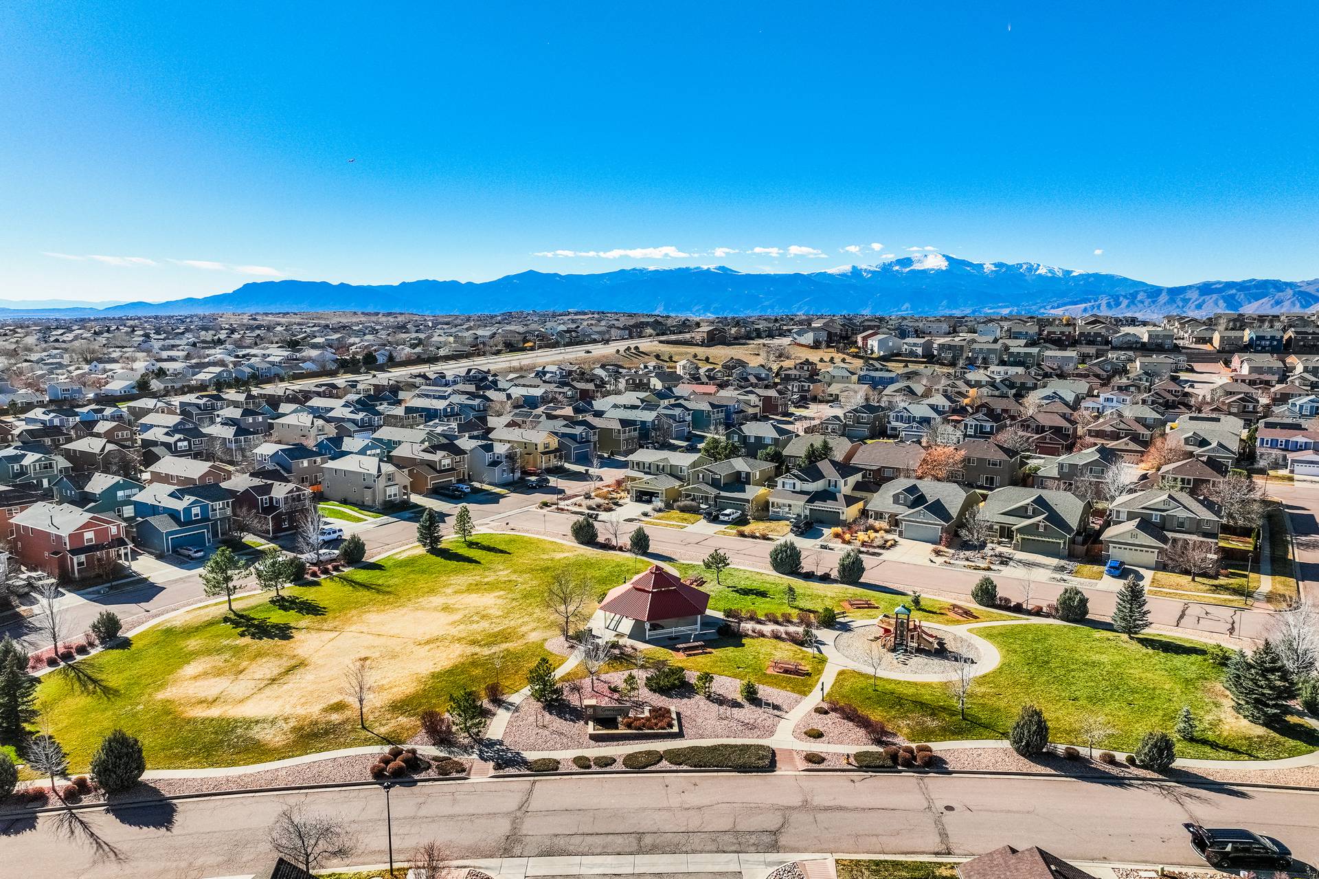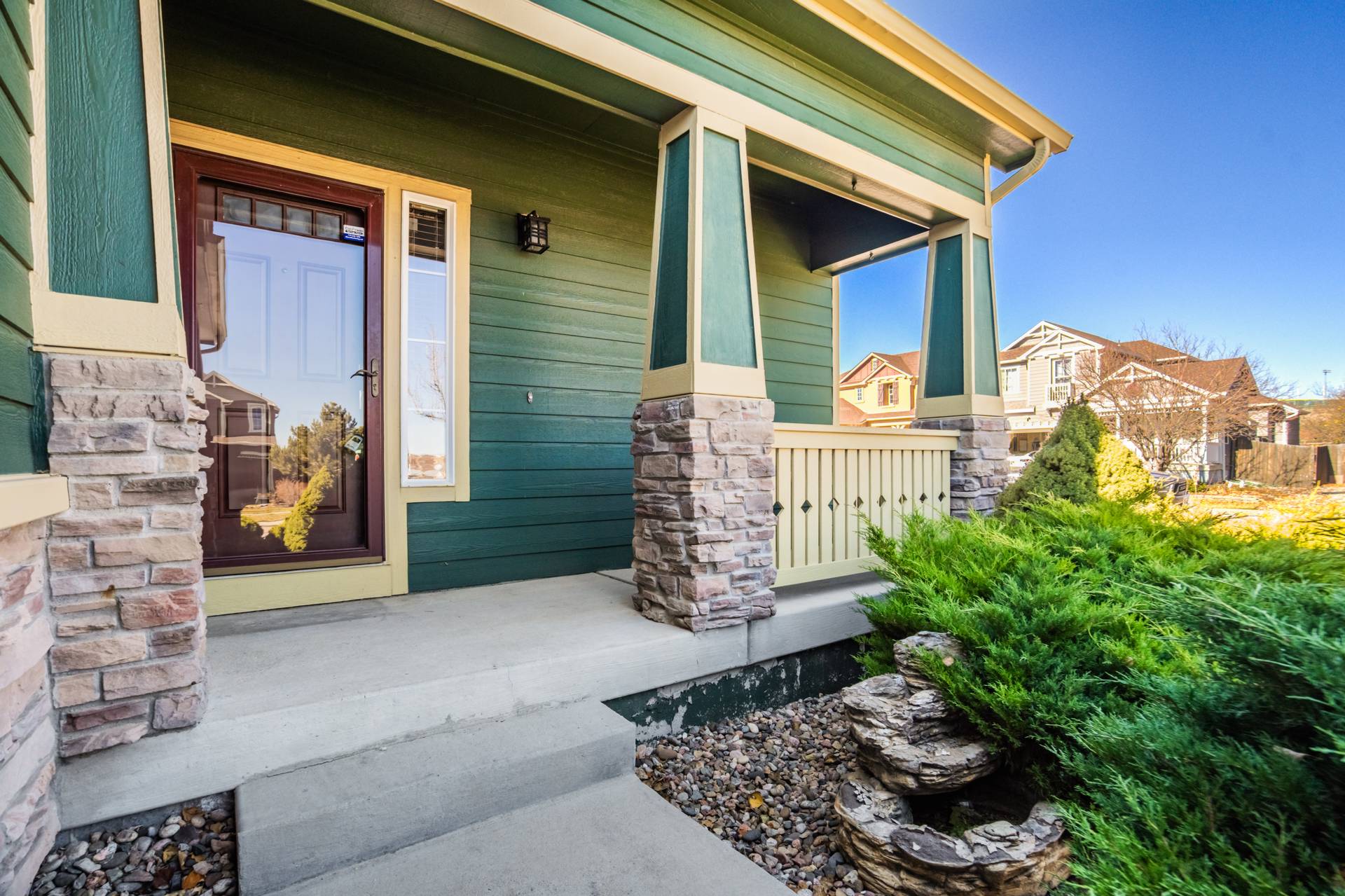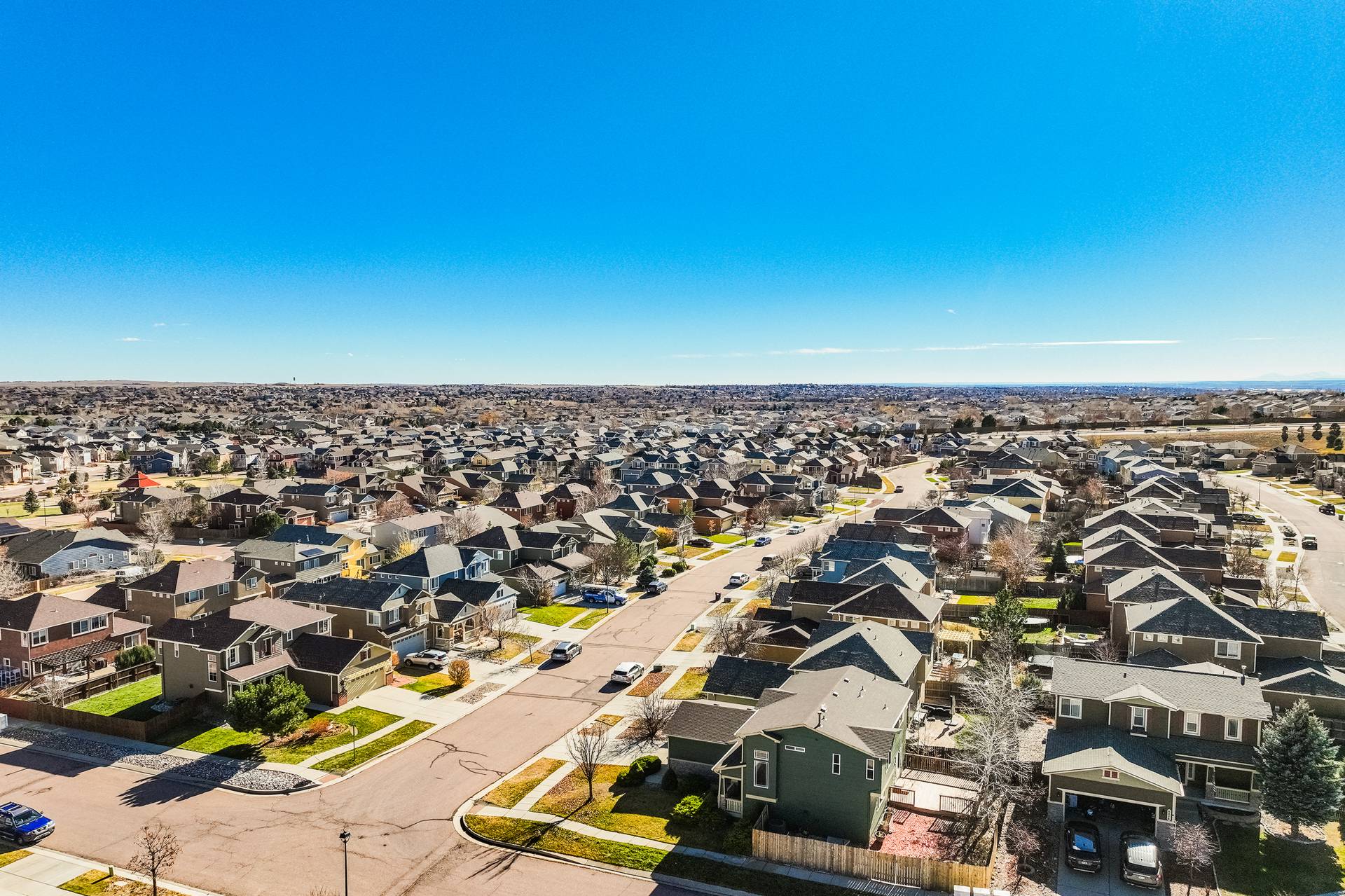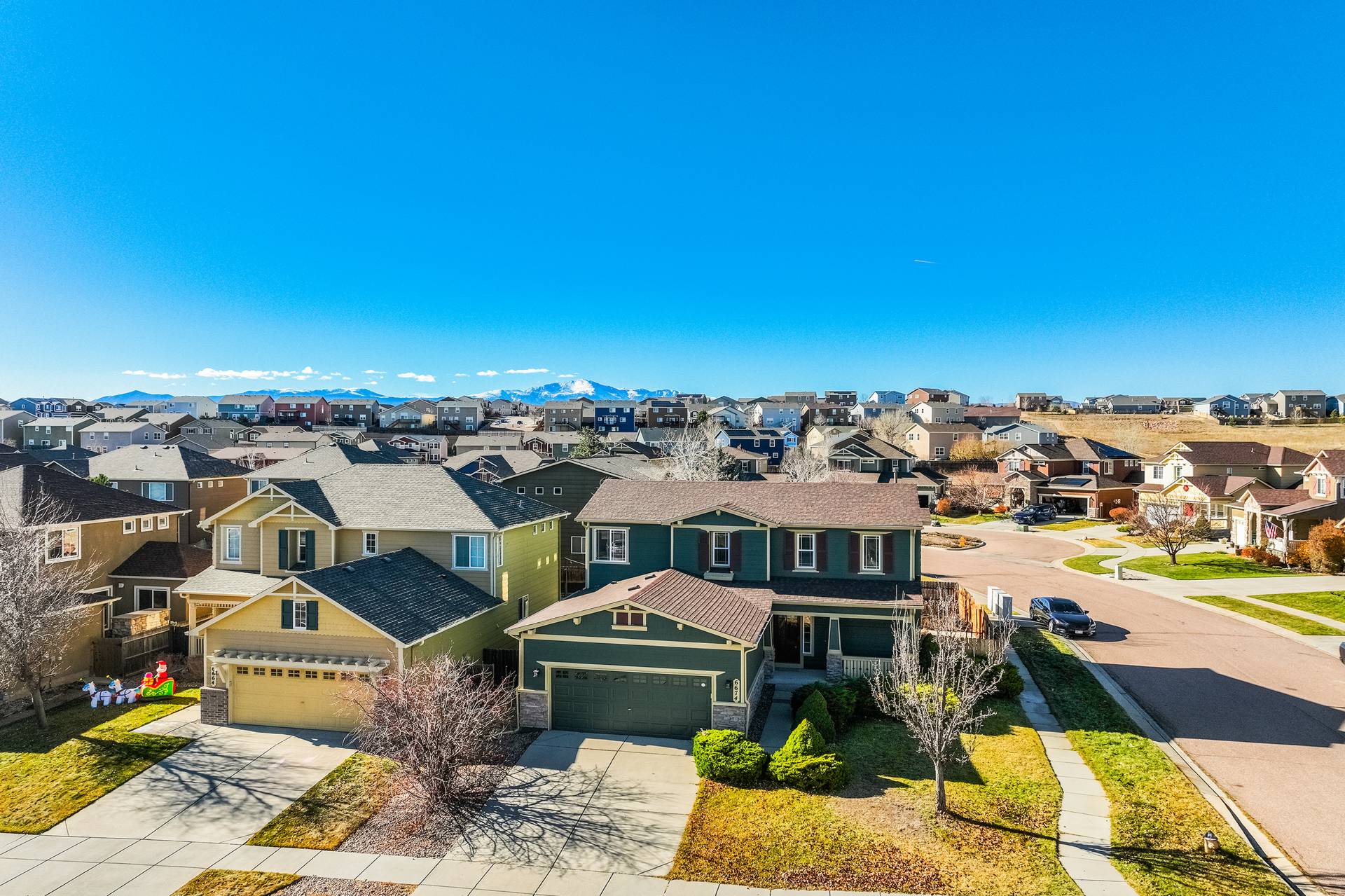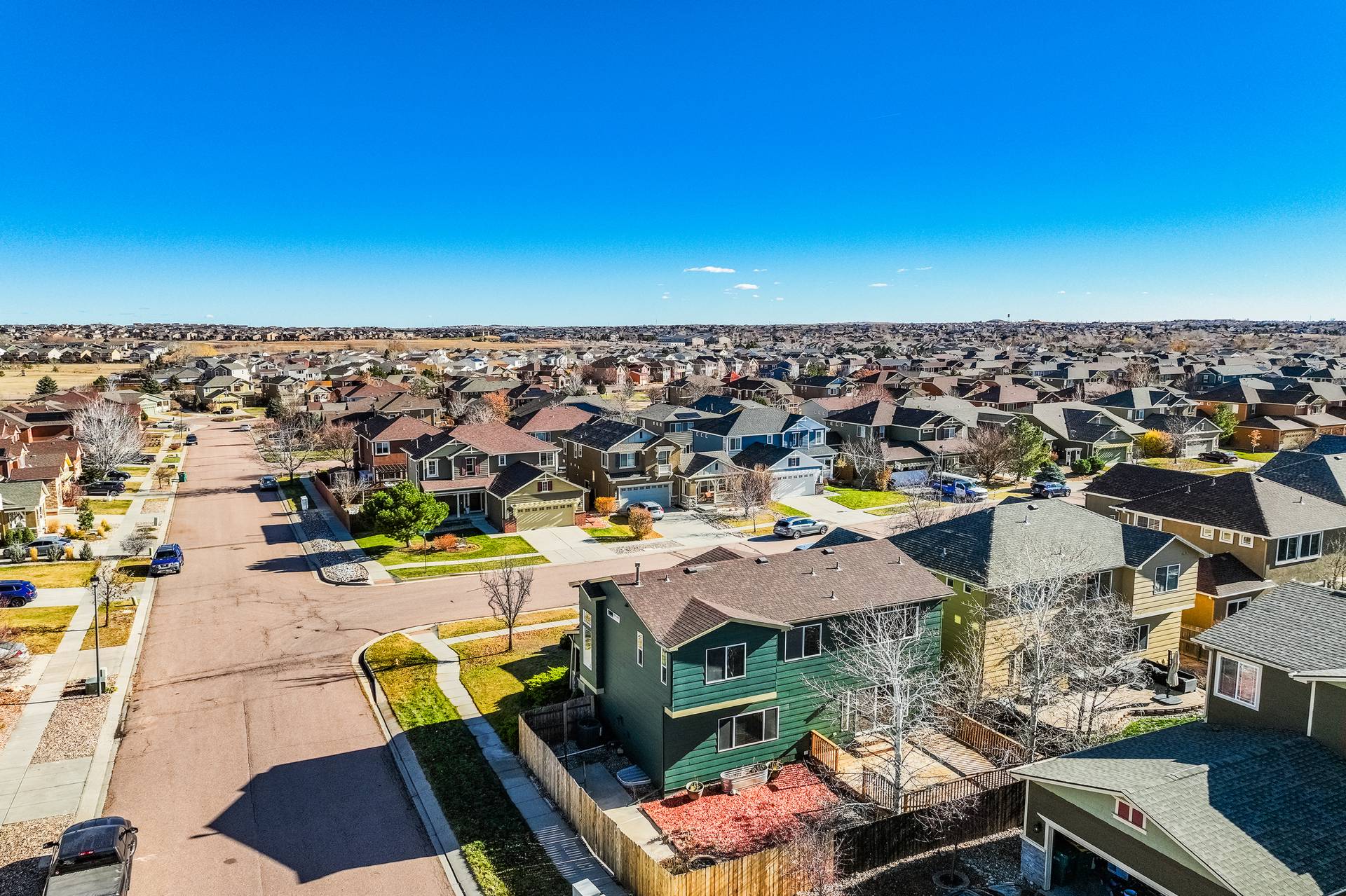 Set in Greenhaven w/ quick access to Powers, major shopping, restaurants, D49 schools & nearby hospitals, this 4-bed, 4-bath home sits on a corner lot offering easy connectivity to everyday amenities. The covered front entry leads into a bright foyer framed by high ceilings, arched openings & a layout that flows naturally across the main level. The great room centers around a gas fireplace w/mantel, entertainment niche & large windows that bring in soft natural light. Wood flooring runs through the high-traffic areas, connecting the living space to the kitchen & dining nook. The kitchen offers 42" uppers, granite-tile counters, full tile backsplash, an island w/built-in shelving, generous cabinetry, pantry storage & direct access to the dining area. The main level is completed by a laundry room w/electric hook-ups & a convenient half bath. Upstairs, the primary suite feels spacious w/its cove ceiling, ceiling fan, walk-in closet & a 5-pc bath featuring double vanities, a free-standing shower & soaking tub. 2 additional upper-level bedrooms maintain great separation from the main living areas, with a nearby full bath. Bonus loft space has built-in desk and workstation w/cabinets. The basement expands the home’s versatility w/a large family room, built-in kitchenette w/sink, refrigerator & cabinetry, ideal for extended-stay guests or rec room, plus an additional bedroom, full bath & under-stair storage. Outside, the backyard is designed for easy maintenance w/a large deck & concrete patio, mulch beds, landscape pavers. Rear fencing, mature trees & corner lot adds to privacy. A solid two-story floor plan in a convenient Powers corridor location w/central air, energy efficient vinyl windows, attached 2-car garage.