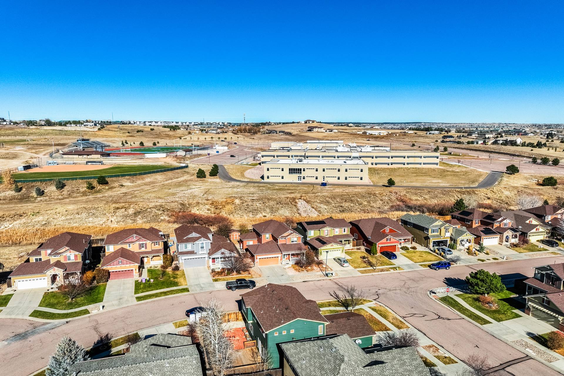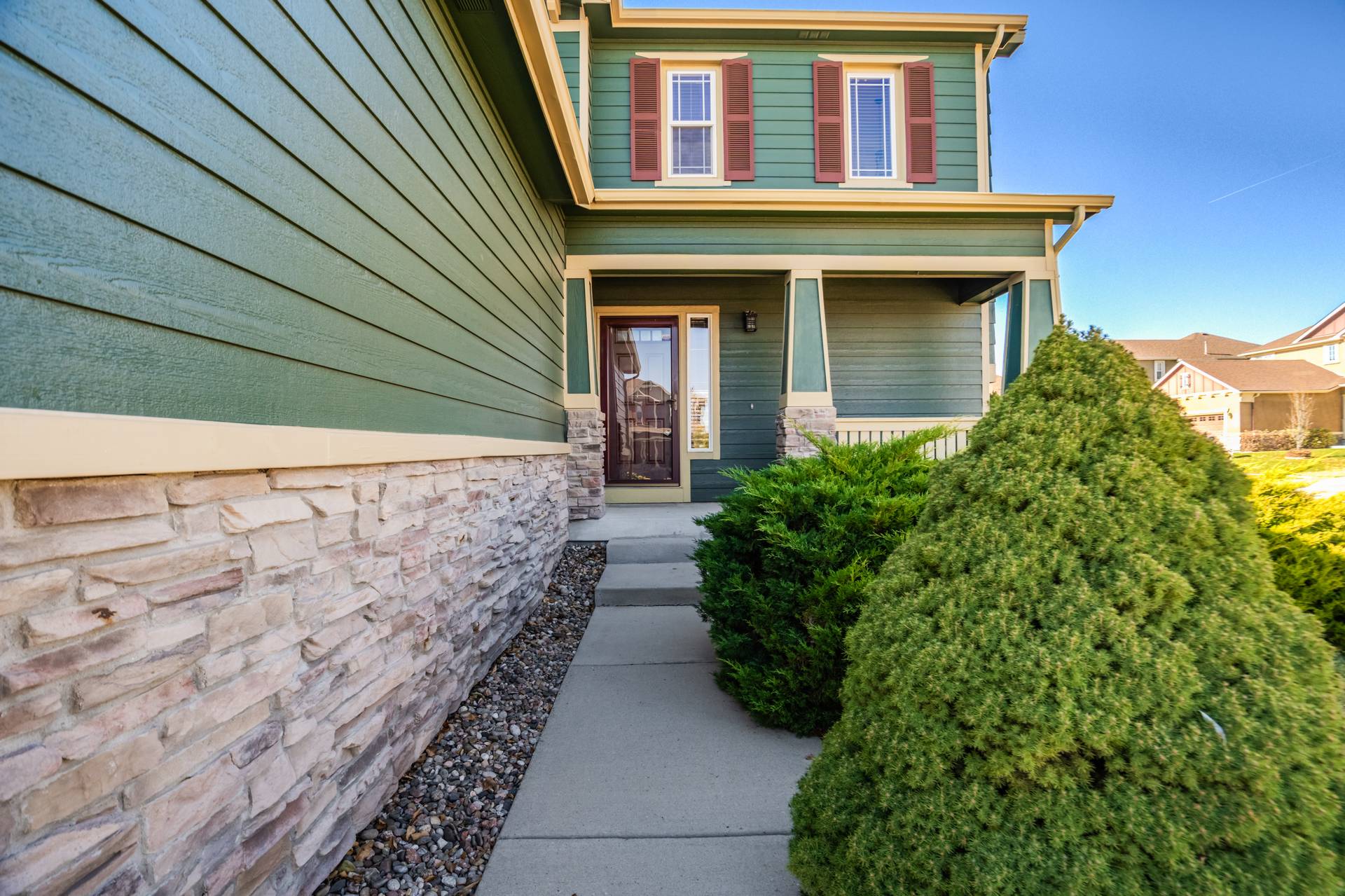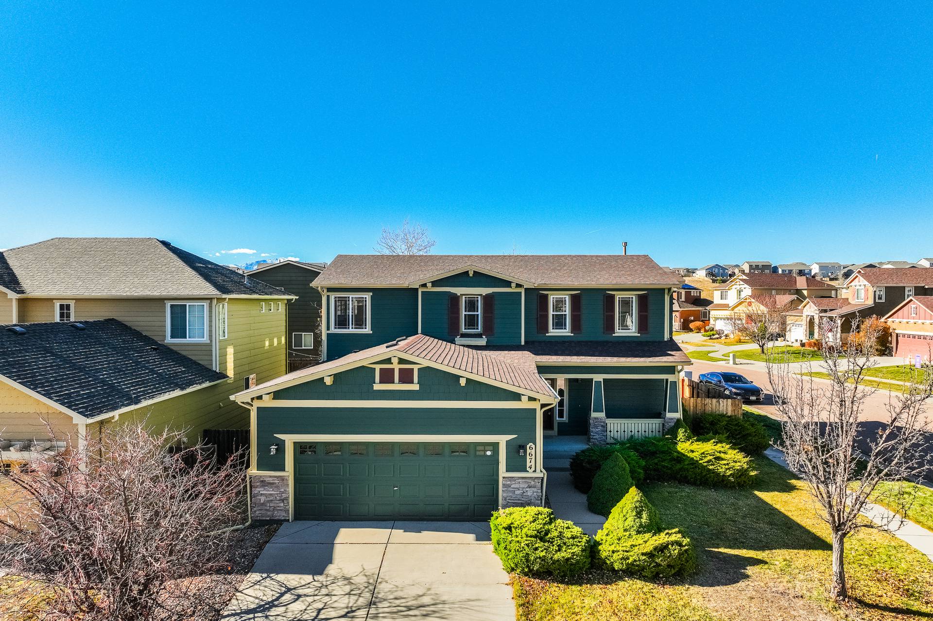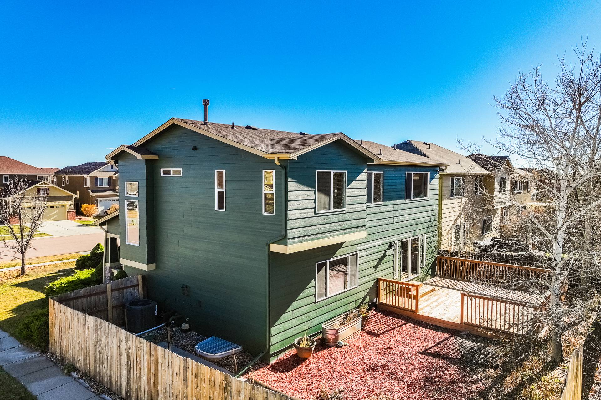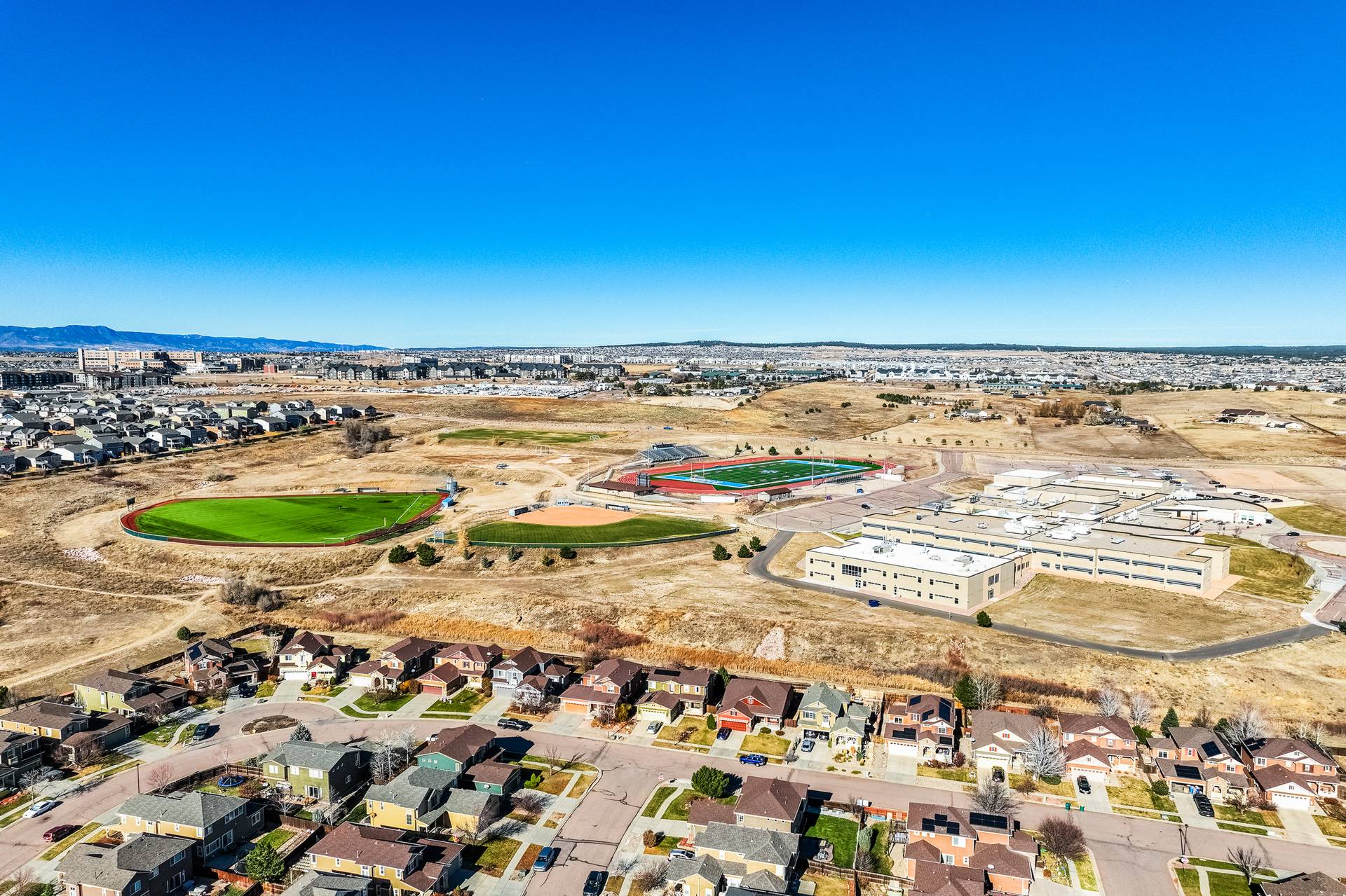Set in Greenhaven w/ quick access to Powers, major shopping, restaurants, D49 schools & nearby hospitals, this 4-bed, 4-bath home sits on a corner lot offering easy connectivity to everyday amenities. The covered front entry leads into a bright foyer framed by high ceilings, arched openings & a layout that flows naturally across the main level. The great room centers around a gas fireplace w/mantel, entertainment niche & large windows that bring in soft natural light. Wood flooring runs through the high-traffic areas, connecting the living space to the kitchen & dining nook. The kitchen offers 42" uppers, granite-tile counters, full tile backsplash, an island w/built-in shelving, generous cabinetry, pantry storage & direct access to the dining area. The main level is completed by a laundry room w/electric hook-ups & a convenient half bath. Upstairs, the primary suite feels spacious w/its cove ceiling, ceiling fan, walk-in closet & a 5-pc bath featuring double vanities, a free-standing shower & soaking tub. 2 additional upper-level bedrooms maintain great separation from the main living areas, with a nearby full bath. Bonus loft space has built-in desk and workstation w/cabinets. The basement expands the home’s versatility w/a large family room, built-in kitchenette w/sink, refrigerator & cabinetry, ideal for extended-stay guests or rec room, plus an additional bedroom, full bath & under-stair storage. Outside, the backyard is designed for easy maintenance w/a large deck & concrete patio, mulch beds, landscape pavers. Rear fencing, mature trees & corner lot adds to privacy. A solid two-story floor plan in a convenient Powers corridor location w/central air, energy efficient vinyl windows, attached 2-car garage.
