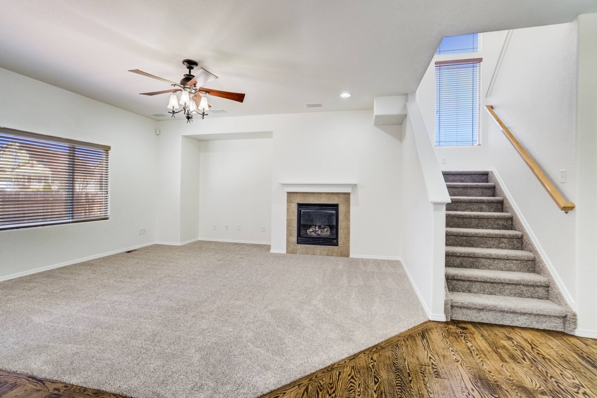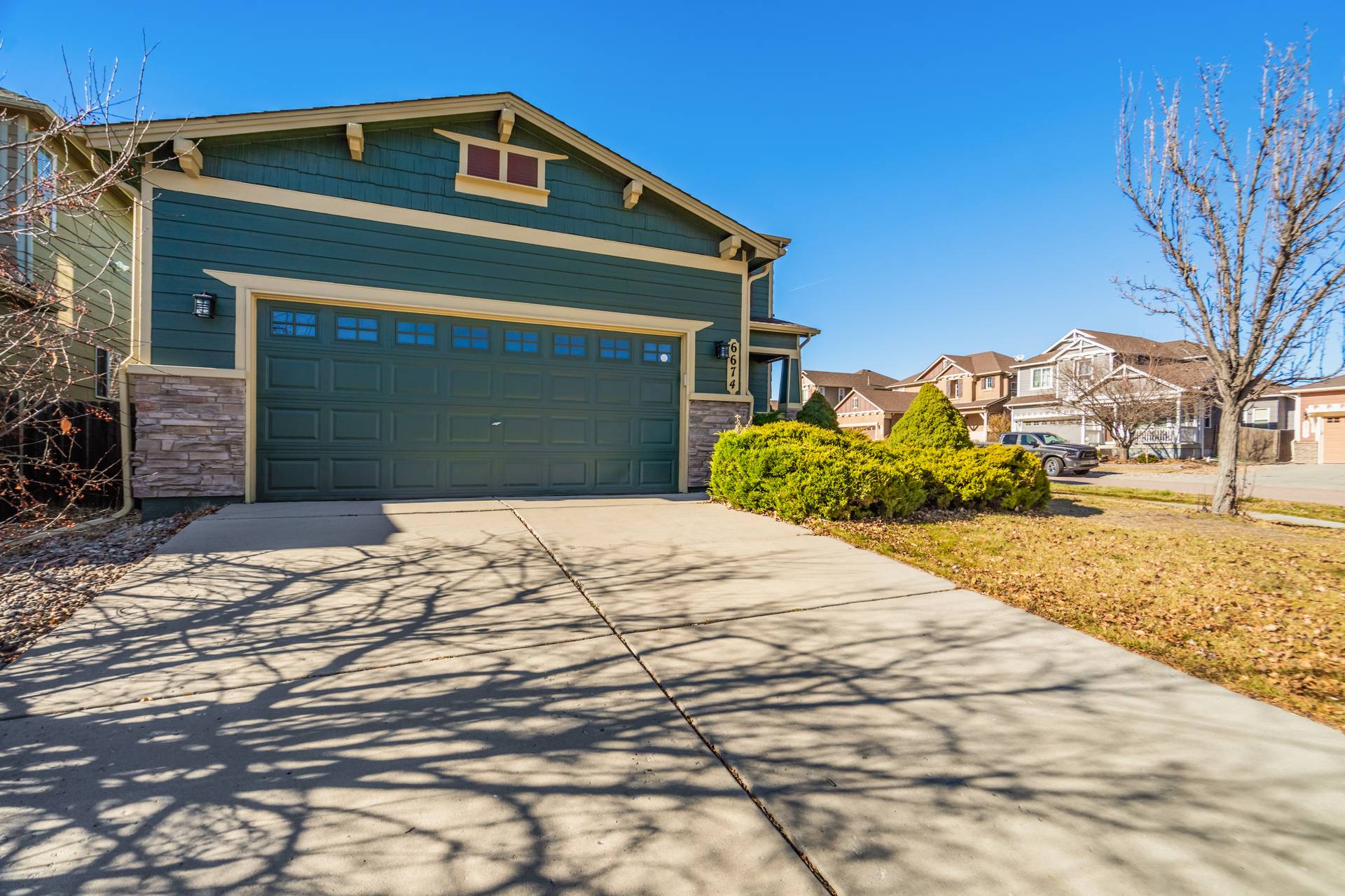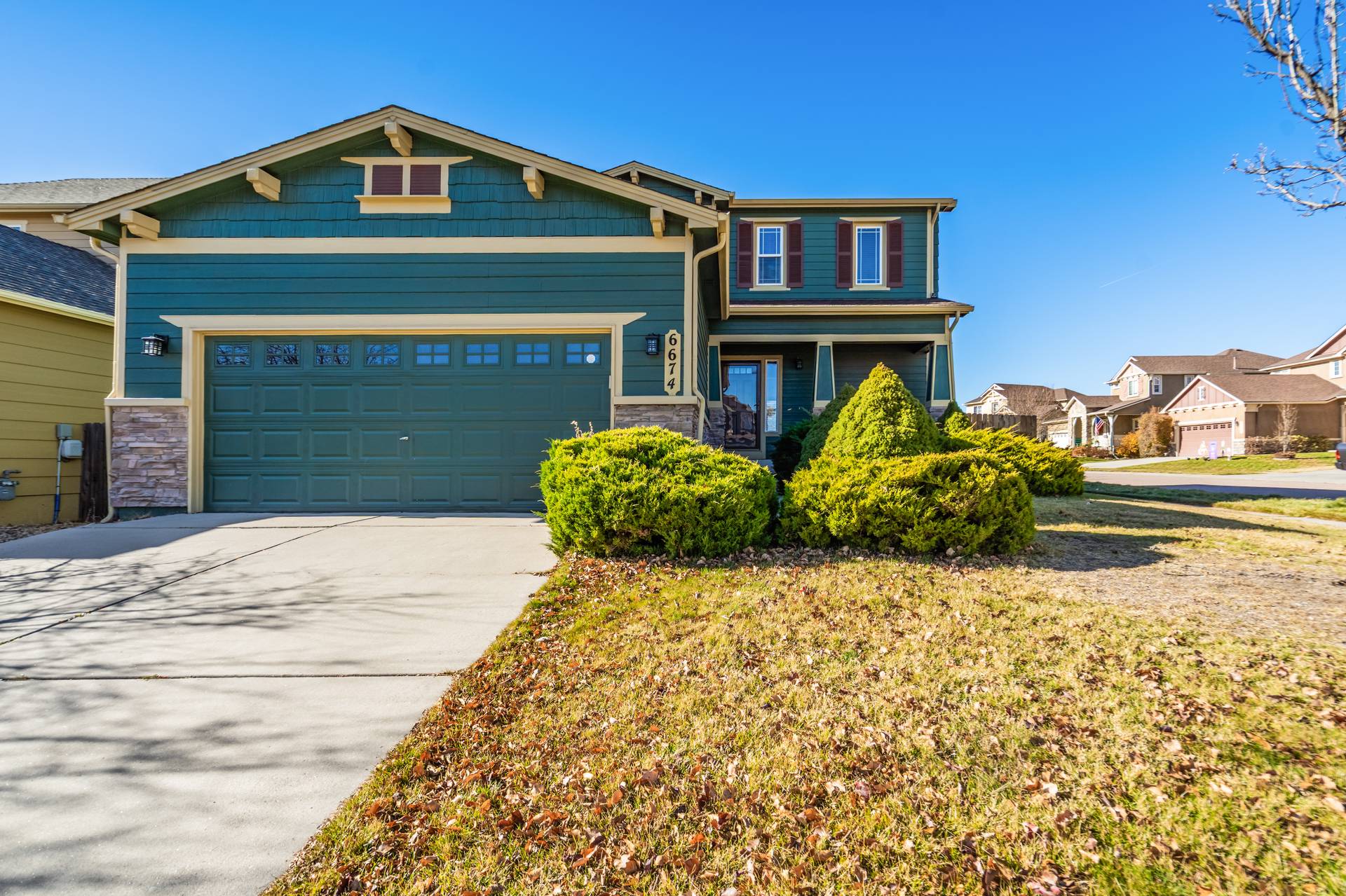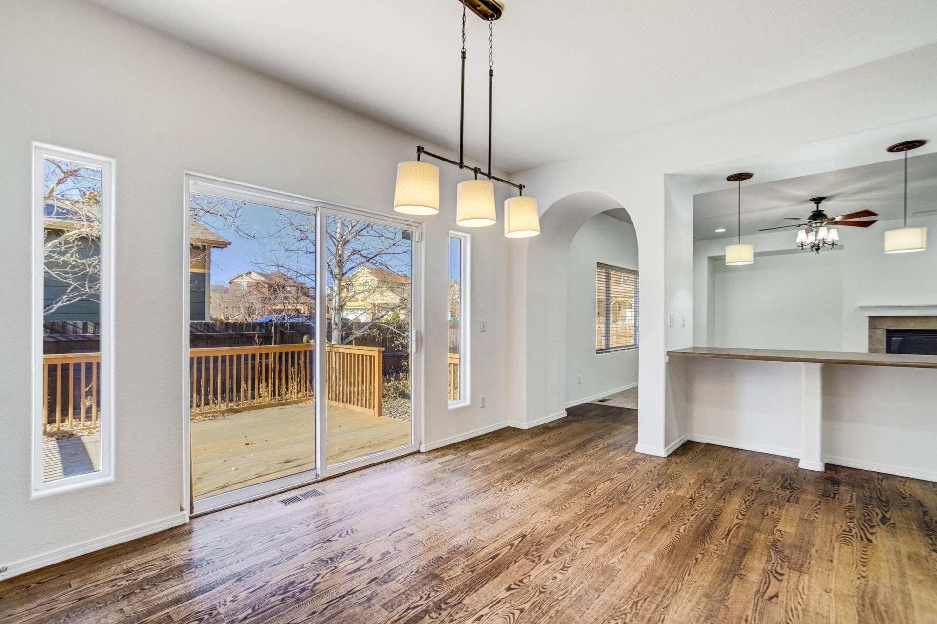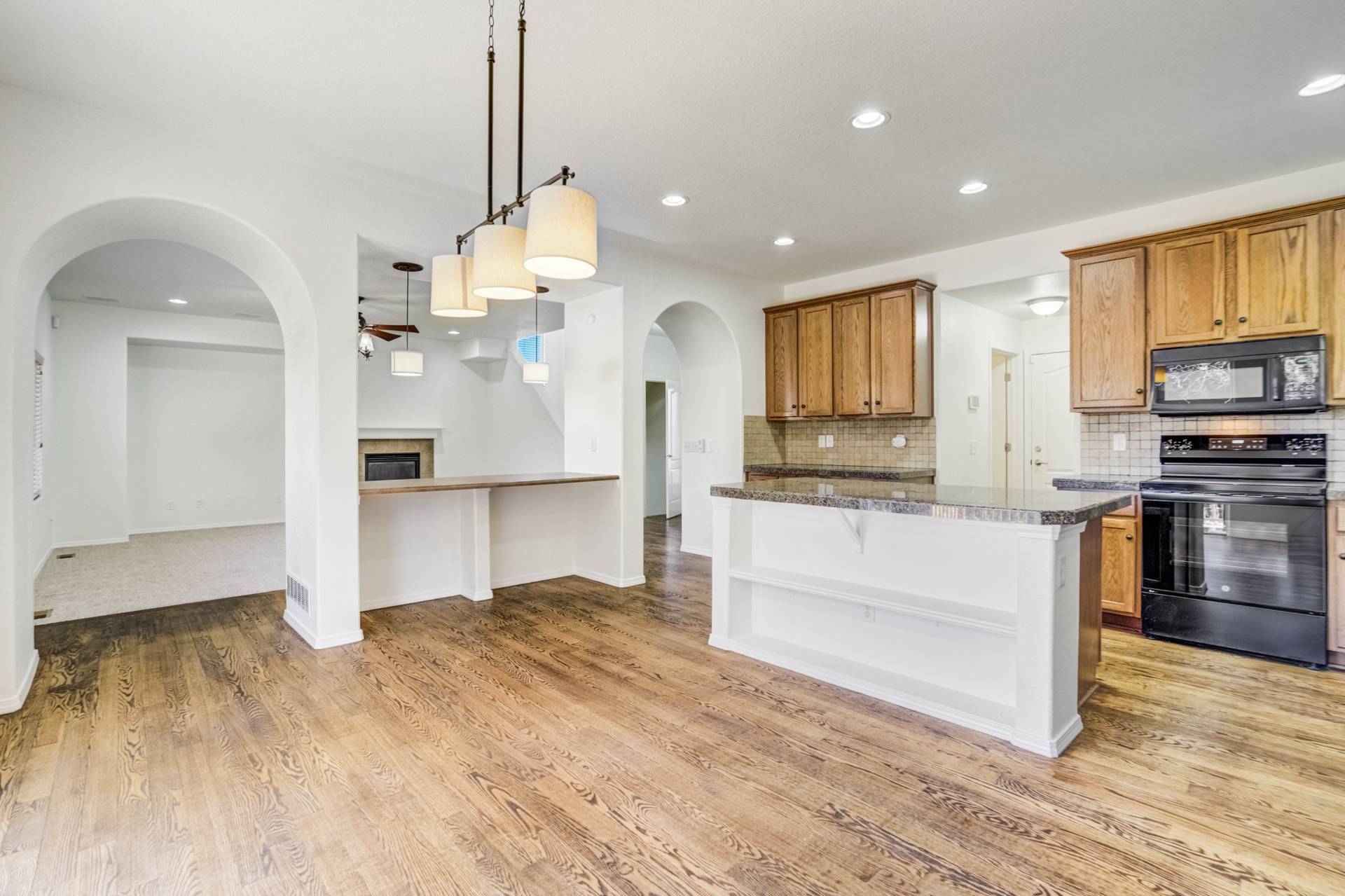 Set in Greenhaven w/ quick access to Powers, major shopping, restaurants, D49 schools & nearby hospitals, this 4-bed, 4-bath home sits on a corner lot offering easy connectivity to everyday amenities. The covered front entry leads into a bright foyer framed by high ceilings, arched openings & a layout that flows naturally across the main level. The great room centers around a gas fireplace w/mantel, entertainment niche & large windows that bring in soft natural light. Wood flooring runs through the high-traffic areas, connecting the living space to the kitchen & dining nook. The kitchen offers 42" uppers, granite-tile counters, full tile backsplash, an island w/built-in shelving, generous cabinetry, pantry storage & direct access to the dining area. The main level is completed by a laundry room w/electric hook-ups & a convenient half bath. Upstairs, the primary suite feels spacious w/its cove ceiling, ceiling fan, walk-in closet & a 5-pc bath featuring double vanities, a free-standing shower & soaking tub. 2 additional upper-level bedrooms maintain great separation from the main living areas, with a nearby full bath. Bonus loft space has built-in desk and workstation w/cabinets. The basement expands the home’s versatility w/a large family room, built-in kitchenette w/sink, refrigerator & cabinetry, ideal for extended-stay guests or rec room, plus an additional bedroom, full bath & under-stair storage. Outside, the backyard is designed for easy maintenance w/a large deck & concrete patio, mulch beds, landscape pavers. Rear fencing, mature trees & corner lot adds to privacy. A solid two-story floor plan in a convenient Powers corridor location w/central air, energy efficient vinyl windows, attached 2-car garage.
