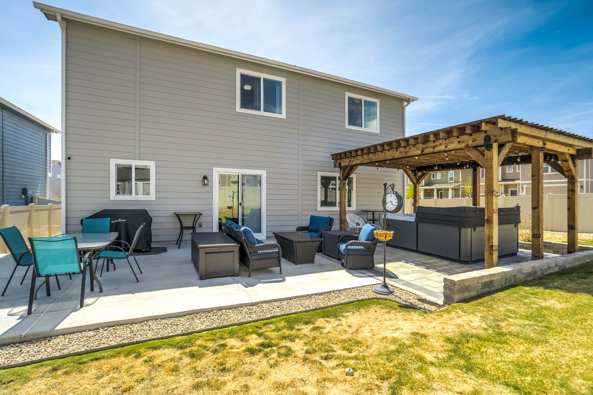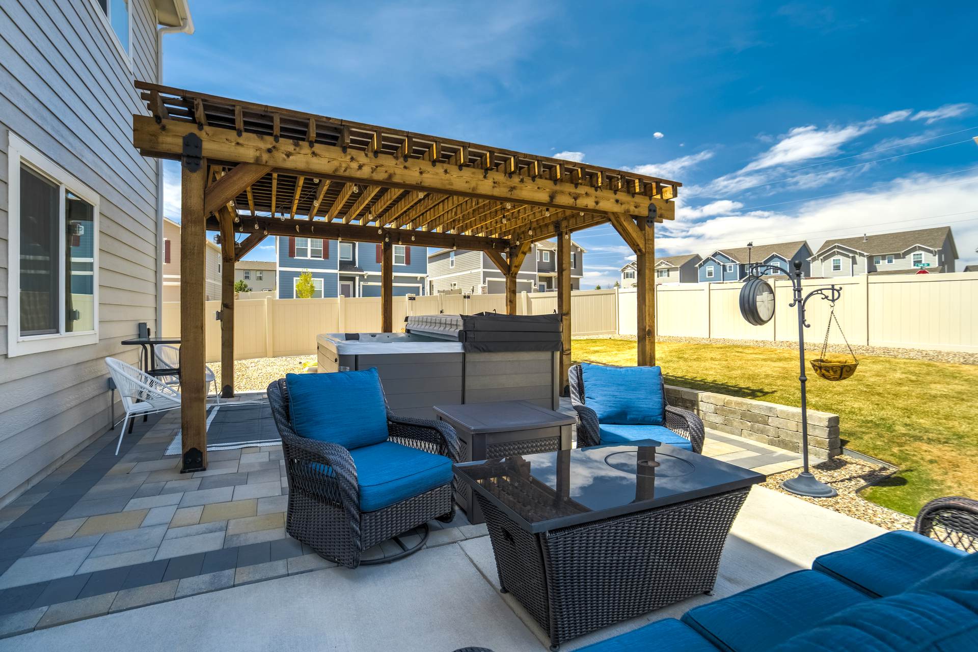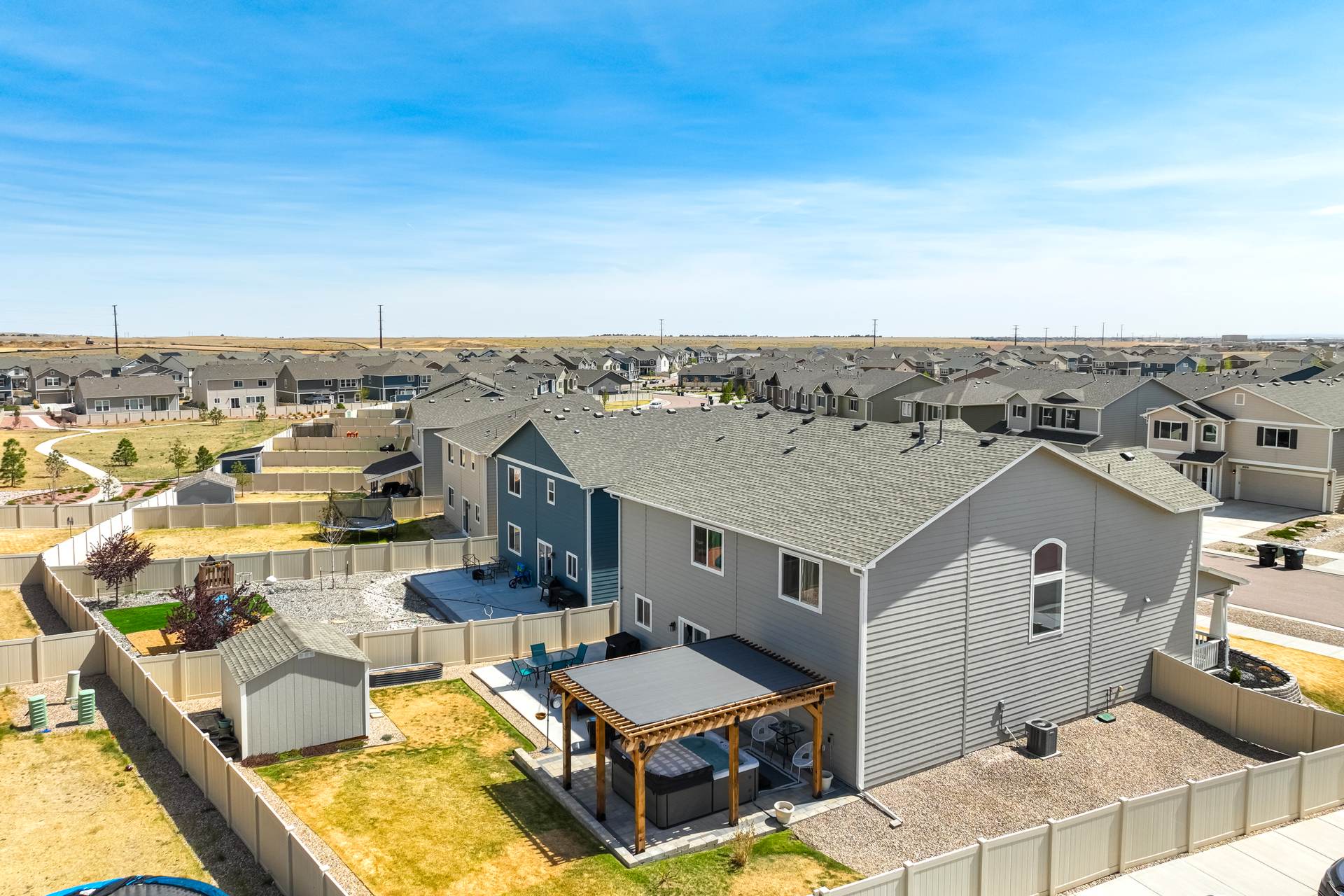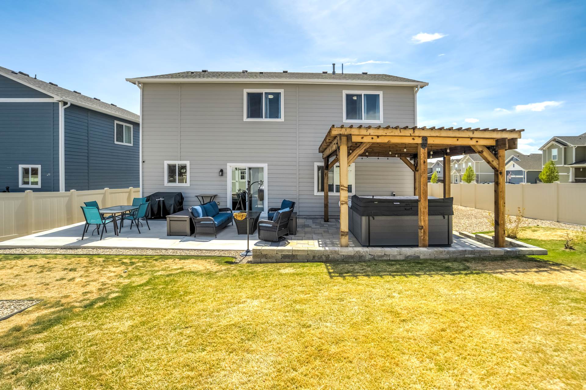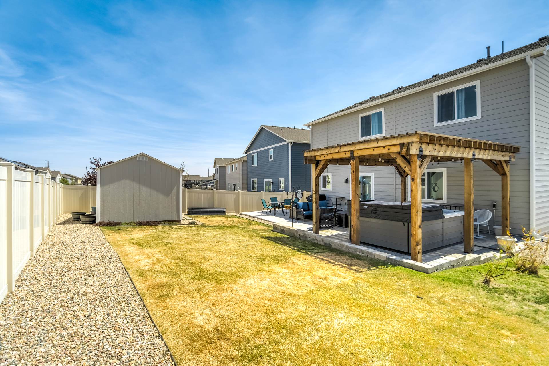 Move-In Ready Home with Backyard Oasis, Hot Tub & Upgrades! This stunning 5-bedroom, 3-bath home features a spacious open floor plan, and an upper-level loft—designed for flexible living and everyday comfort. This open-concept design feels spacious and inviting, offering plenty of room to relax or entertain. The kitchen features a large island, pantry and a walkout to the backyard—perfect for seamless indoor-outdoor living. The front main level bedroom includes shelving, making it perfect for a guest room or home office. Several light fixures have been upgraded! Upstairs, you’ll find generously sized bedrooms along with a spacious loft. The oversized primary suite features a double vanity, soaking tub, separate shower, and walk-in closet. The additional bedrooms are well-sized and share a full bath. Laundry is conveniently located on the upper level near all bedrooms. Step outside to your private backyard oasis, complete with a large pergola, private large hot tub - perfect for families or taller individuals, cement walkways, storage shed, and upgraded brickwork will add to your enjoyment. Situated on a desirable corner lot with charming front flower beds and excellent curb appeal, this home offers both beauty and function—inside and out. You are truly able to relax as you have extra assurance with this nearly new home! Additionally, this is a perfect location as it is close to parks, schools, walking trails, access to Peterson Space Force, Powers Corridor, and all the shopping.