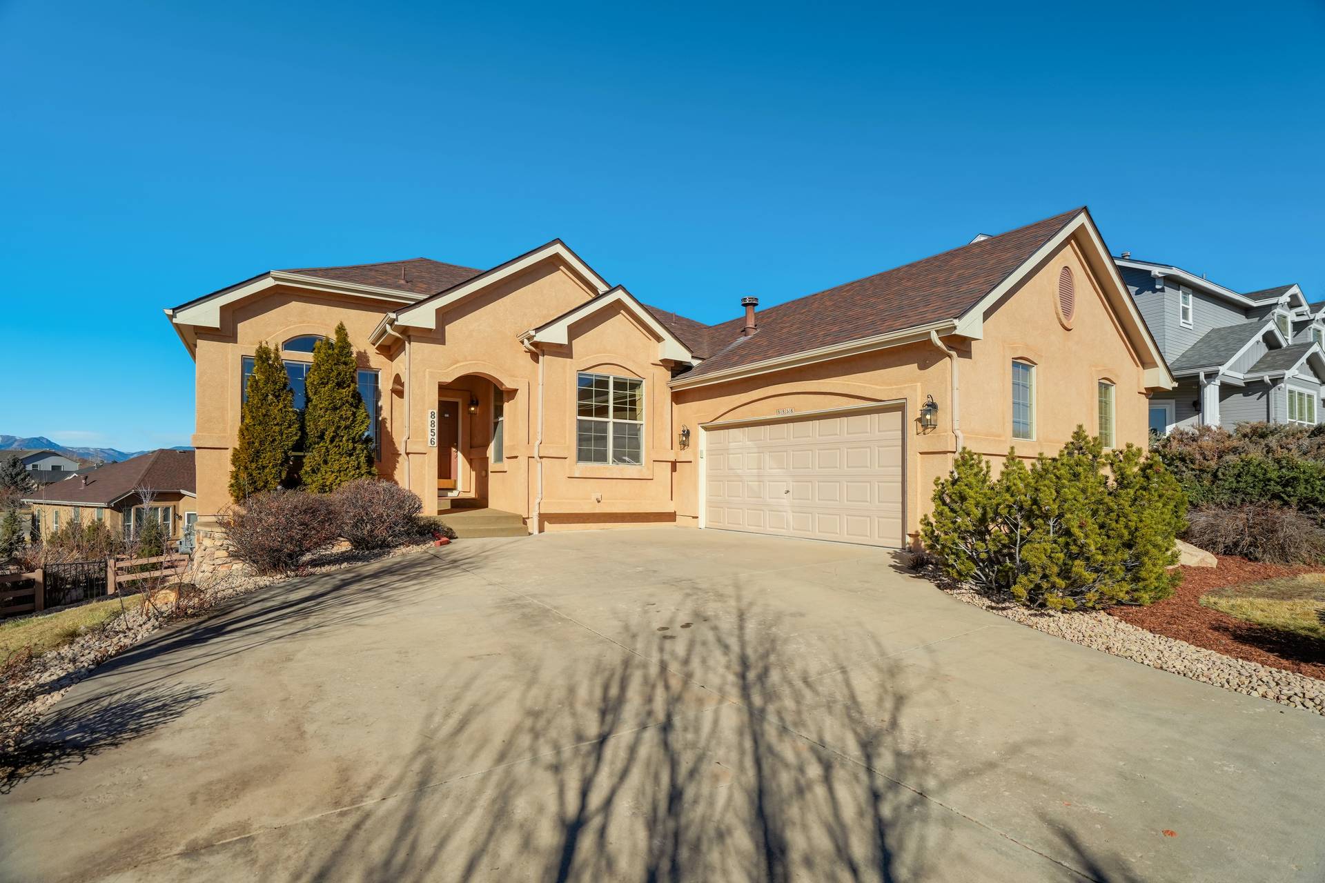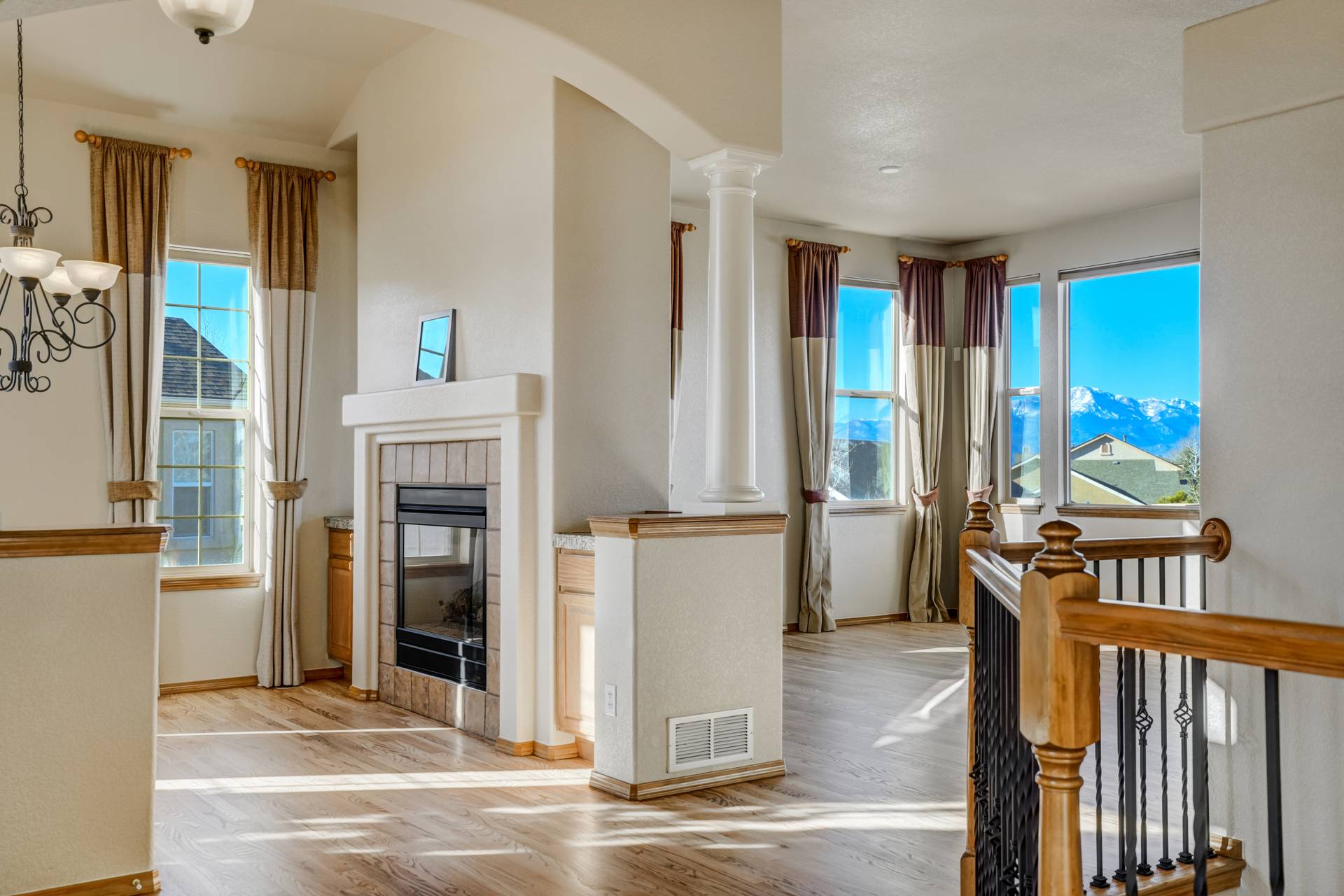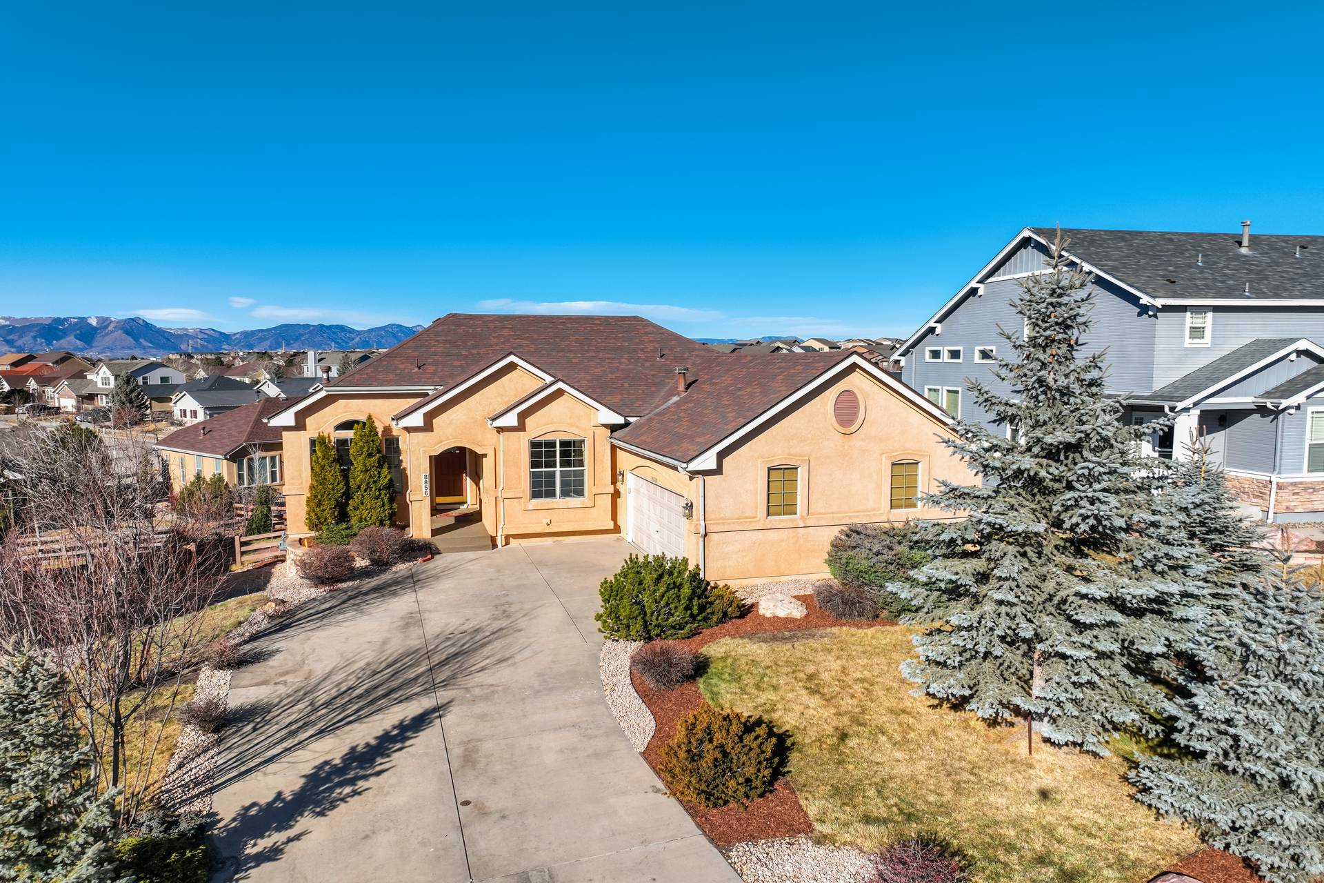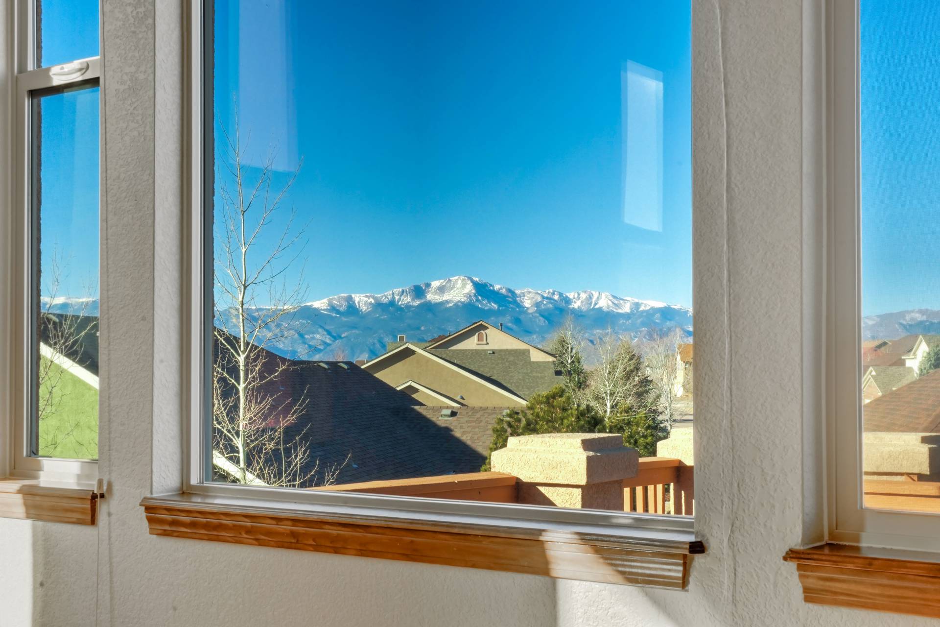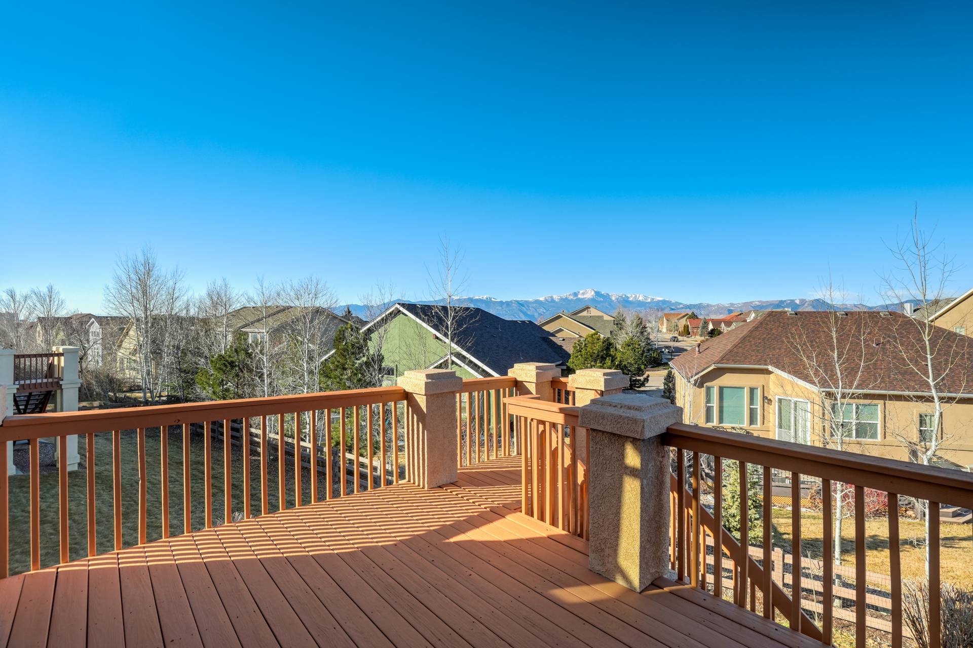 Superb Pikes Peak VIEWS from this ranch floor plan with walkout basement! Home is open, bright and inviting with plenty of windows, high ceilings and LED lights throughout. Gleaming hardwood floors flow from the entry through the living room, hallway, dining room, family room and kitchen—freshly refinished January 2025. Plus, NEW carpet, NEW furnace and NEW air conditioner—January 2025. Views from Family Room, Kitchen, 15x10 Deck, Rec Room and Master Bedroom. Family Room and Dining Room share a see-through fireplace for a cozy home feel. The Living Room is a flex space, perfect for sitting room, office, formal living, play room, etc. Spacious rooms throughout the home, lots of kitchen cabinets and a nice-sized pantry. The huge L-shaped Rec Room features a second fireplace, walkout to 10x9 concrete patio and backyard, garden level windows and a large 14x9 wet bar area with tile countertops and tile floor. All the bedrooms are spacious, and three feature large walk-in closets. Master Bedroom with plenty of windows, walkout to private balcony, 7x8 cedar-lined walk-in closet, and adjoining 5-piece bath with tile floor, double vanity, soaking tub and separate shower. Recently freshened landscaping. Low-maintenance stucco siding. Additional features include modern-design wrought iron spindles, new (2025) smoke and CO detectors, sump pump and plenty of storage with storage room and large closets. Great location just one block from Wolf Ranch Dog Park and Recreation Center Swimming Pool (membership access with extra fee). Academy District 20 schools. Great property!