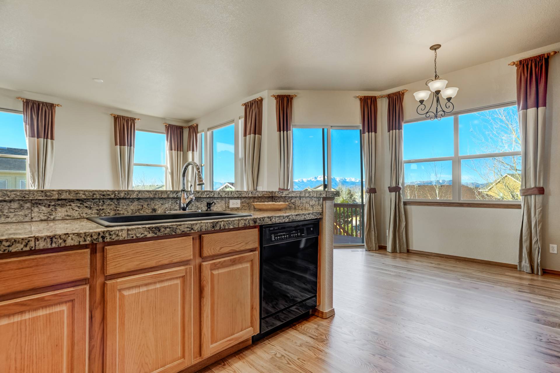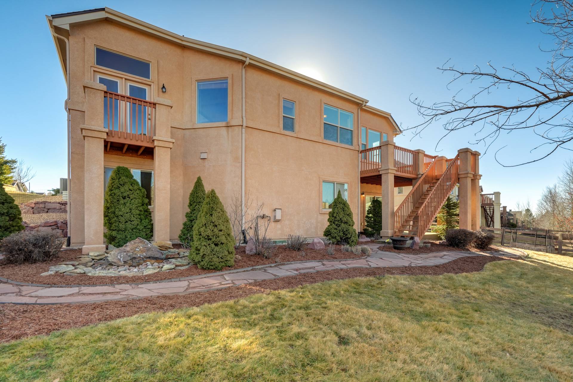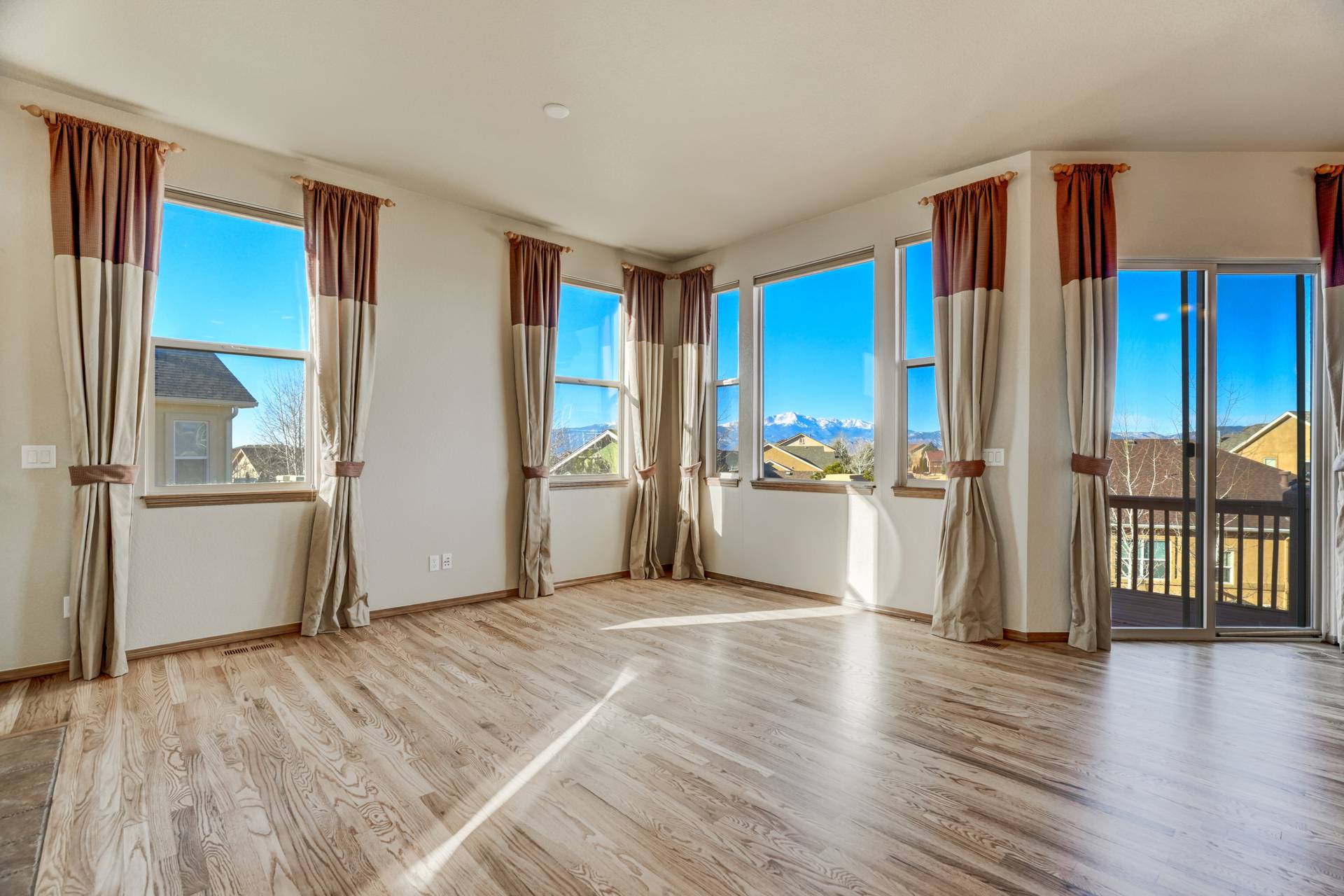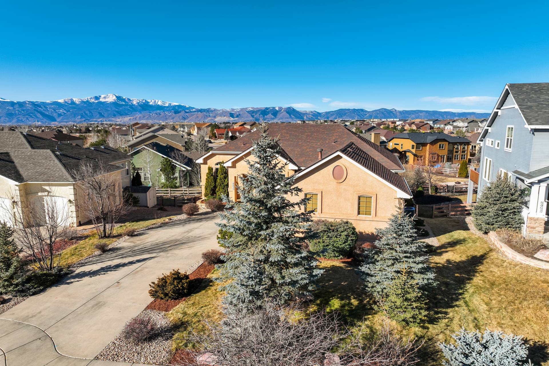 Superb Pikes Peak VIEWS from this ranch floor plan with walkout basement! Home is open, bright and inviting with plenty of windows, high ceilings and LED lights throughout. Gleaming hardwood floors flow from the entry through the living room, hallway, dining room, family room and kitchen—freshly refinished January 2025. Plus, NEW carpet, NEW furnace and NEW air conditioner—January 2025. Views from Family Room, Kitchen, 15x10 Deck, Rec Room and Master Bedroom. Family Room and Dining Room share a see-through fireplace for a cozy home feel. The Living Room is a flex space, perfect for sitting room, office, formal living, play room, etc. Spacious rooms throughout the home, lots of kitchen cabinets and a nice-sized pantry. The huge L-shaped Rec Room features a second fireplace, walkout to 10x9 concrete patio and backyard, garden level windows and a large 14x9 wet bar area with tile countertops and tile floor. All the bedrooms are spacious, and three feature large walk-in closets. Master Bedroom with plenty of windows, walkout to private balcony, 7x8 cedar-lined walk-in closet, and adjoining 5-piece bath with tile floor, double vanity, soaking tub and separate shower. Recently freshened landscaping. Low-maintenance stucco siding. Additional features include modern-design wrought iron spindles, new (2025) smoke and CO detectors, sump pump and plenty of storage with storage room and large closets. Great location just one block from Wolf Ranch Dog Park and Recreation Center Swimming Pool (membership access with extra fee). Academy District 20 schools. Great property!