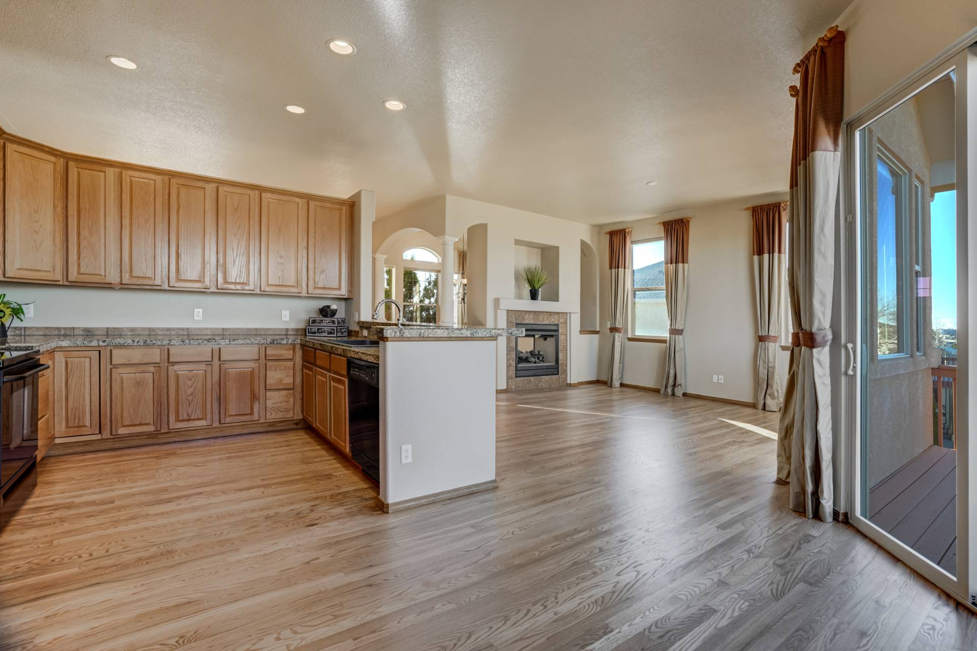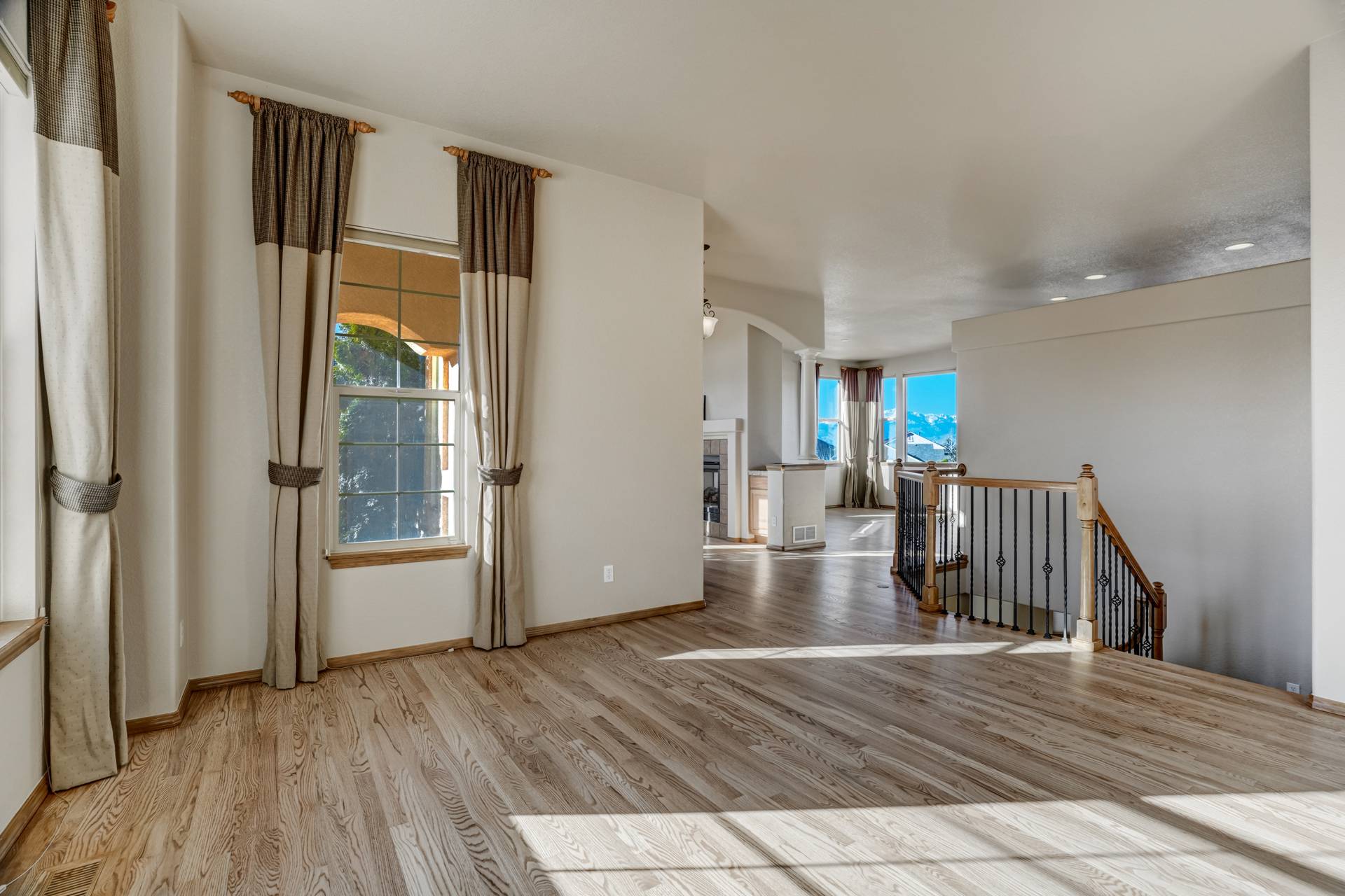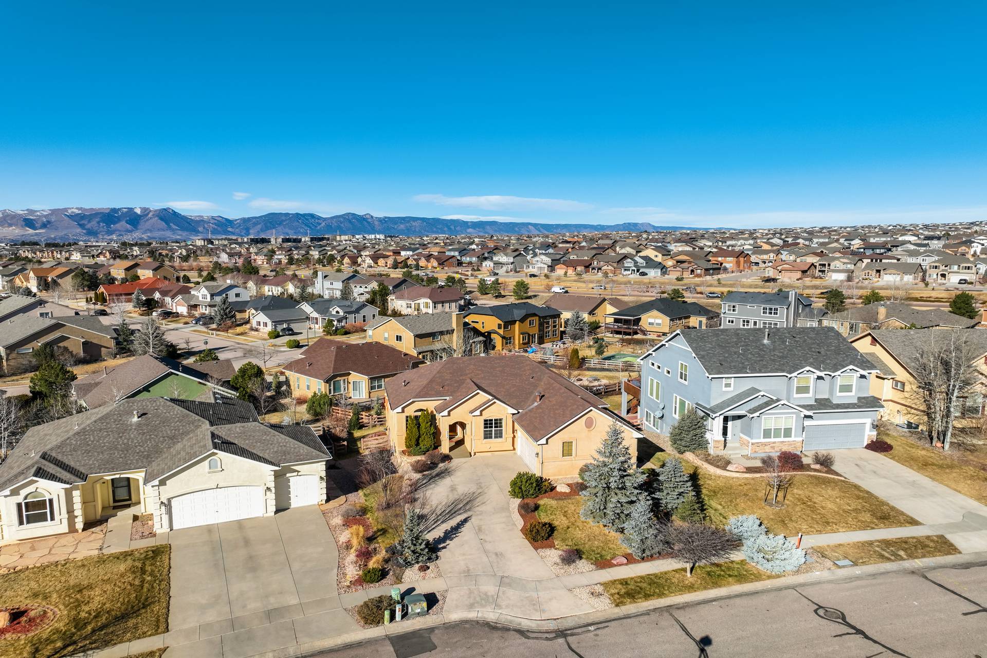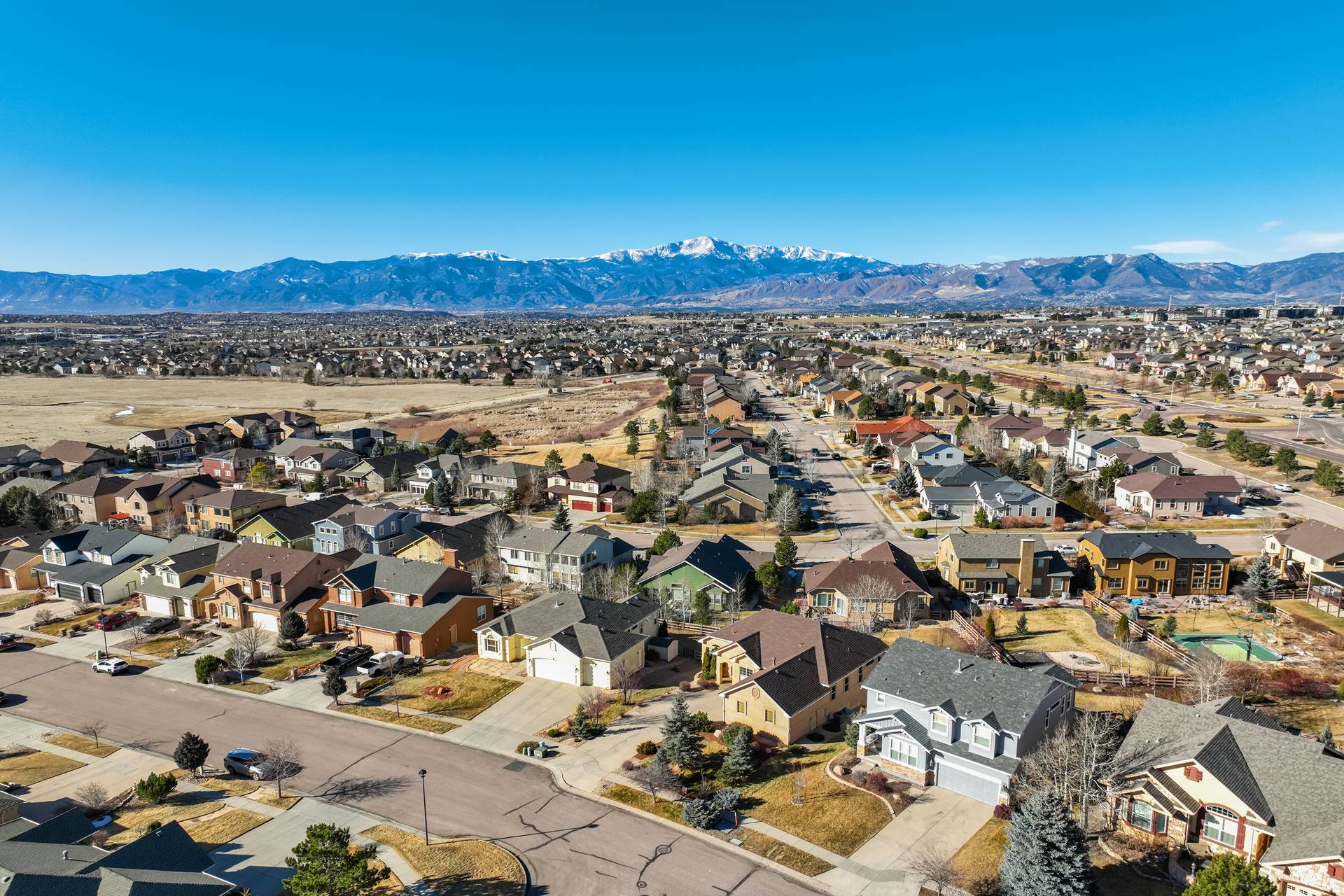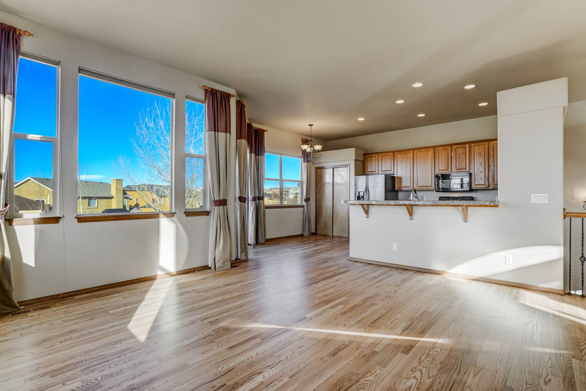 Superb Pikes Peak VIEWS from this ranch floor plan with walkout basement! Home is open, bright and inviting with plenty of windows, high ceilings and LED lights throughout. Gleaming hardwood floors flow from the entry through the living room, hallway, dining room, family room and kitchen—freshly refinished January 2025. Plus, NEW carpet, NEW furnace and NEW air conditioner—January 2025. Views from Family Room, Kitchen, 15x10 Deck, Rec Room and Master Bedroom. Family Room and Dining Room share a see-through fireplace for a cozy home feel. The Living Room is a flex space, perfect for sitting room, office, formal living, play room, etc. Spacious rooms throughout the home, lots of kitchen cabinets and a nice-sized pantry. The huge L-shaped Rec Room features a second fireplace, walkout to 10x9 concrete patio and backyard, garden level windows and a large 14x9 wet bar area with tile countertops and tile floor. All the bedrooms are spacious, and three feature large walk-in closets. Master Bedroom with plenty of windows, walkout to private balcony, 7x8 cedar-lined walk-in closet, and adjoining 5-piece bath with tile floor, double vanity, soaking tub and separate shower. Recently freshened landscaping. Low-maintenance stucco siding. Additional features include modern-design wrought iron spindles, new (2025) smoke and CO detectors, sump pump and plenty of storage with storage room and large closets. Great location just one block from Wolf Ranch Dog Park and Recreation Center Swimming Pool (membership access with extra fee). Academy District 20 schools. Great property!