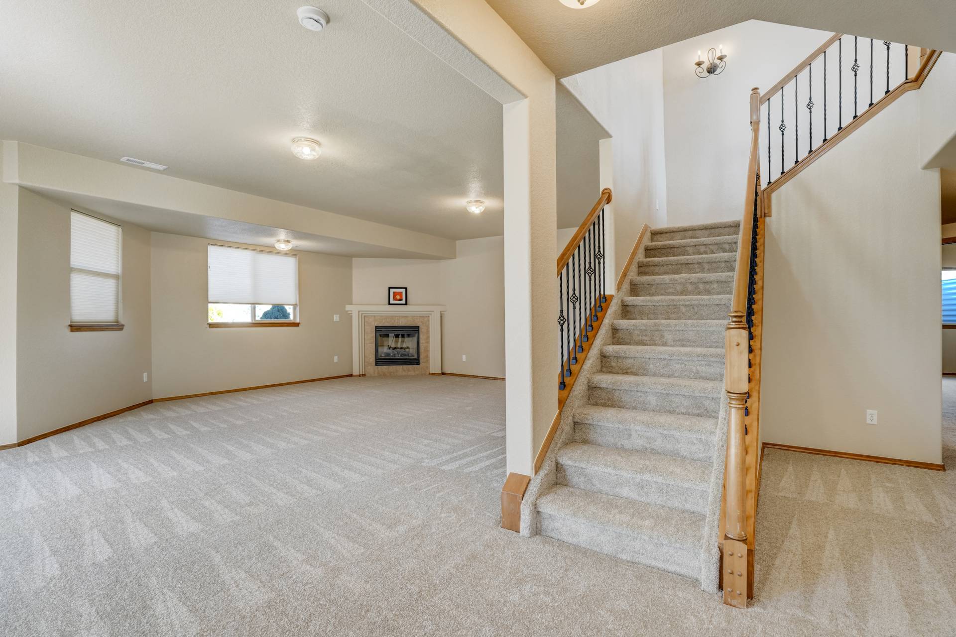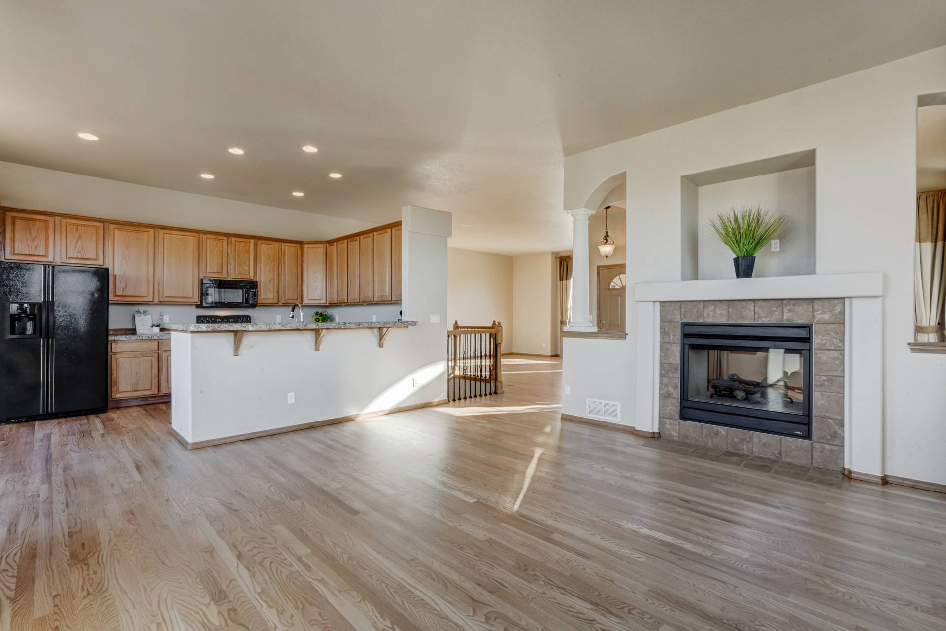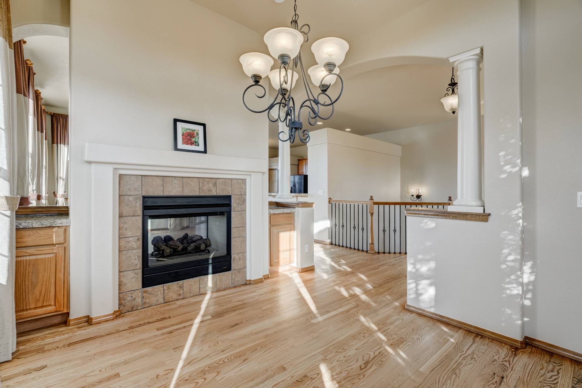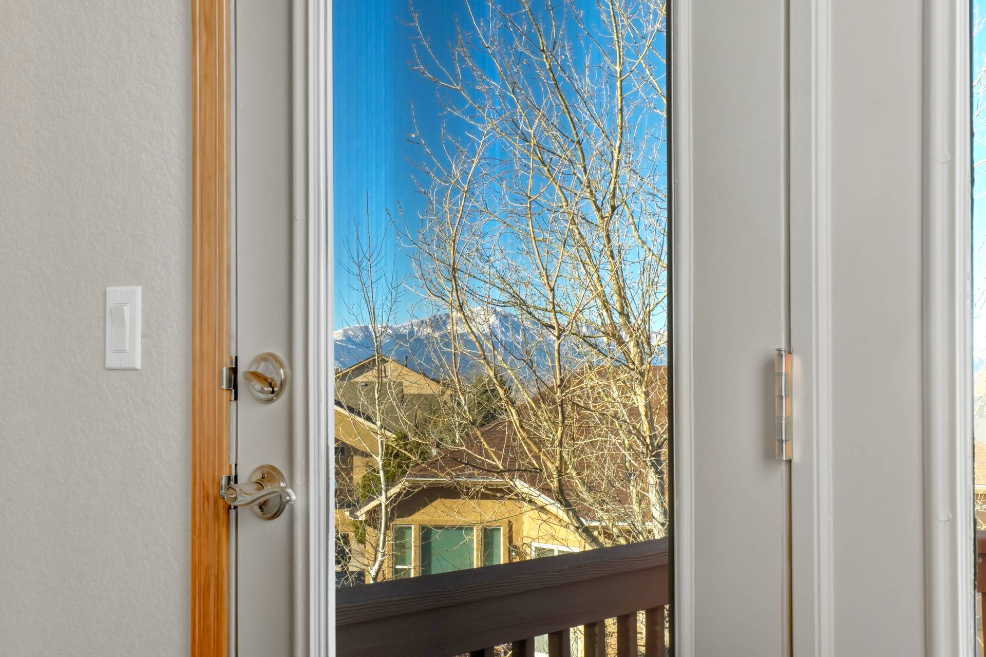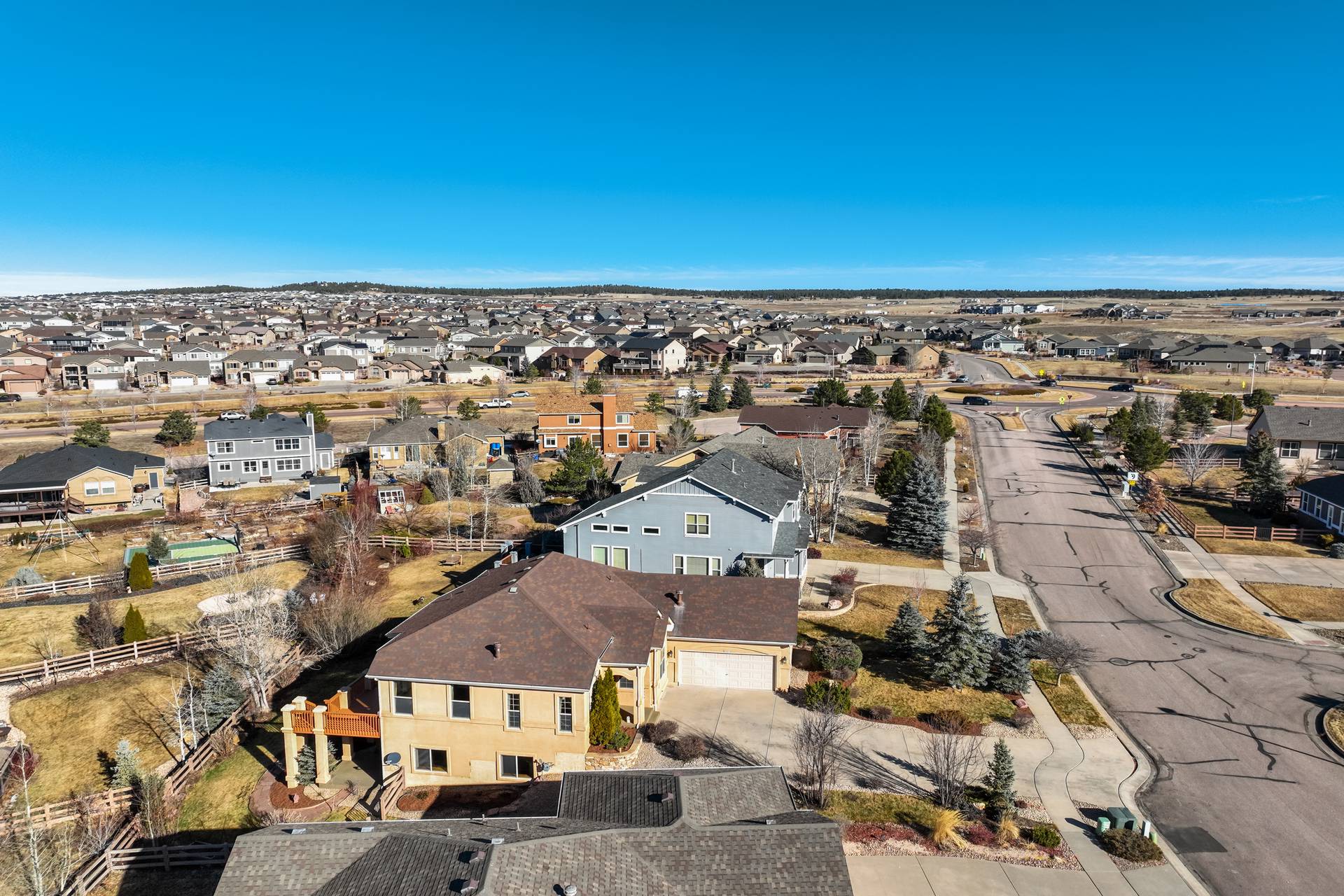Superb Pikes Peak VIEWS from this ranch floor plan with walkout basement! Home is open, bright and inviting with plenty of windows, high ceilings and LED lights throughout. Gleaming hardwood floors flow from the entry through the living room, hallway, dining room, family room and kitchen—freshly refinished January 2025. Plus, NEW carpet, NEW furnace and NEW air conditioner—January 2025. Views from Family Room, Kitchen, 15x10 Deck, Rec Room and Master Bedroom. Family Room and Dining Room share a see-through fireplace for a cozy home feel. The Living Room is a flex space, perfect for sitting room, office, formal living, play room, etc. Spacious rooms throughout the home, lots of kitchen cabinets and a nice-sized pantry. The huge L-shaped Rec Room features a second fireplace, walkout to 10x9 concrete patio and backyard, garden level windows and a large 14x9 wet bar area with tile countertops and tile floor. All the bedrooms are spacious, and three feature large walk-in closets. Master Bedroom with plenty of windows, walkout to private balcony, 7x8 cedar-lined walk-in closet, and adjoining 5-piece bath with tile floor, double vanity, soaking tub and separate shower. Recently freshened landscaping. Low-maintenance stucco siding. Additional features include modern-design wrought iron spindles, new (2025) smoke and CO detectors, sump pump and plenty of storage with storage room and large closets. Great location just one block from Wolf Ranch Dog Park and Recreation Center Swimming Pool (membership access with extra fee). Academy District 20 schools. Great property!