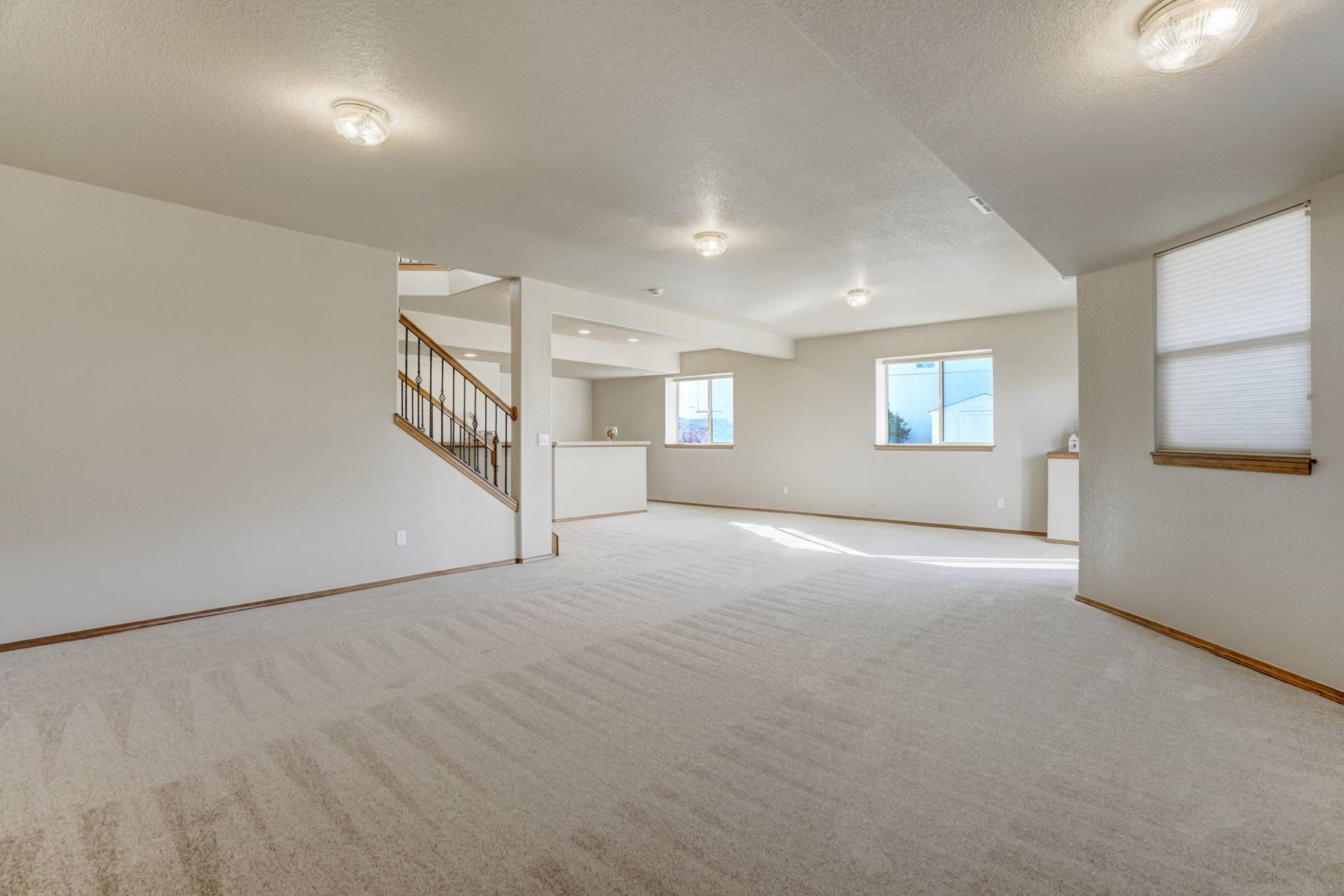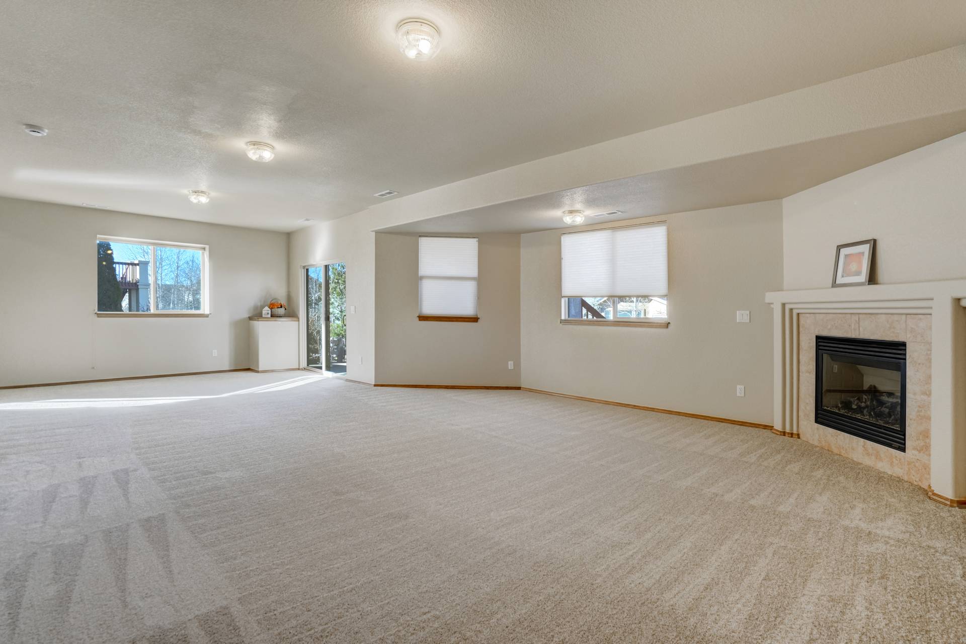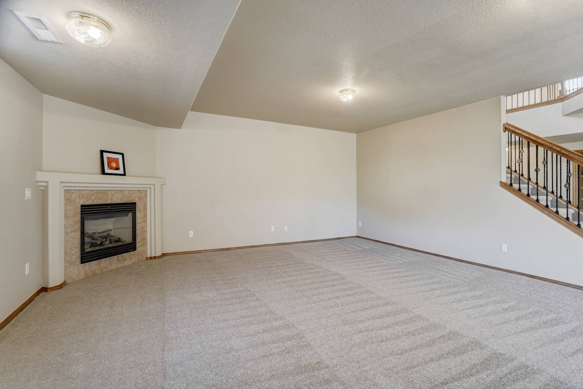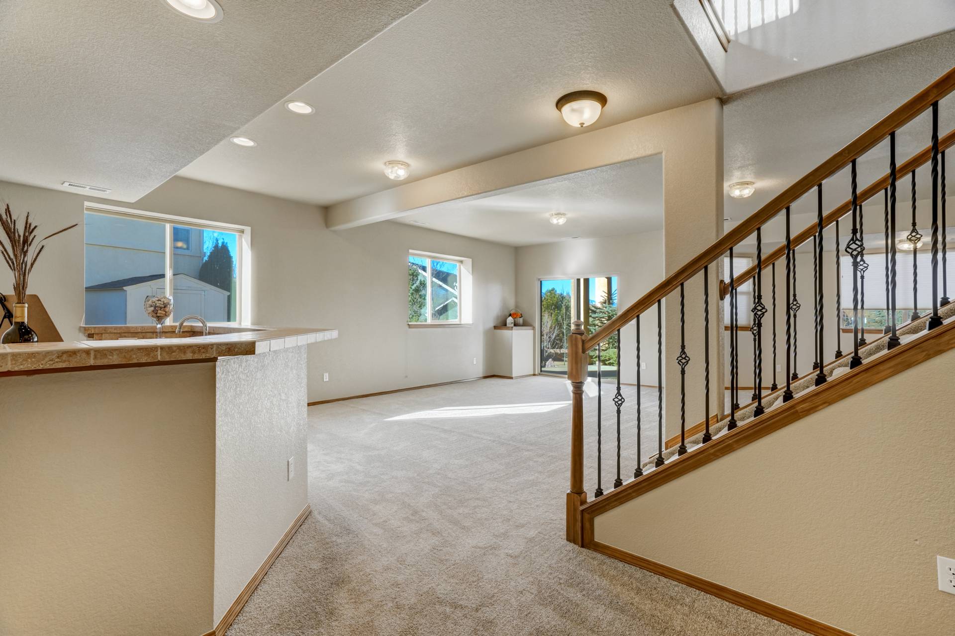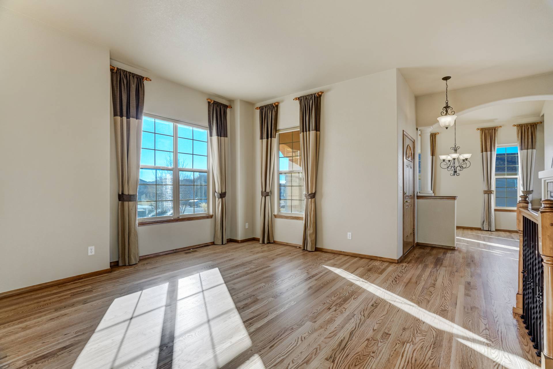 Superb Pikes Peak VIEWS from this ranch floor plan with walkout basement! Home is open, bright and inviting with plenty of windows, high ceilings and LED lights throughout. Gleaming hardwood floors flow from the entry through the living room, hallway, dining room, family room and kitchen—freshly refinished January 2025. Plus, NEW carpet, NEW furnace and NEW air conditioner—January 2025. Views from Family Room, Kitchen, 15x10 Deck, Rec Room and Master Bedroom. Family Room and Dining Room share a see-through fireplace for a cozy home feel. The Living Room is a flex space, perfect for sitting room, office, formal living, play room, etc. Spacious rooms throughout the home, lots of kitchen cabinets and a nice-sized pantry. The huge L-shaped Rec Room features a second fireplace, walkout to 10x9 concrete patio and backyard, garden level windows and a large 14x9 wet bar area with tile countertops and tile floor. All the bedrooms are spacious, and three feature large walk-in closets. Master Bedroom with plenty of windows, walkout to private balcony, 7x8 cedar-lined walk-in closet, and adjoining 5-piece bath with tile floor, double vanity, soaking tub and separate shower. Recently freshened landscaping. Low-maintenance stucco siding. Additional features include modern-design wrought iron spindles, new (2025) smoke and CO detectors, sump pump and plenty of storage with storage room and large closets. Great location just one block from Wolf Ranch Dog Park and Recreation Center Swimming Pool (membership access with extra fee). Academy District 20 schools. Great property!