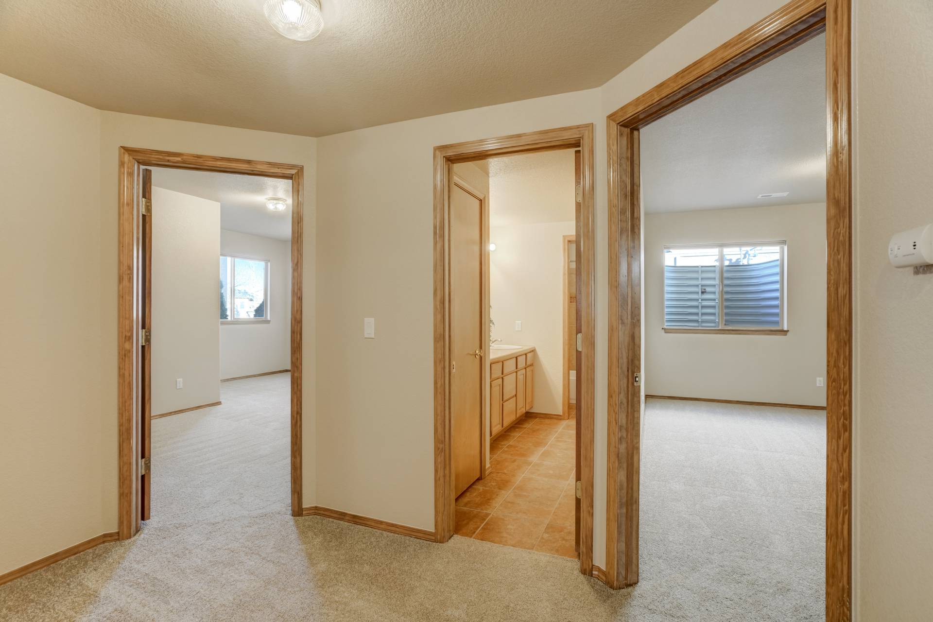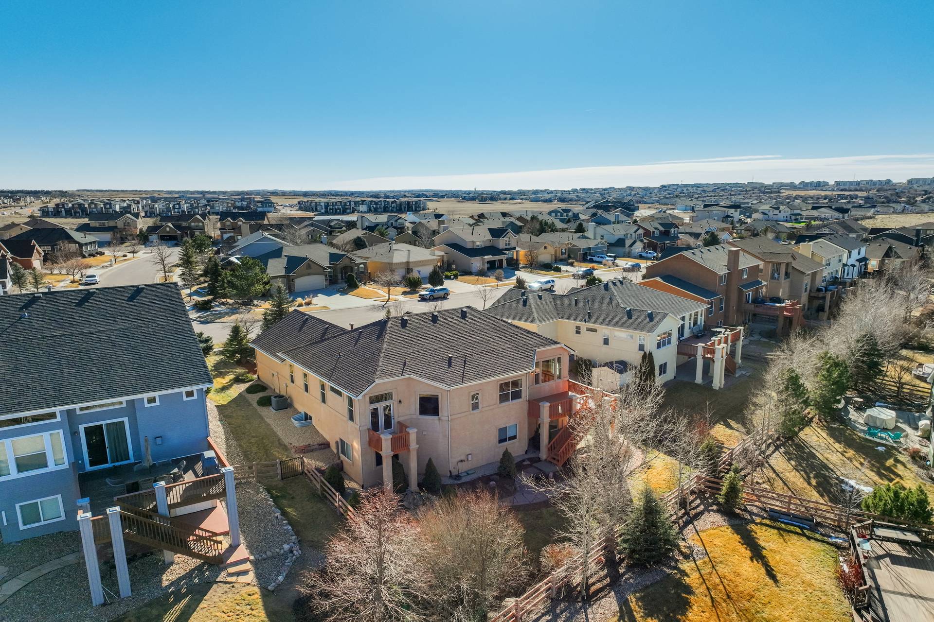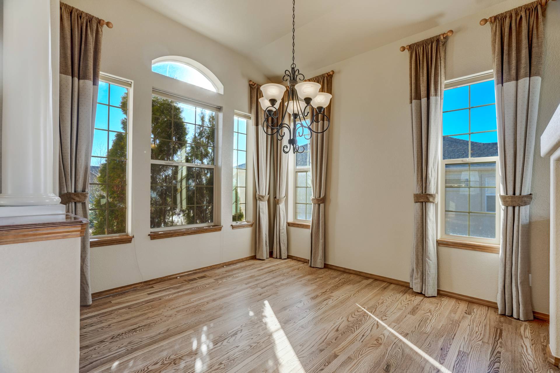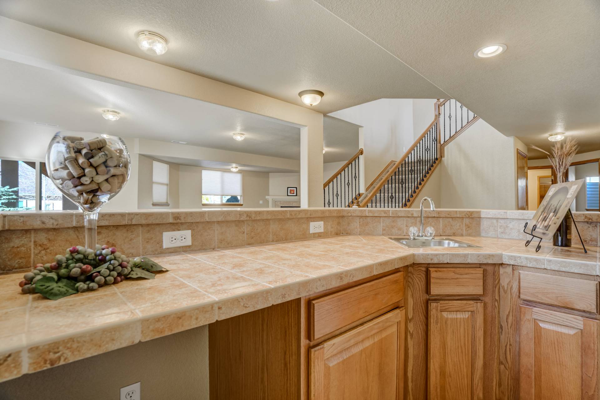 Superb Pikes Peak VIEWS from this ranch floor plan with walkout basement! Home is open, bright and inviting with plenty of windows, high ceilings and LED lights throughout. Gleaming hardwood floors flow from the entry through the living room, hallway, dining room, family room and kitchen—freshly refinished January 2025. Plus, NEW carpet, NEW furnace and NEW air conditioner—January 2025. Views from Family Room, Kitchen, 15x10 Deck, Rec Room and Master Bedroom. Family Room and Dining Room share a see-through fireplace for a cozy home feel. The Living Room is a flex space, perfect for sitting room, office, formal living, play room, etc. Spacious rooms throughout the home, lots of kitchen cabinets and a nice-sized pantry. The huge L-shaped Rec Room features a second fireplace, walkout to 10x9 concrete patio and backyard, garden level windows and a large 14x9 wet bar area with tile countertops and tile floor. All the bedrooms are spacious, and three feature large walk-in closets. Master Bedroom with plenty of windows, walkout to private balcony, 7x8 cedar-lined walk-in closet, and adjoining 5-piece bath with tile floor, double vanity, soaking tub and separate shower. Recently freshened landscaping. Low-maintenance stucco siding. Additional features include modern-design wrought iron spindles, new (2025) smoke and CO detectors, sump pump and plenty of storage with storage room and large closets. Great location just one block from Wolf Ranch Dog Park and Recreation Center Swimming Pool (membership access with extra fee). Academy District 20 schools. Great property!