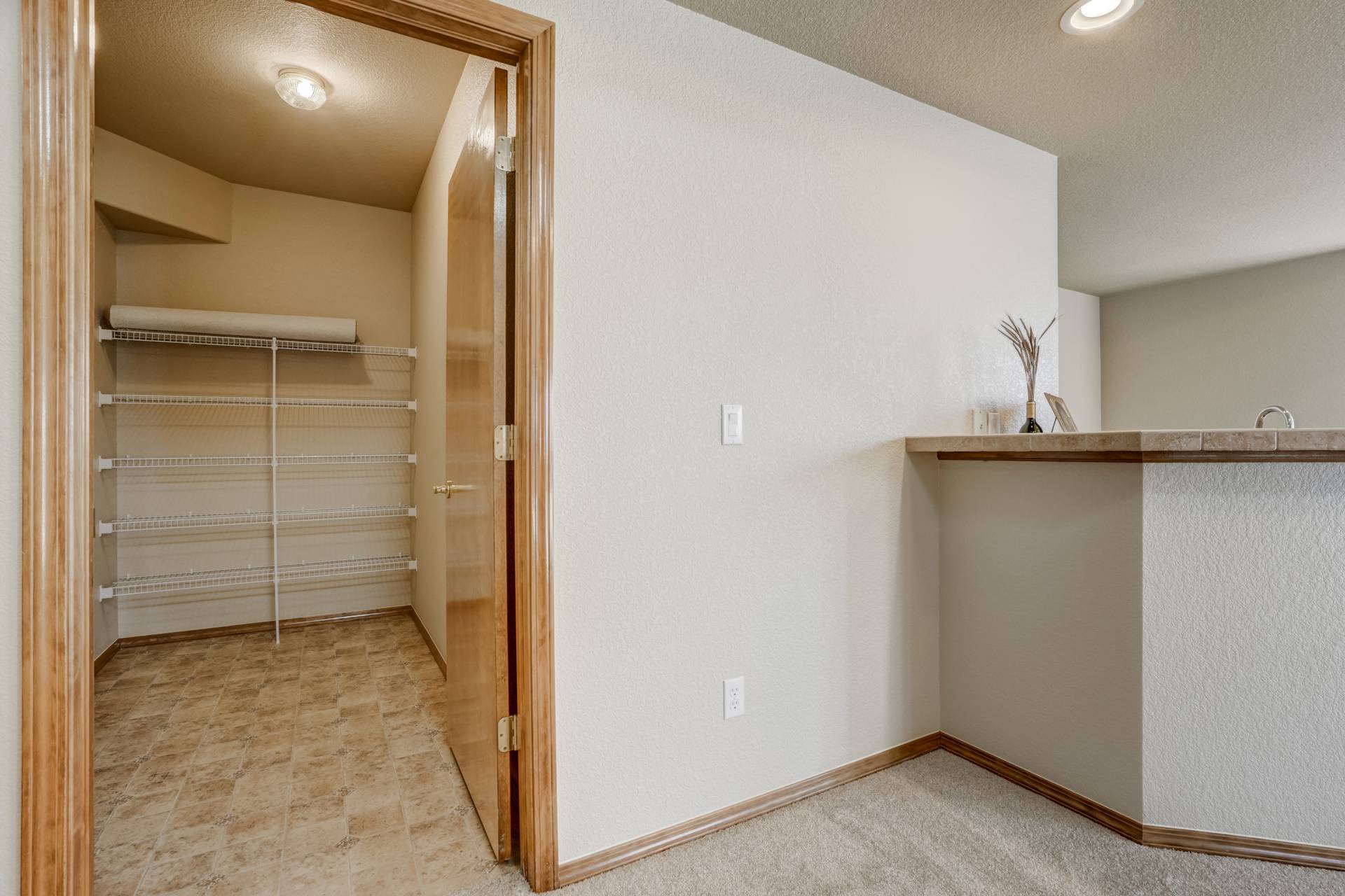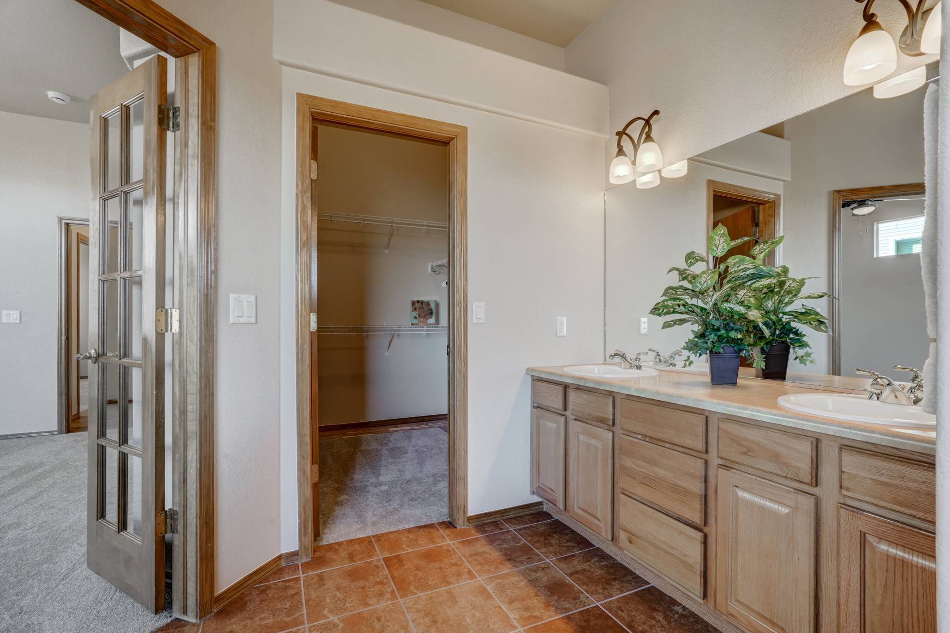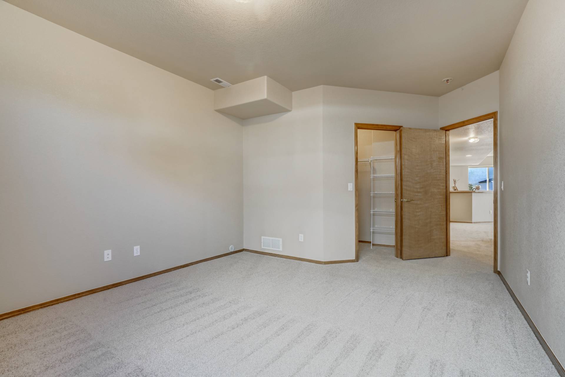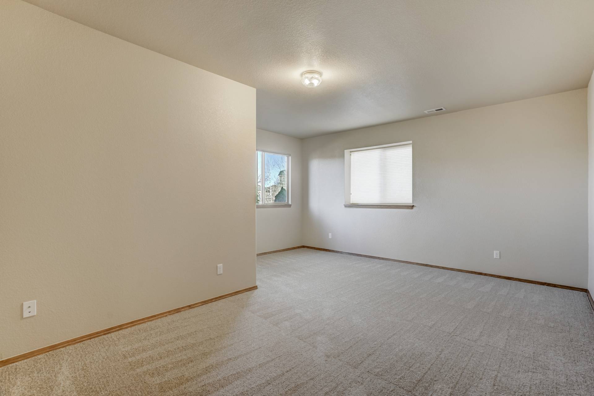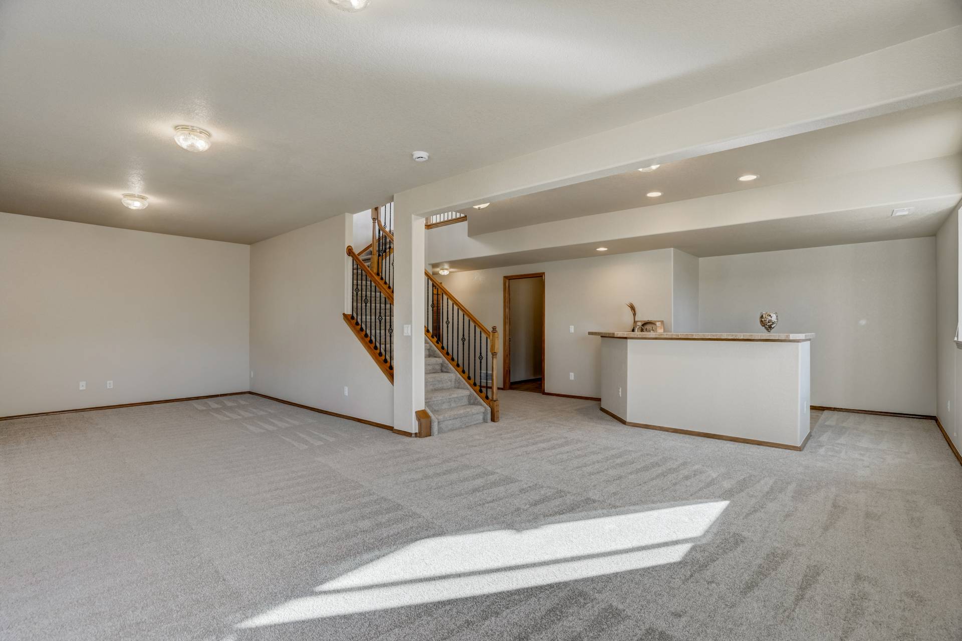 Superb Pikes Peak VIEWS from this ranch floor plan with walkout basement! Home is open, bright and inviting with plenty of windows, high ceilings and LED lights throughout. Gleaming hardwood floors flow from the entry through the living room, hallway, dining room, family room and kitchen—freshly refinished January 2025. Plus, NEW carpet, NEW furnace and NEW air conditioner—January 2025. Views from Family Room, Kitchen, 15x10 Deck, Rec Room and Master Bedroom. Family Room and Dining Room share a see-through fireplace for a cozy home feel. The Living Room is a flex space, perfect for sitting room, office, formal living, play room, etc. Spacious rooms throughout the home, lots of kitchen cabinets and a nice-sized pantry. The huge L-shaped Rec Room features a second fireplace, walkout to 10x9 concrete patio and backyard, garden level windows and a large 14x9 wet bar area with tile countertops and tile floor. All the bedrooms are spacious, and three feature large walk-in closets. Master Bedroom with plenty of windows, walkout to private balcony, 7x8 cedar-lined walk-in closet, and adjoining 5-piece bath with tile floor, double vanity, soaking tub and separate shower. Recently freshened landscaping. Low-maintenance stucco siding. Additional features include modern-design wrought iron spindles, new (2025) smoke and CO detectors, sump pump and plenty of storage with storage room and large closets. Great location just one block from Wolf Ranch Dog Park and Recreation Center Swimming Pool (membership access with extra fee). Academy District 20 schools. Great property!