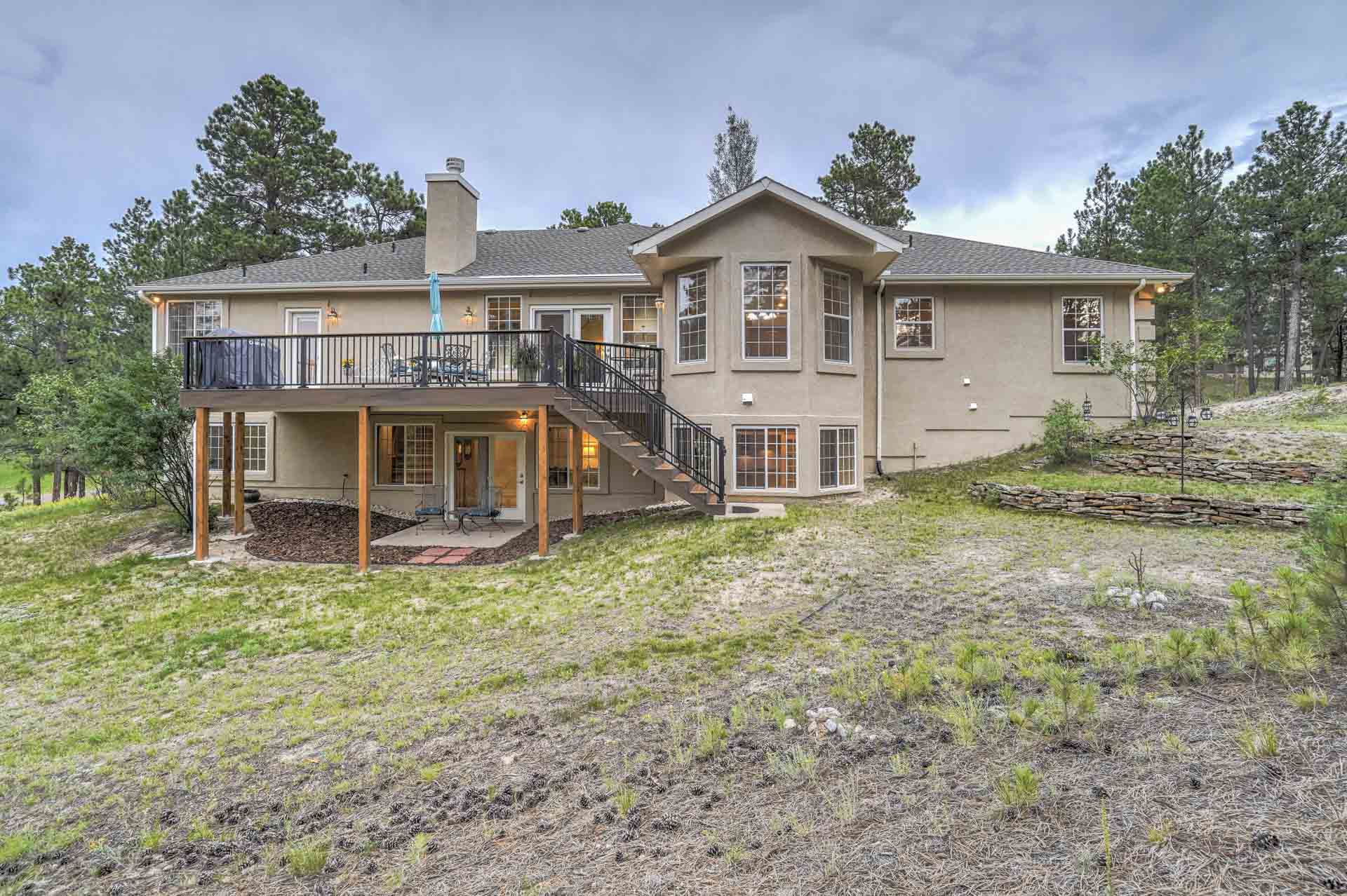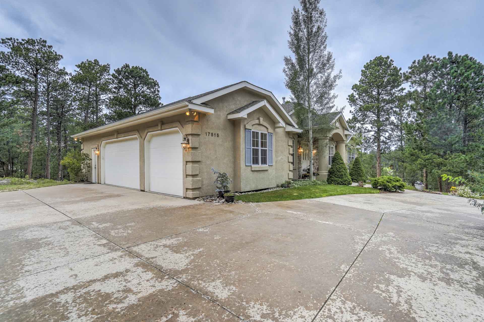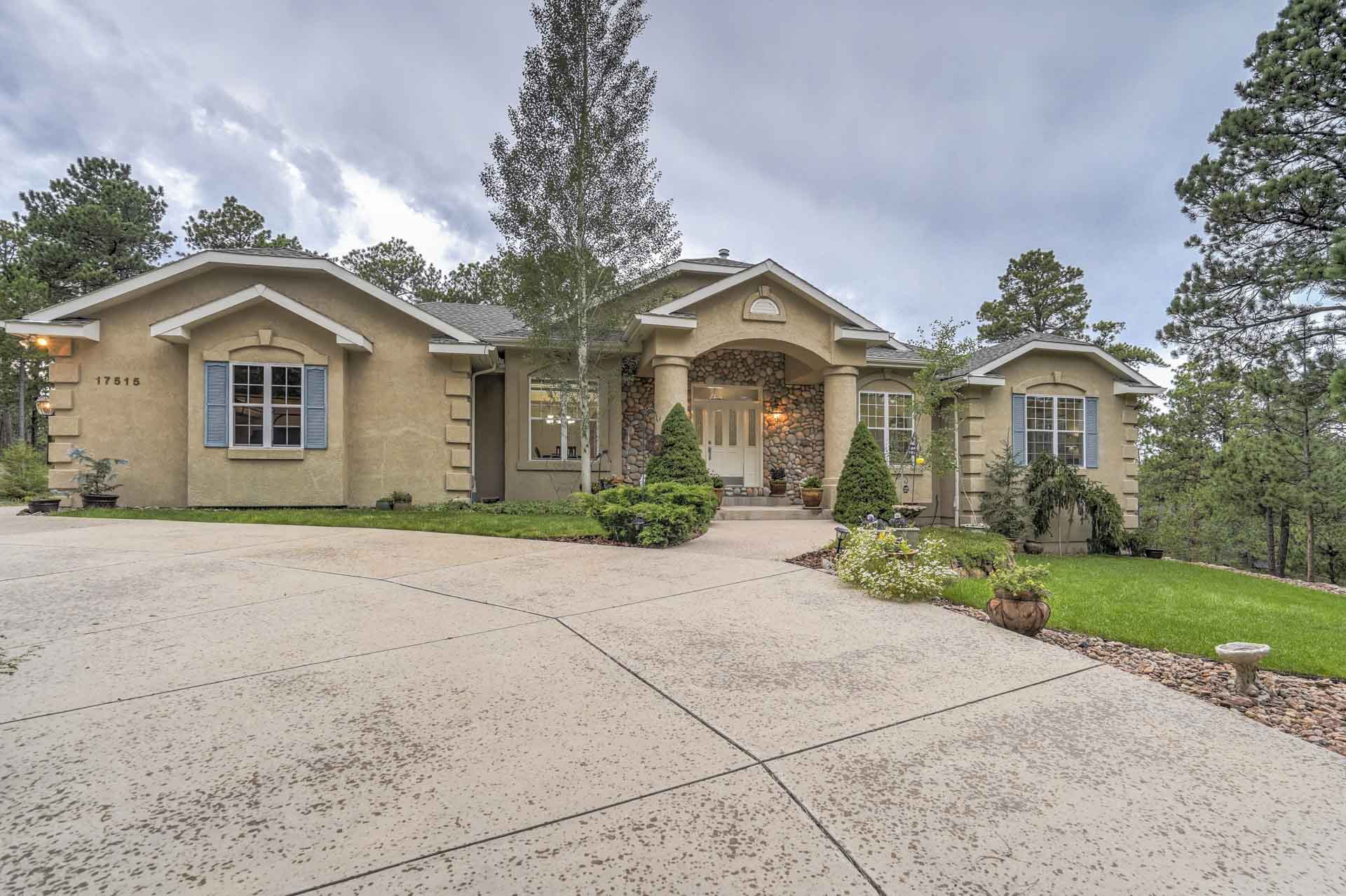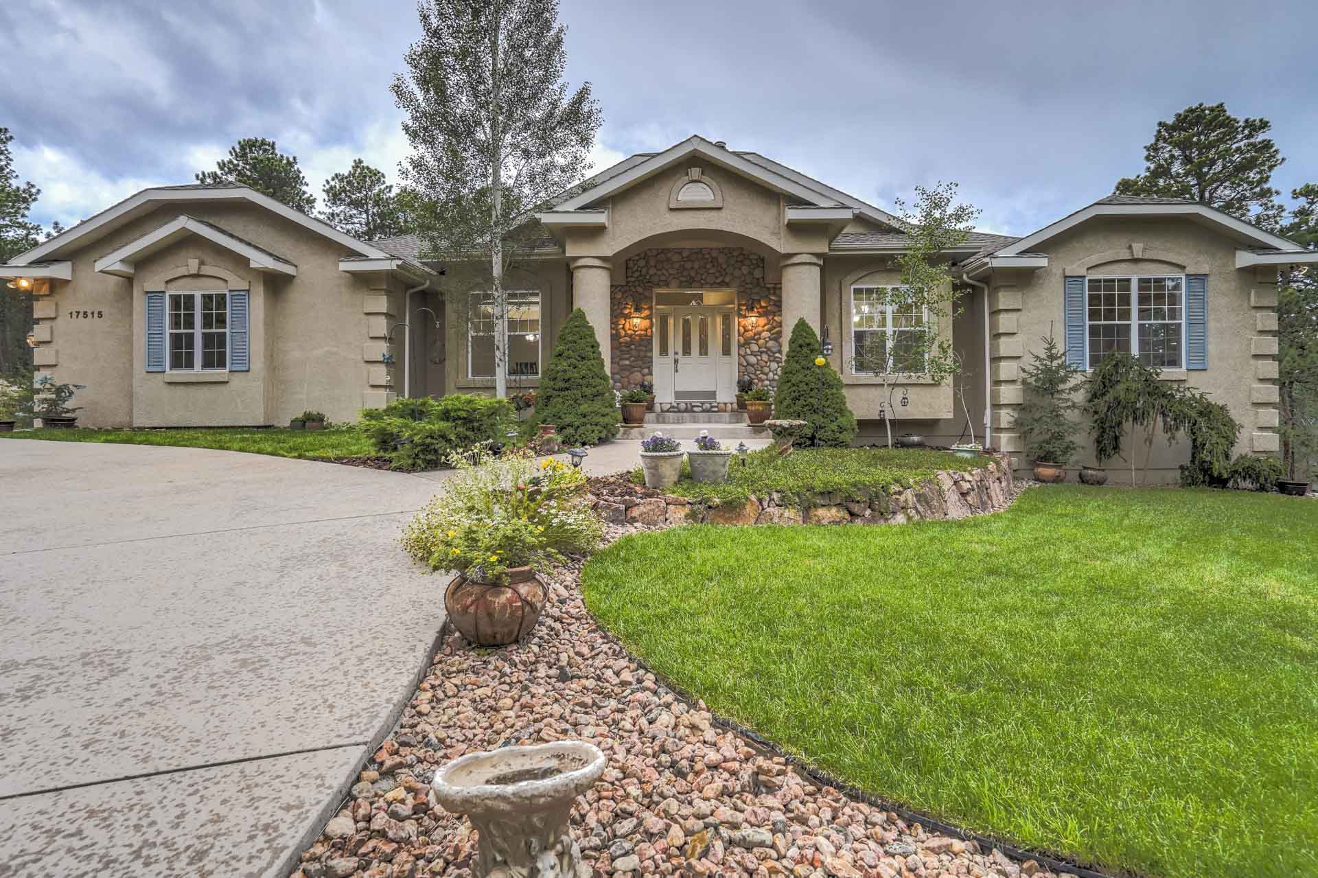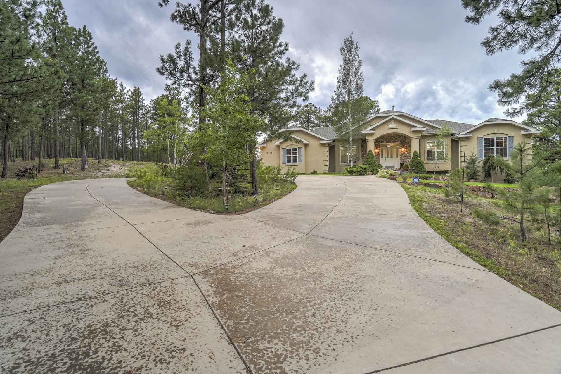 Stately updated rancher perfectly positioned on 2.5 acres with mature Ponderosa Pines in the sought after community of Higby Estates! Convenient Monument location with quick access to I-25, Highway 83 and the amenities of Monument and Northgate. Stucco pillars greet you as you arrive at the property. The acreage is treed, mitigated and offers great privacy, mountain views and serenity. Over 4,400 sq ft, 4 bedrooms, an office, 4 baths and a 3 car garage. Awesome outdoor entertaining space with a brand new composite and metal deck with built in lighting, stair lighting and great views. Newer AC unit. The home is filled with natural light, has vaulted ceilings, tons of large windows, three fireplaces and recently refinished hardwood floors and updated lighting throughout. Expansive and open great room with hardwood floors, wood burning fireplace w/ river rock surround, a walk-out to the back deck. Updated kitchen with maple cabinets, an island, slab granite counters, huge pantry, eat-in kitchen nook, hardwood floors, newer appliances and under cabinet lighting. Formal dining room w/ coffered ceilings, hardwood floors, chair rail and space for a large dining table. Main level primary suite with walk-in closet, gas fireplace, walk-out to the back deck and a 5 piece bath w/ jetted tub and double vanity. Main level office w/ french doors and built-in bookcases. Fully finished walk-out basement with a secondary primary suite w/ walk-in closet and private bath. The basement has three additional bedrooms, two full baths, a theater room and family room. The family room has a secondary kitchen area w/ beautiful maple cabinetry, wine rack, slab granite counters, marble backsplash, under cabinet lighting, full size refrigerator and 2 burner cook-top. The family room also features a gas fireplace and walks out to the backyard with a covered seating area with built-in LED lighting above. Circular concrete driveway with tons of parking available. Award winning School District 38.