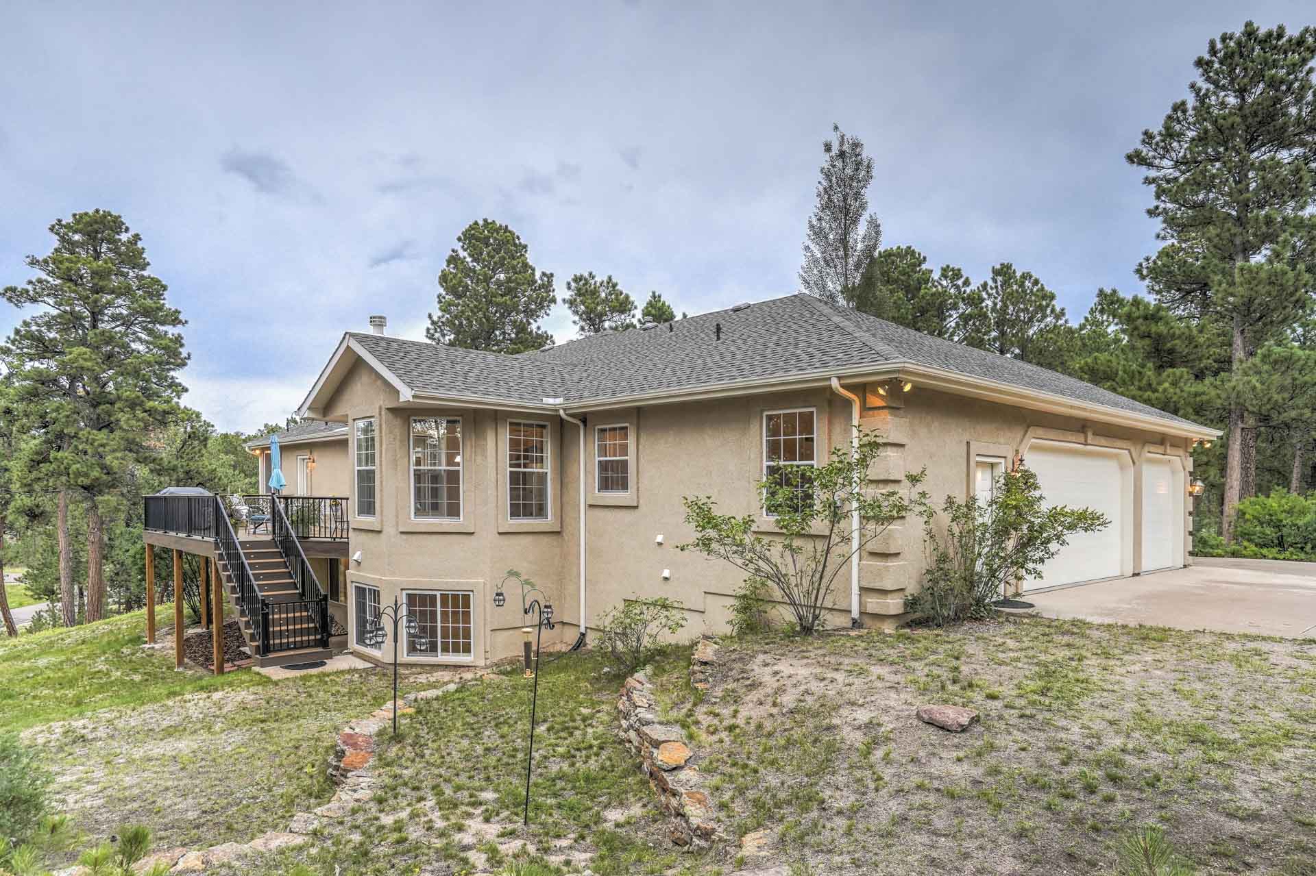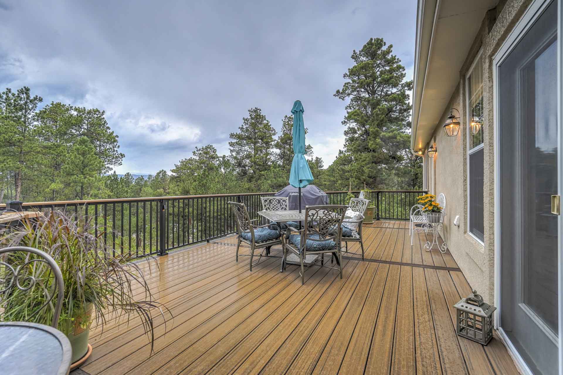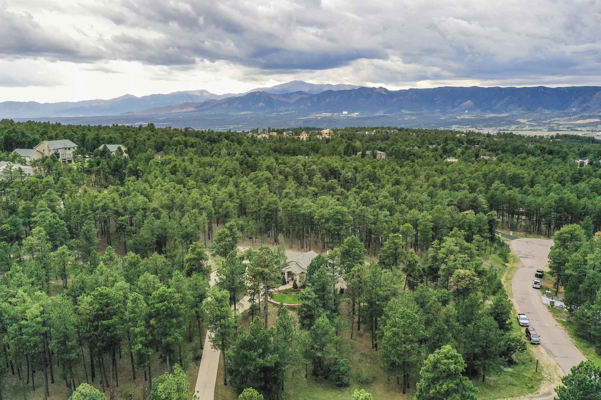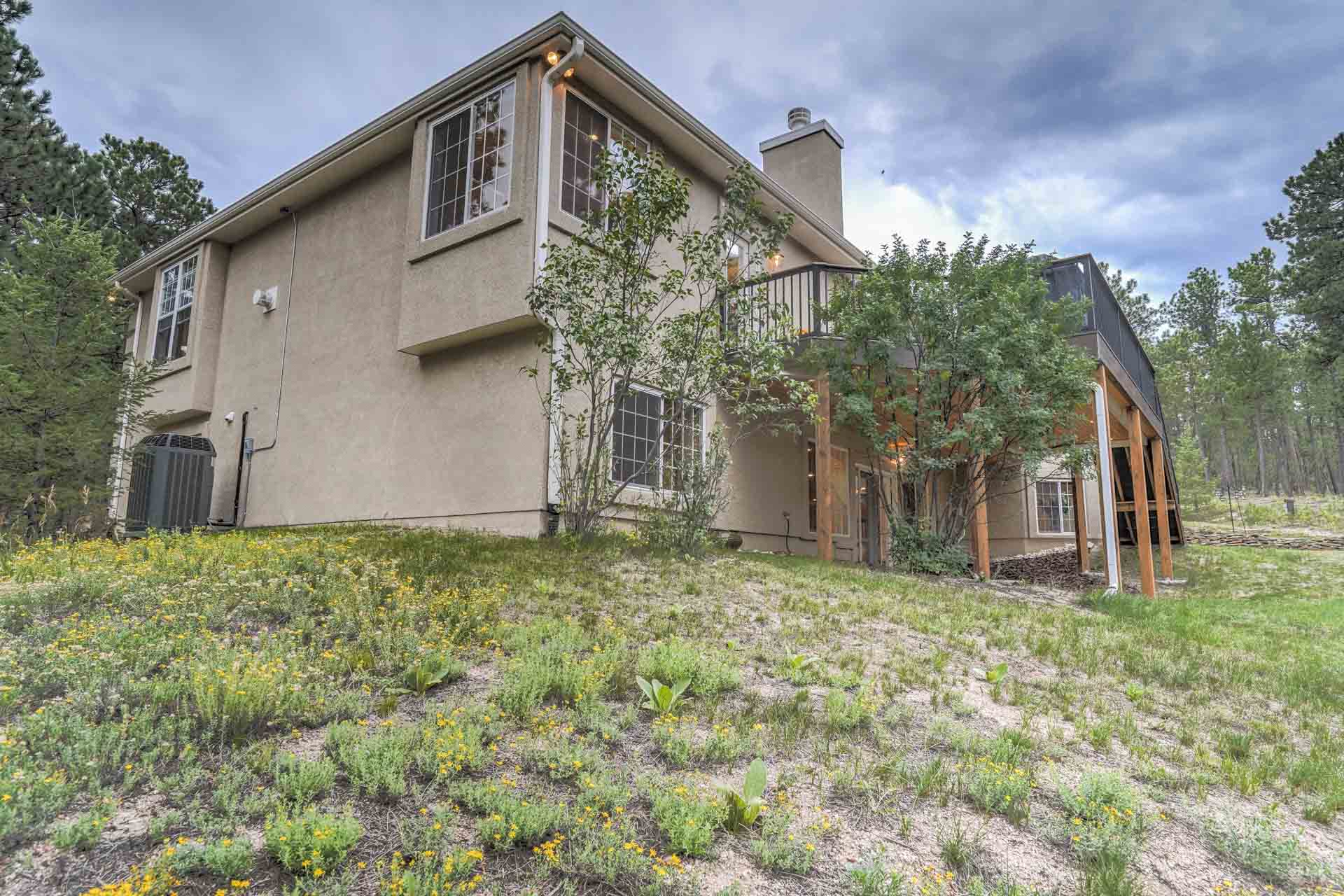 Stately updated rancher perfectly positioned on 2.5 acres with mature Ponderosa Pines in the sought after community of Higby Estates! Convenient Monument location with quick access to I-25, Highway 83 and the amenities of Monument and Northgate. Stucco pillars greet you as you arrive at the property. The acreage is treed, mitigated and offers great privacy, mountain views and serenity. Over 4,400 sq ft, 4 bedrooms, an office, 4 baths and a 3 car garage. Awesome outdoor entertaining space with a brand new composite and metal deck with built in lighting, stair lighting and great views. Newer AC unit. The home is filled with natural light, has vaulted ceilings, tons of large windows, three fireplaces and recently refinished hardwood floors and updated lighting throughout. Expansive and open great room with hardwood floors, wood burning fireplace w/ river rock surround, a walk-out to the back deck. Updated kitchen with maple cabinets, an island, slab granite counters, huge pantry, eat-in kitchen nook, hardwood floors, newer appliances and under cabinet lighting. Formal dining room w/ coffered ceilings, hardwood floors, chair rail and space for a large dining table. Main level primary suite with walk-in closet, gas fireplace, walk-out to the back deck and a 5 piece bath w/ jetted tub and double vanity. Main level office w/ french doors and built-in bookcases. Fully finished walk-out basement with a secondary primary suite w/ walk-in closet and private bath. The basement has three additional bedrooms, two full baths, a theater room and family room. The family room has a secondary kitchen area w/ beautiful maple cabinetry, wine rack, slab granite counters, marble backsplash, under cabinet lighting, full size refrigerator and 2 burner cook-top. The family room also features a gas fireplace and walks out to the backyard with a covered seating area with built-in LED lighting above. Circular concrete driveway with tons of parking available. Award winning School District 38.