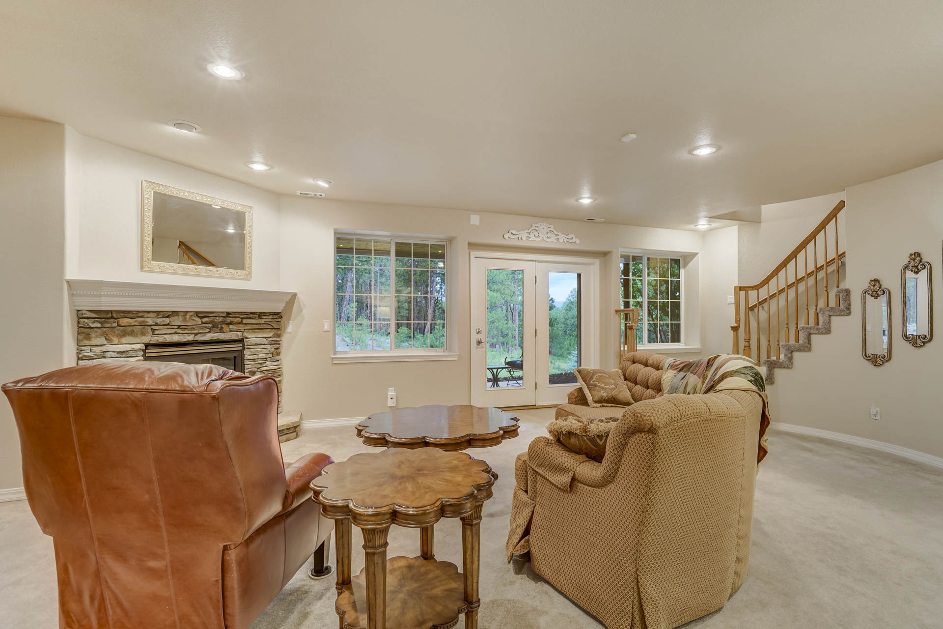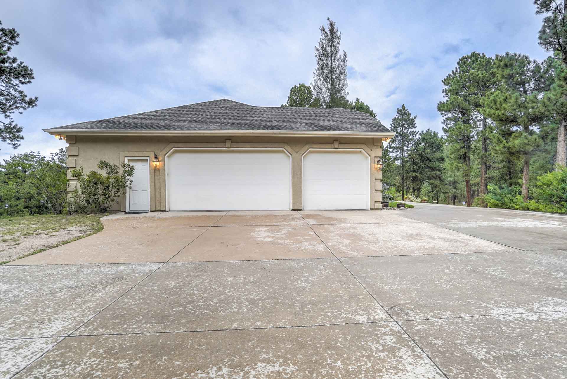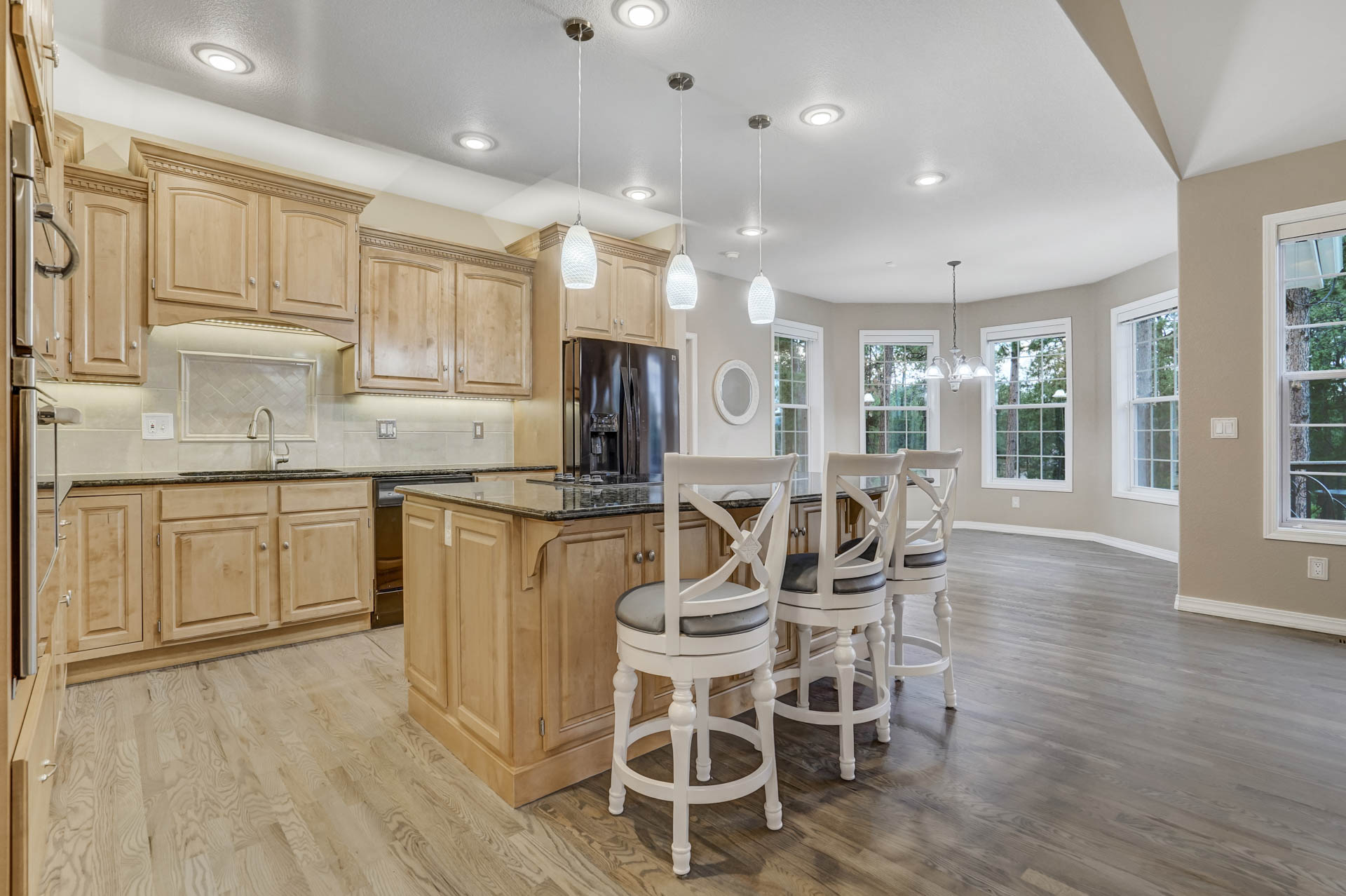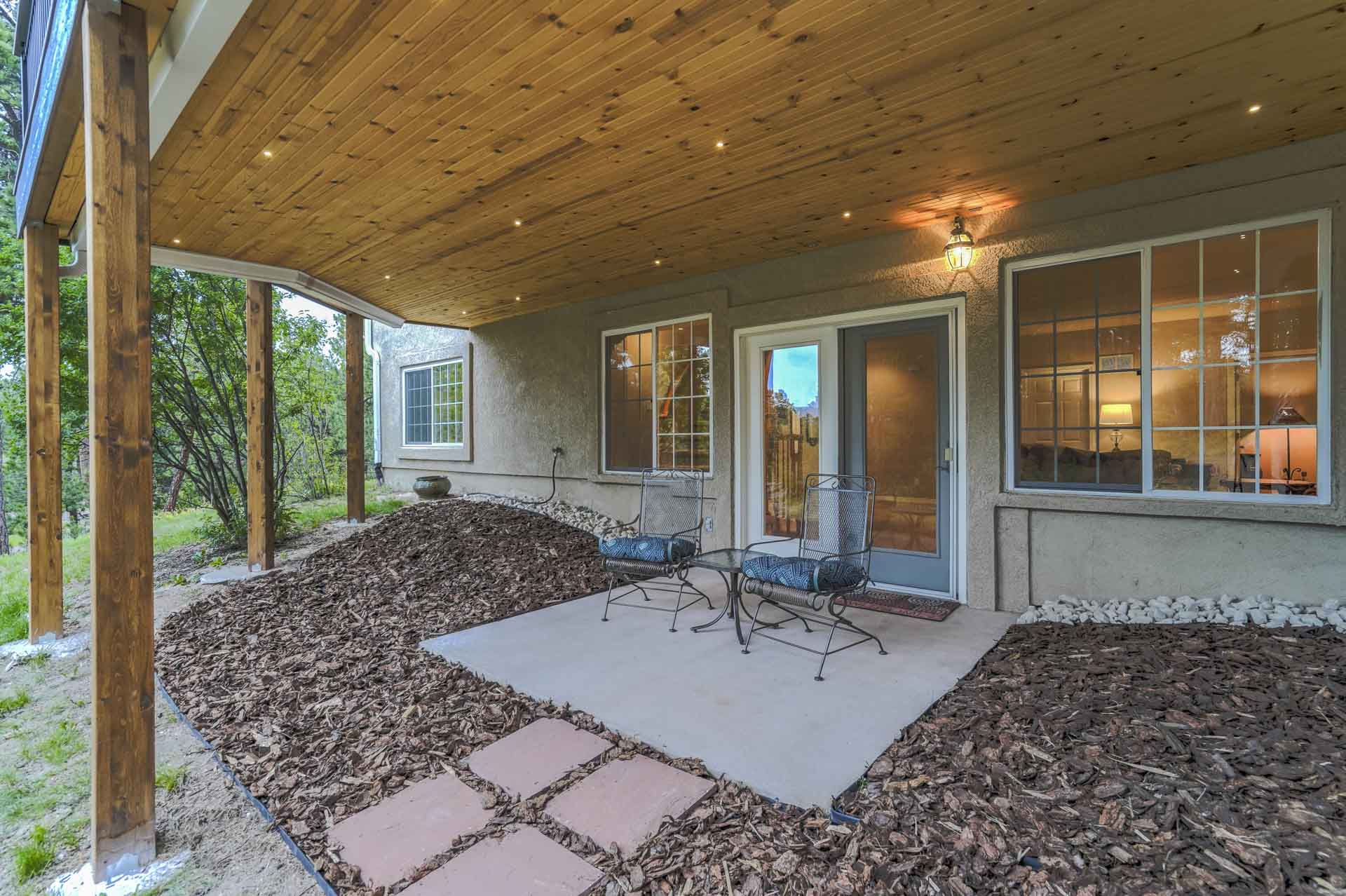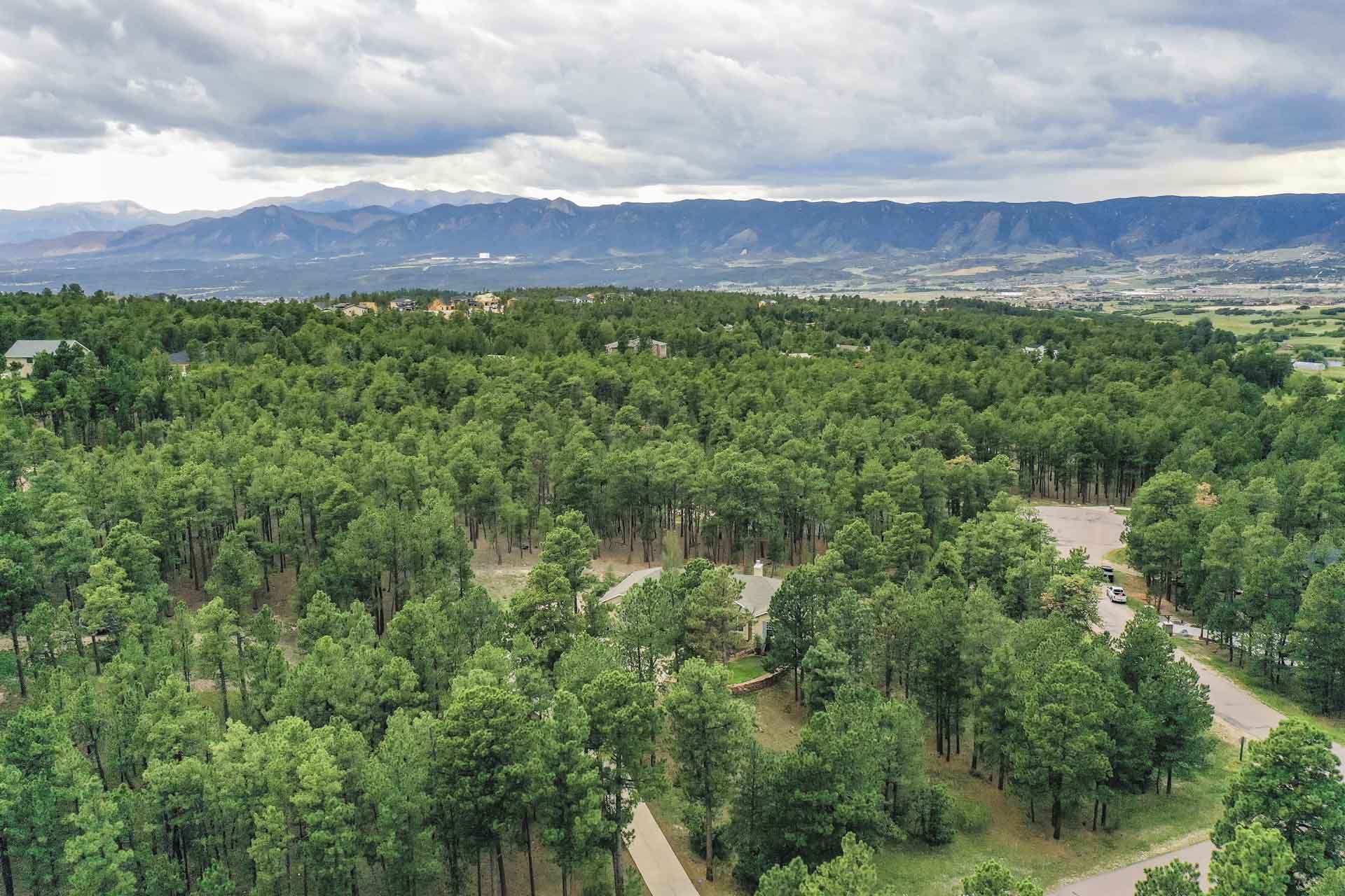 Stately updated rancher perfectly positioned on 2.5 acres with mature Ponderosa Pines in the sought after community of Higby Estates! Convenient Monument location with quick access to I-25, Highway 83 and the amenities of Monument and Northgate. Stucco pillars greet you as you arrive at the property. The acreage is treed, mitigated and offers great privacy, mountain views and serenity. Over 4,400 sq ft, 4 bedrooms, an office, 4 baths and a 3 car garage. Awesome outdoor entertaining space with a brand new composite and metal deck with built in lighting, stair lighting and great views. Newer AC unit. The home is filled with natural light, has vaulted ceilings, tons of large windows, three fireplaces and recently refinished hardwood floors and updated lighting throughout. Expansive and open great room with hardwood floors, wood burning fireplace w/ river rock surround, a walk-out to the back deck. Updated kitchen with maple cabinets, an island, slab granite counters, huge pantry, eat-in kitchen nook, hardwood floors, newer appliances and under cabinet lighting. Formal dining room w/ coffered ceilings, hardwood floors, chair rail and space for a large dining table. Main level primary suite with walk-in closet, gas fireplace, walk-out to the back deck and a 5 piece bath w/ jetted tub and double vanity. Main level office w/ french doors and built-in bookcases. Fully finished walk-out basement with a secondary primary suite w/ walk-in closet and private bath. The basement has three additional bedrooms, two full baths, a theater room and family room. The family room has a secondary kitchen area w/ beautiful maple cabinetry, wine rack, slab granite counters, marble backsplash, under cabinet lighting, full size refrigerator and 2 burner cook-top. The family room also features a gas fireplace and walks out to the backyard with a covered seating area with built-in LED lighting above. Circular concrete driveway with tons of parking available. Award winning School District 38.