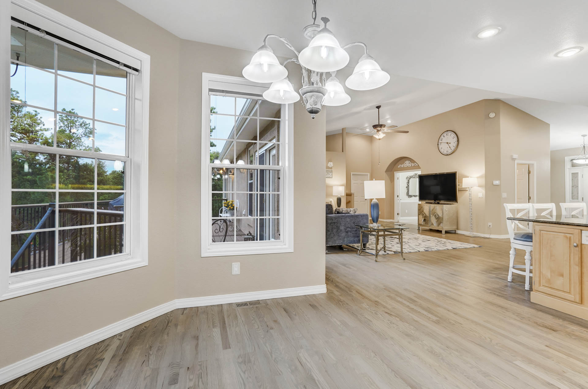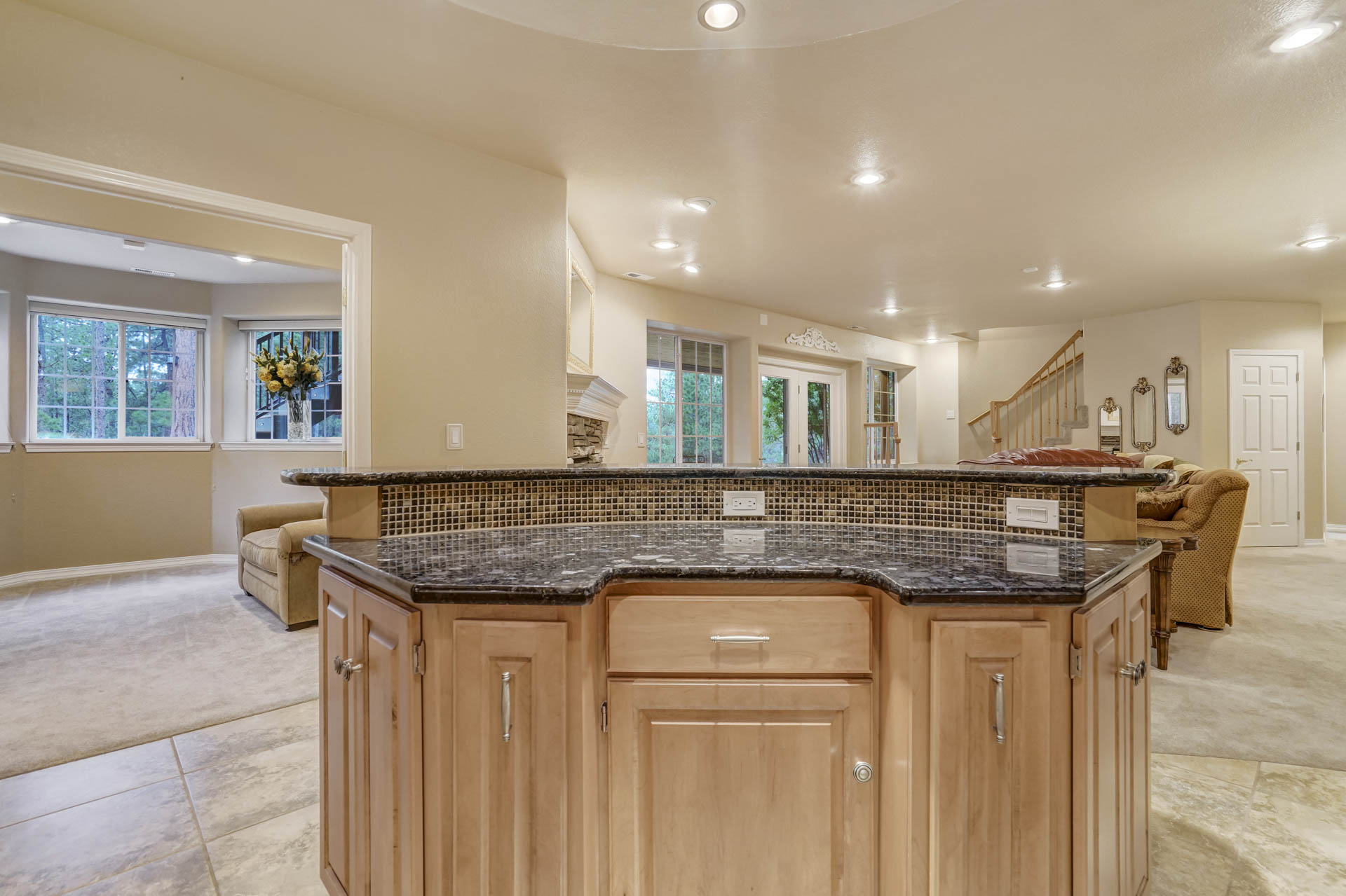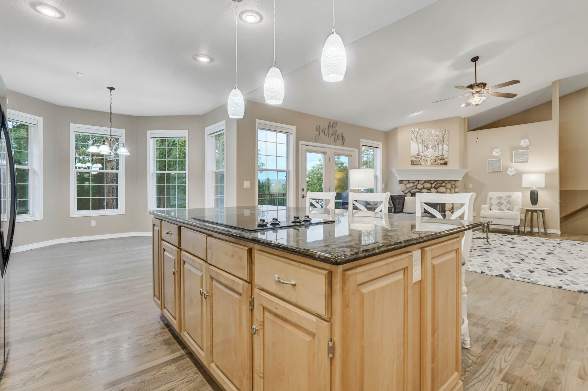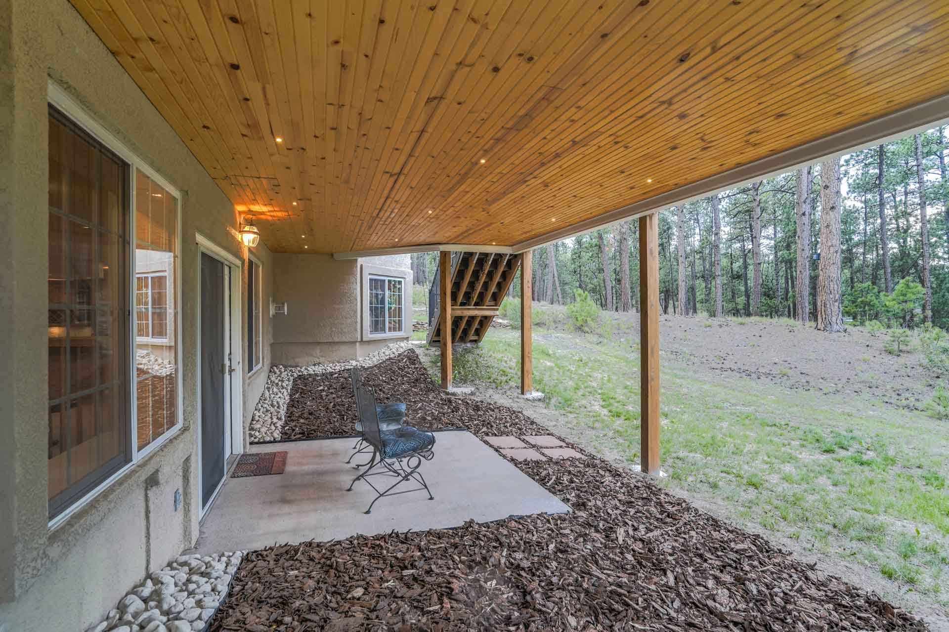 Stately updated rancher perfectly positioned on 2.5 acres with mature Ponderosa Pines in the sought after community of Higby Estates! Convenient Monument location with quick access to I-25, Highway 83 and the amenities of Monument and Northgate. Stucco pillars greet you as you arrive at the property. The acreage is treed, mitigated and offers great privacy, mountain views and serenity. Over 4,400 sq ft, 4 bedrooms, an office, 4 baths and a 3 car garage. Awesome outdoor entertaining space with a brand new composite and metal deck with built in lighting, stair lighting and great views. Newer AC unit. The home is filled with natural light, has vaulted ceilings, tons of large windows, three fireplaces and recently refinished hardwood floors and updated lighting throughout. Expansive and open great room with hardwood floors, wood burning fireplace w/ river rock surround, a walk-out to the back deck. Updated kitchen with maple cabinets, an island, slab granite counters, huge pantry, eat-in kitchen nook, hardwood floors, newer appliances and under cabinet lighting. Formal dining room w/ coffered ceilings, hardwood floors, chair rail and space for a large dining table. Main level primary suite with walk-in closet, gas fireplace, walk-out to the back deck and a 5 piece bath w/ jetted tub and double vanity. Main level office w/ french doors and built-in bookcases. Fully finished walk-out basement with a secondary primary suite w/ walk-in closet and private bath. The basement has three additional bedrooms, two full baths, a theater room and family room. The family room has a secondary kitchen area w/ beautiful maple cabinetry, wine rack, slab granite counters, marble backsplash, under cabinet lighting, full size refrigerator and 2 burner cook-top. The family room also features a gas fireplace and walks out to the backyard with a covered seating area with built-in LED lighting above. Circular concrete driveway with tons of parking available. Award winning School District 38.
