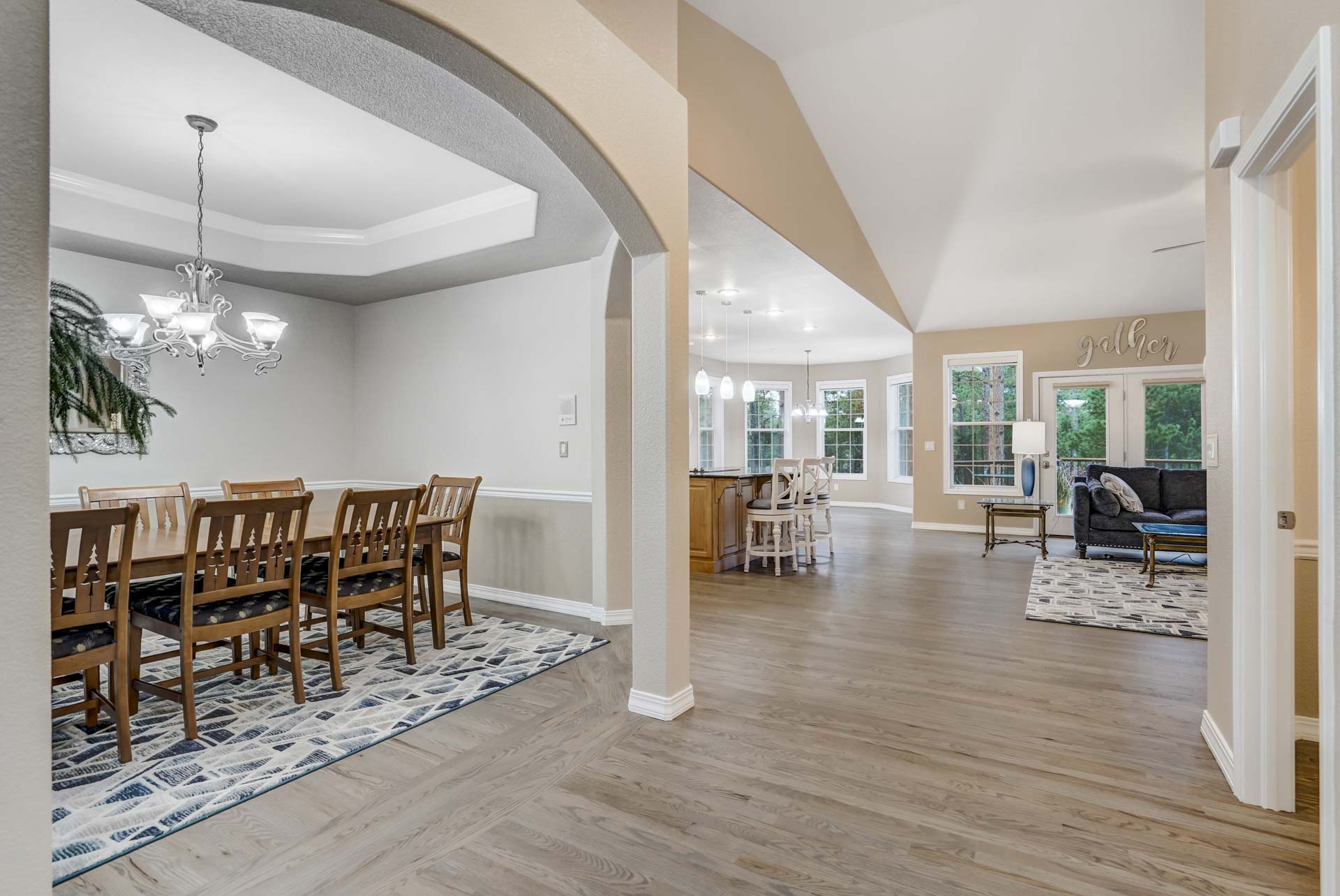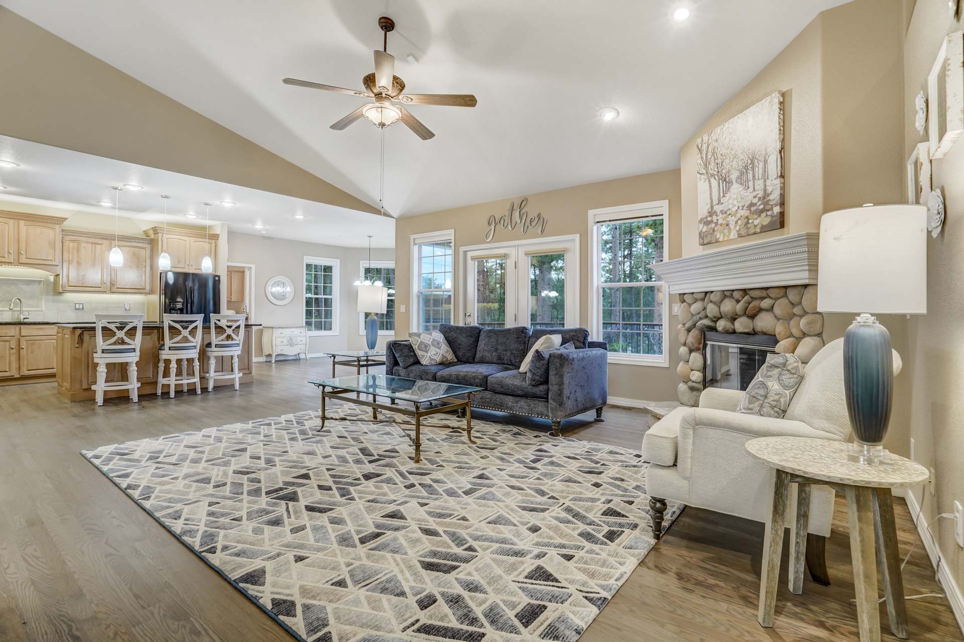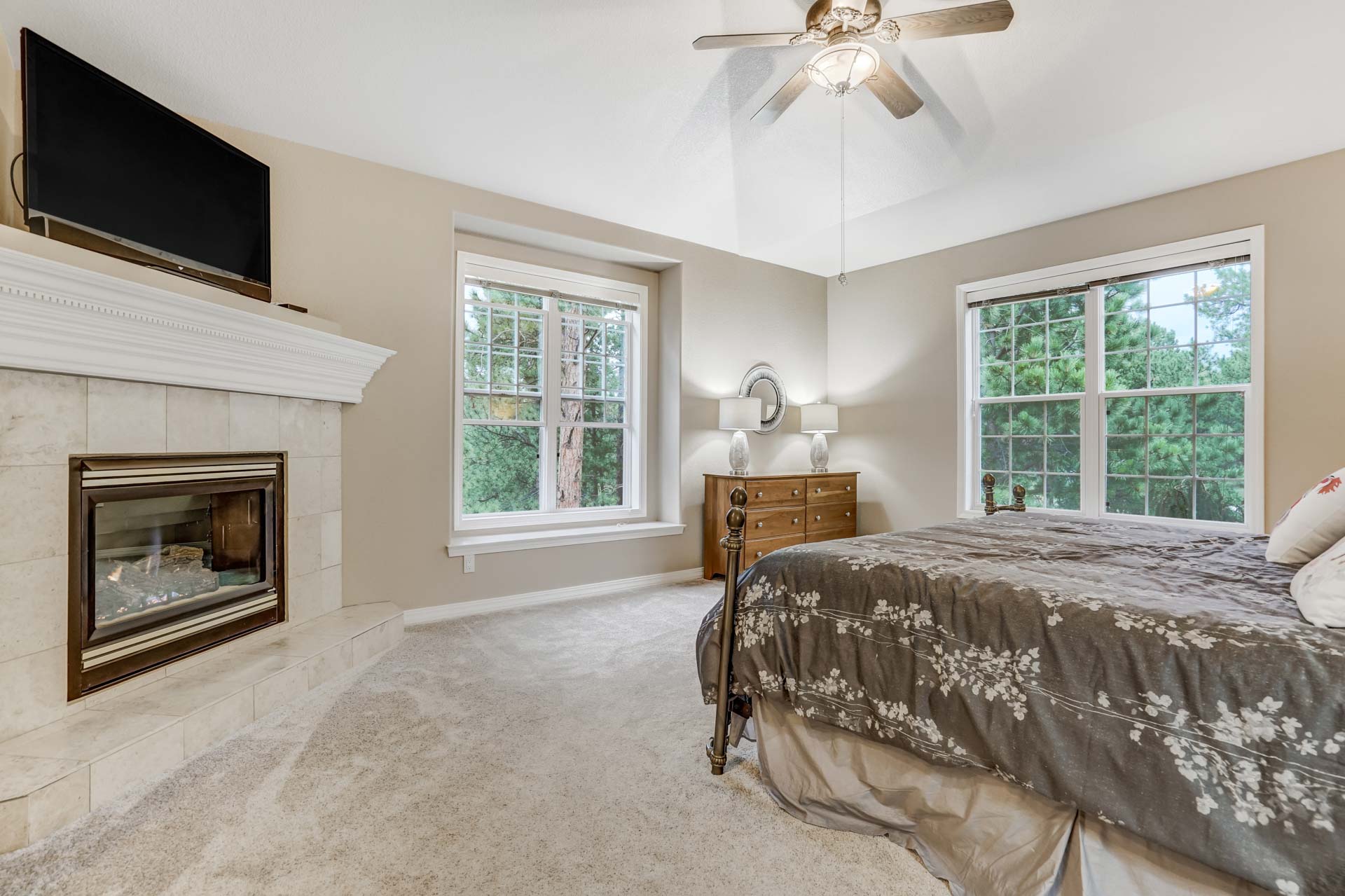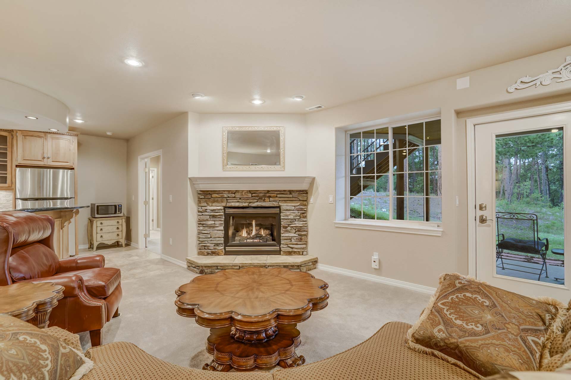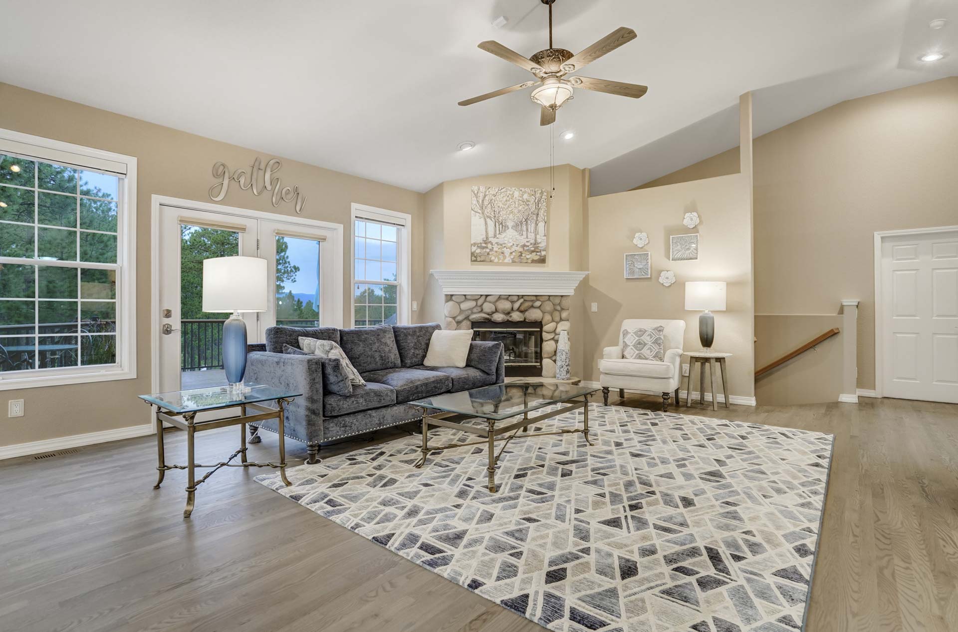 Stately updated rancher perfectly positioned on 2.5 acres with mature Ponderosa Pines in the sought after community of Higby Estates! Convenient Monument location with quick access to I-25, Highway 83 and the amenities of Monument and Northgate. Stucco pillars greet you as you arrive at the property. The acreage is treed, mitigated and offers great privacy, mountain views and serenity. Over 4,400 sq ft, 4 bedrooms, an office, 4 baths and a 3 car garage. Awesome outdoor entertaining space with a brand new composite and metal deck with built in lighting, stair lighting and great views. Newer AC unit. The home is filled with natural light, has vaulted ceilings, tons of large windows, three fireplaces and recently refinished hardwood floors and updated lighting throughout. Expansive and open great room with hardwood floors, wood burning fireplace w/ river rock surround, a walk-out to the back deck. Updated kitchen with maple cabinets, an island, slab granite counters, huge pantry, eat-in kitchen nook, hardwood floors, newer appliances and under cabinet lighting. Formal dining room w/ coffered ceilings, hardwood floors, chair rail and space for a large dining table. Main level primary suite with walk-in closet, gas fireplace, walk-out to the back deck and a 5 piece bath w/ jetted tub and double vanity. Main level office w/ french doors and built-in bookcases. Fully finished walk-out basement with a secondary primary suite w/ walk-in closet and private bath. The basement has three additional bedrooms, two full baths, a theater room and family room. The family room has a secondary kitchen area w/ beautiful maple cabinetry, wine rack, slab granite counters, marble backsplash, under cabinet lighting, full size refrigerator and 2 burner cook-top. The family room also features a gas fireplace and walks out to the backyard with a covered seating area with built-in LED lighting above. Circular concrete driveway with tons of parking available. Award winning School District 38.